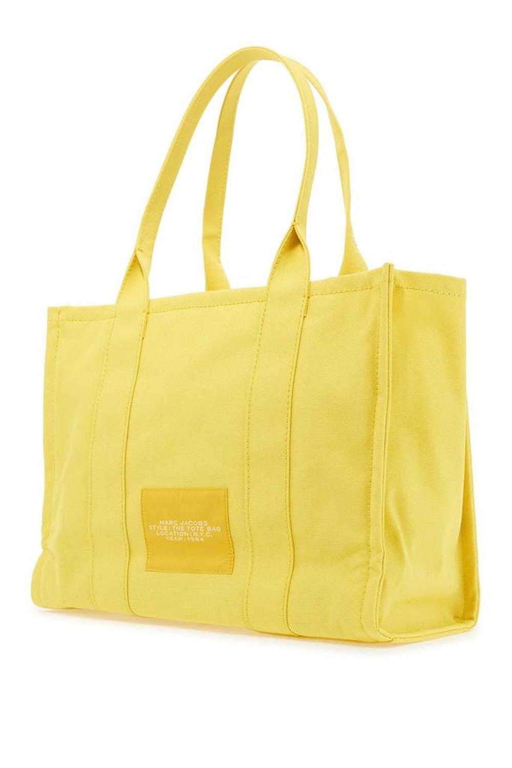 • The Canvas Large Tote Bag by Marc Jacobs is made of cotton canvas with double handles that can be worn by hand or on the shoulder. The contrasting logo is printed on the front, and a patch with the logo is applied on the back. It has a top zip closure and a side handle. The interior is unlined and features one zip pocket and two small pockets.