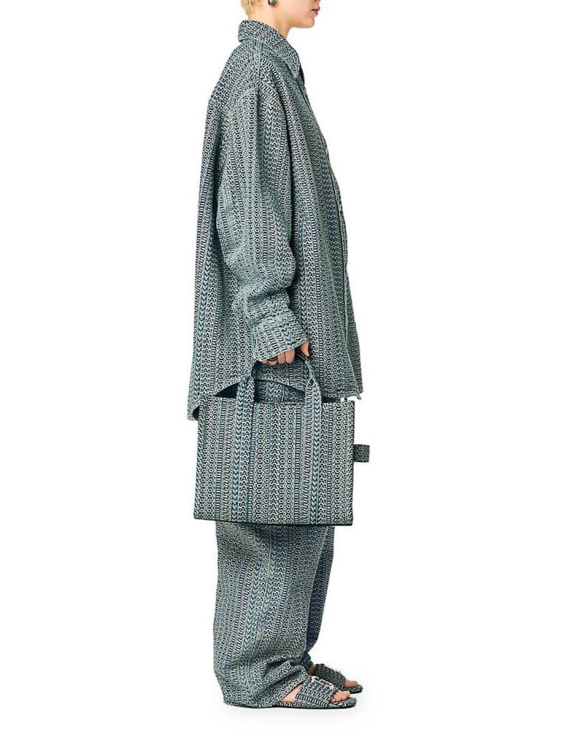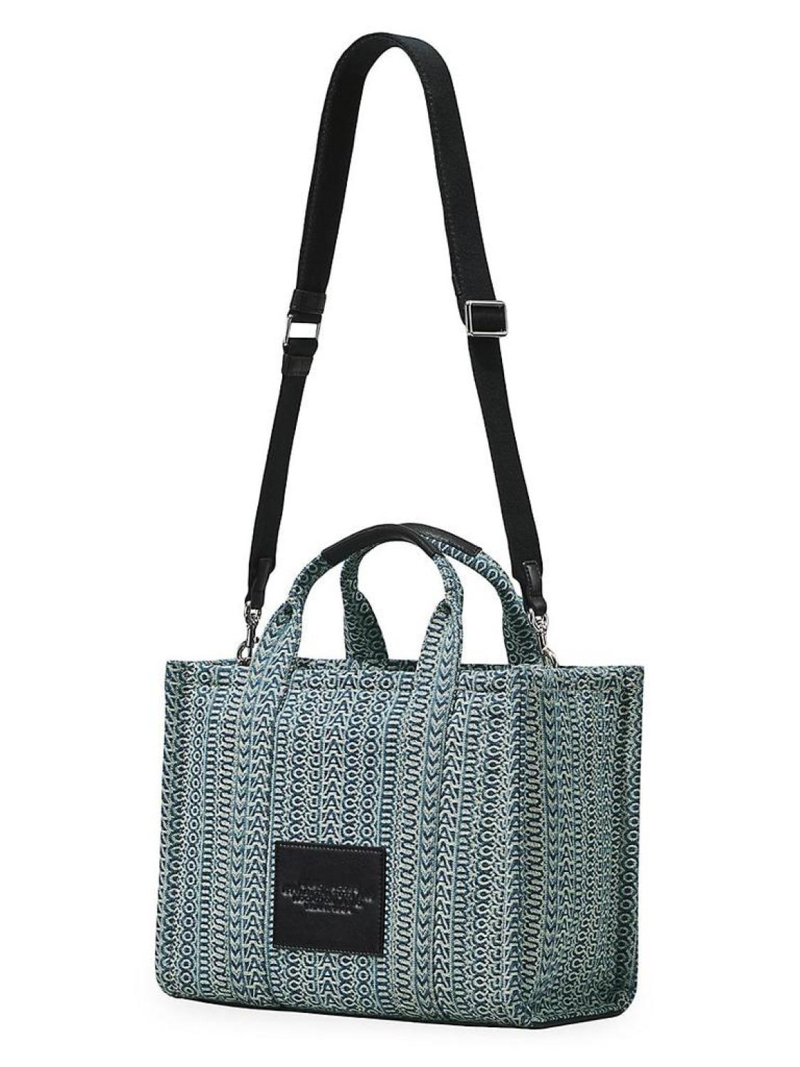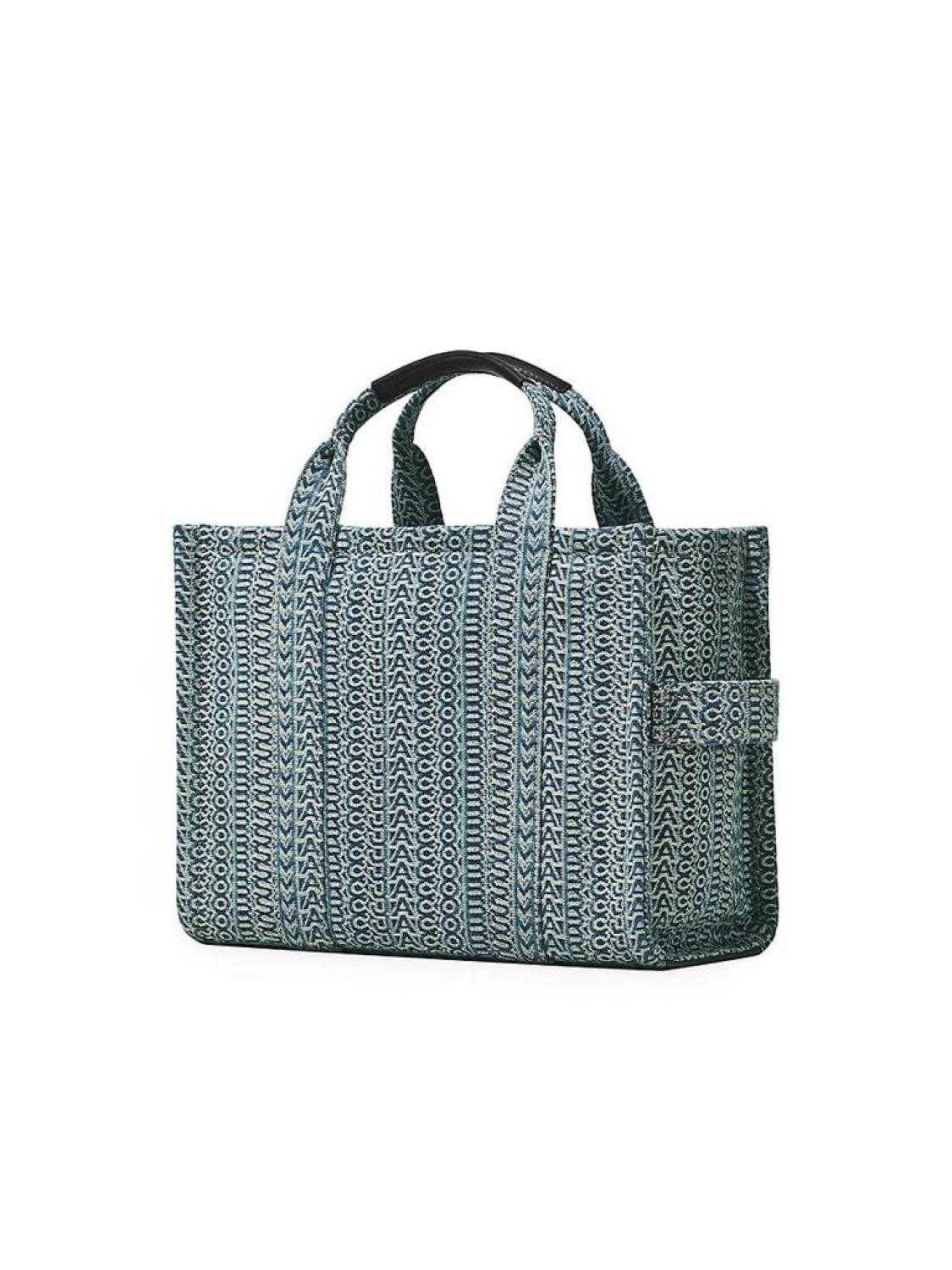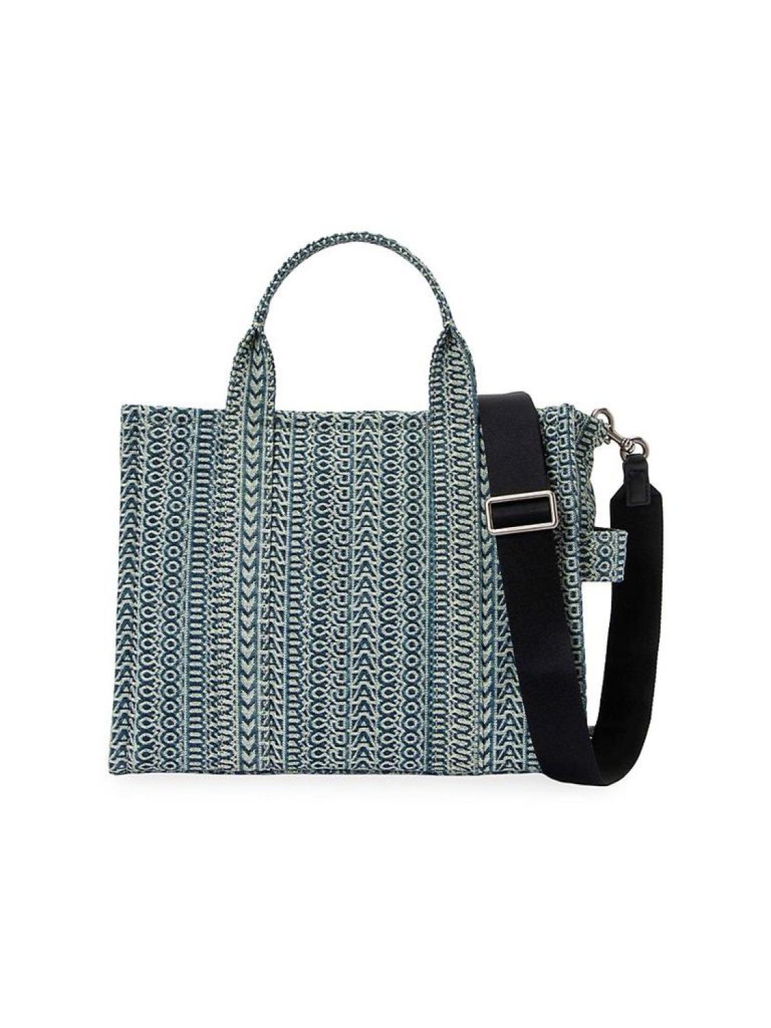 • The Medium Monogram Denim Tote Bag from Marc Jacobs is rendered in denim with a monogram pattern.