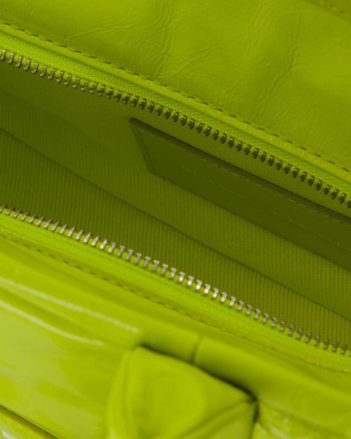 Two wearing options - one top handle and one adjustable, detachable shoulder strap. Material - leather. Colours - Green - Acid Lime. Closure - top magnetic clasp. Interior - one zipped pocket.