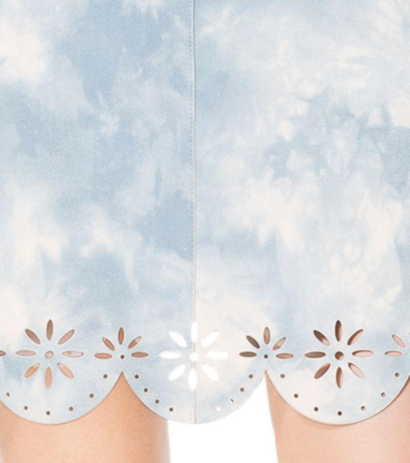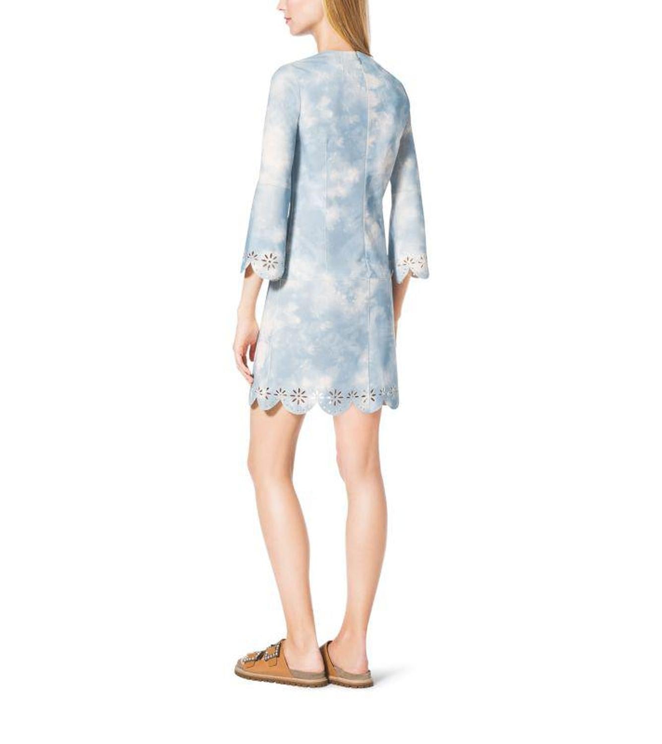 • Sumptuous bonded suede is tie-dyed in a powdery cornflower-blue hue on this dreamy shift dress. The scalloped edges are a feminine flourish while laser-cut detailing reads modern. Slide into embellished sandals for an elevated getaway look.