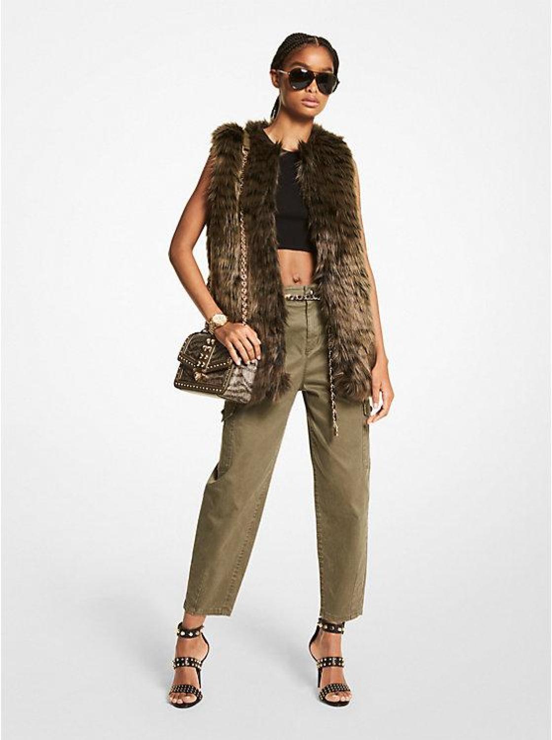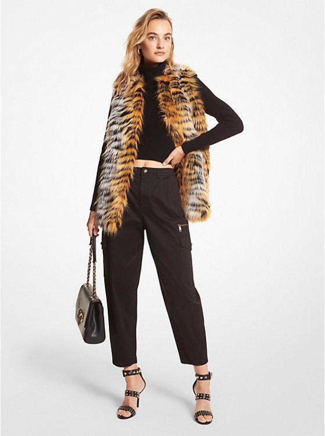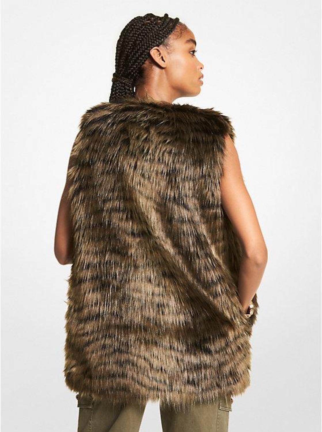 • Take a walk on the wild side with this tiger-print vest. Made from plush faux fur, it’s cut for an enveloping fit and lined to easily layer over the season’s chunky knits. Keep it in focus with a monochrome outfit.