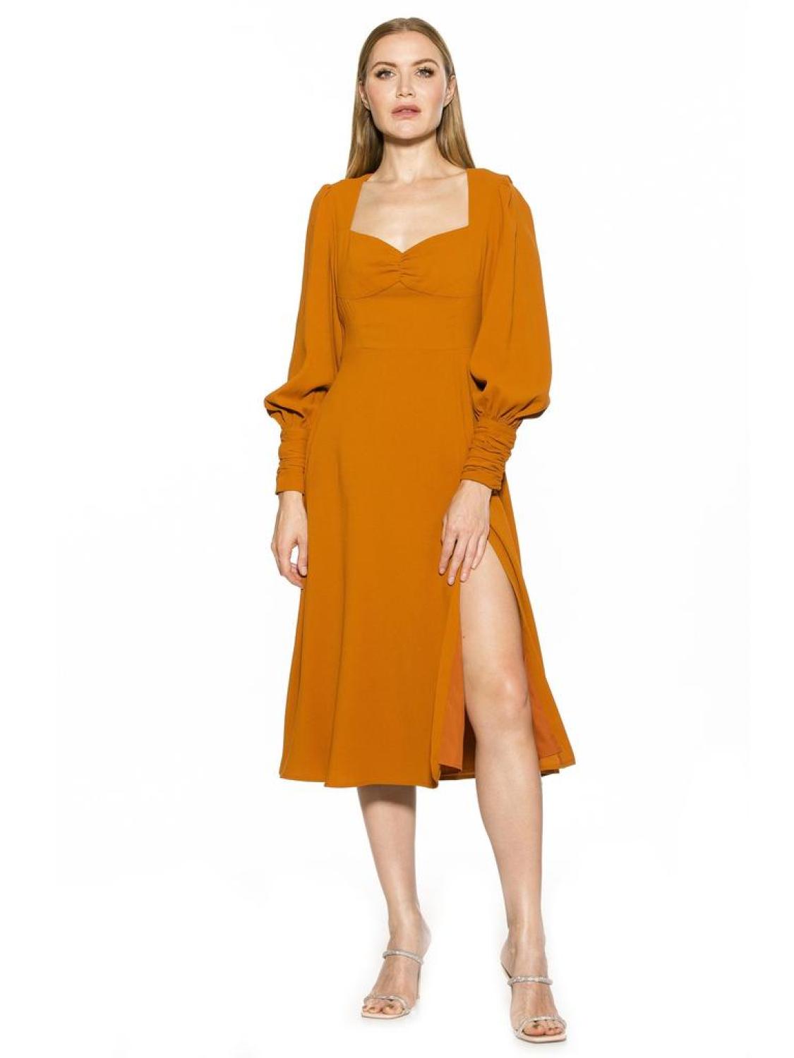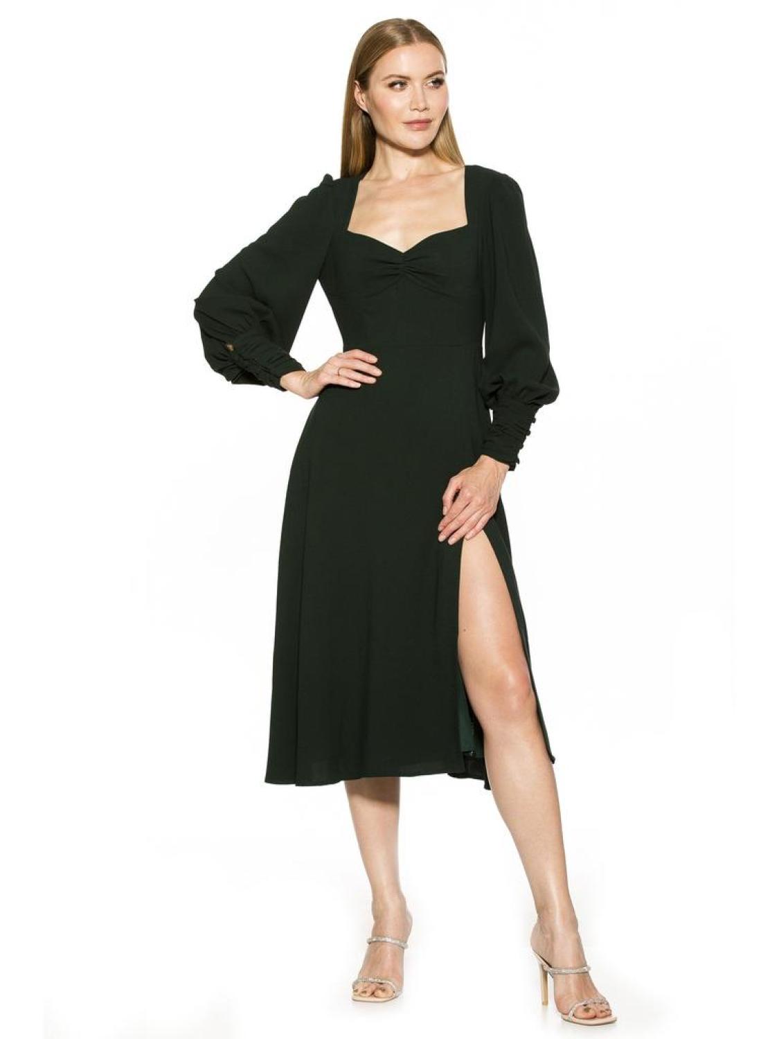 PRODUCT FEATURES Long blouson sleeves Sweetheart neckline Elastic cuffs Seersucker construction Fit and flare silhouette Midi length High Leg Slit Hidden zipper 100% Polyester Lined - 97% Polyester, 3% Spandex Machine wash Imported Style D3935