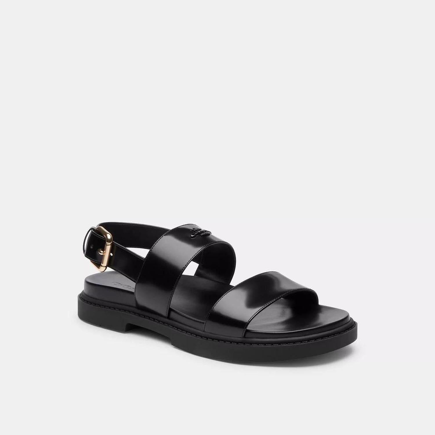 Spazzolato leather upper Man-made leather lining and footbed Rubber outsole Buckle closure Style No. CAP52 | Coach Outlet Two Band Sandal - Black, Size - 8.5