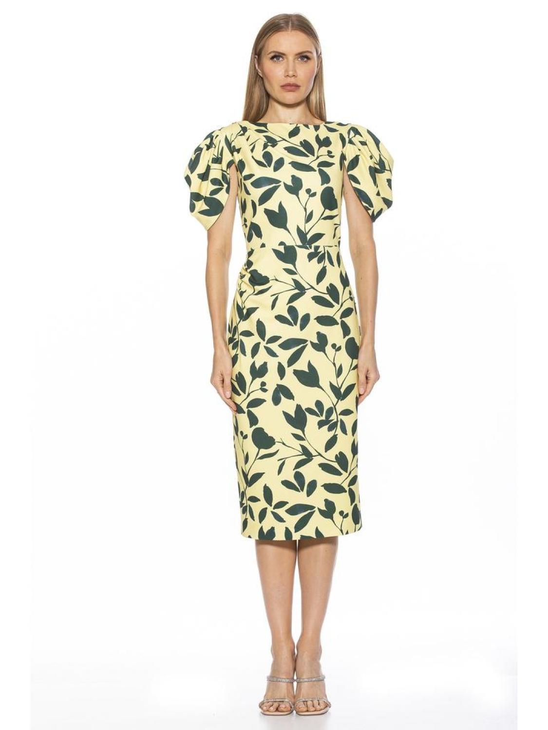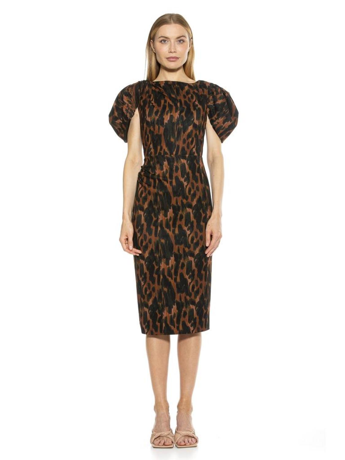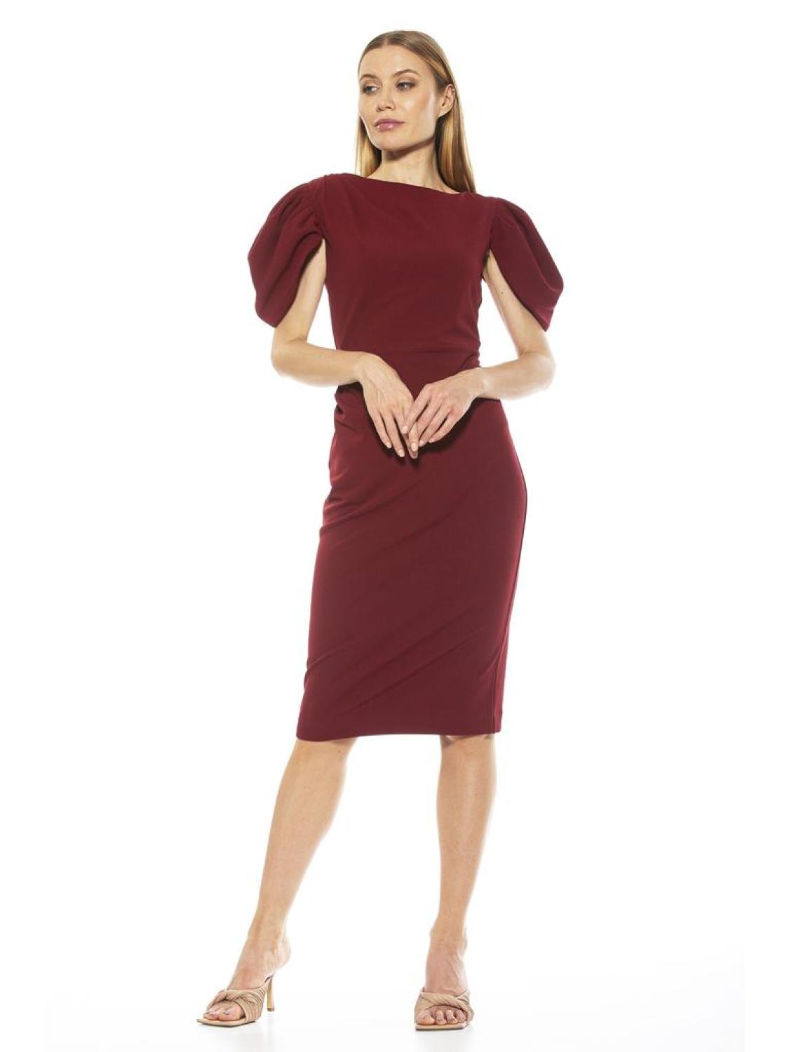 • PRODUCT FEATURES Crew neck Puff Sleeve Midi length 95% Polyester, 5% Spandex Lined - 100% Polyester Machine wash, tumble dry Imported Style D3836