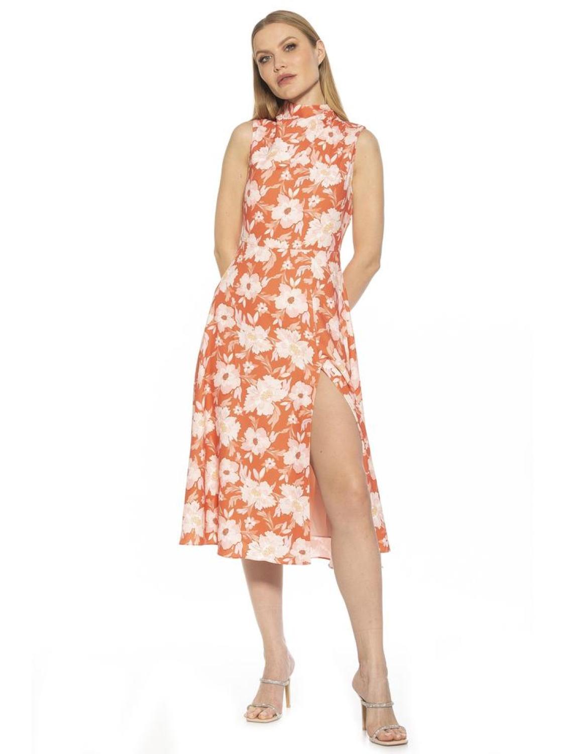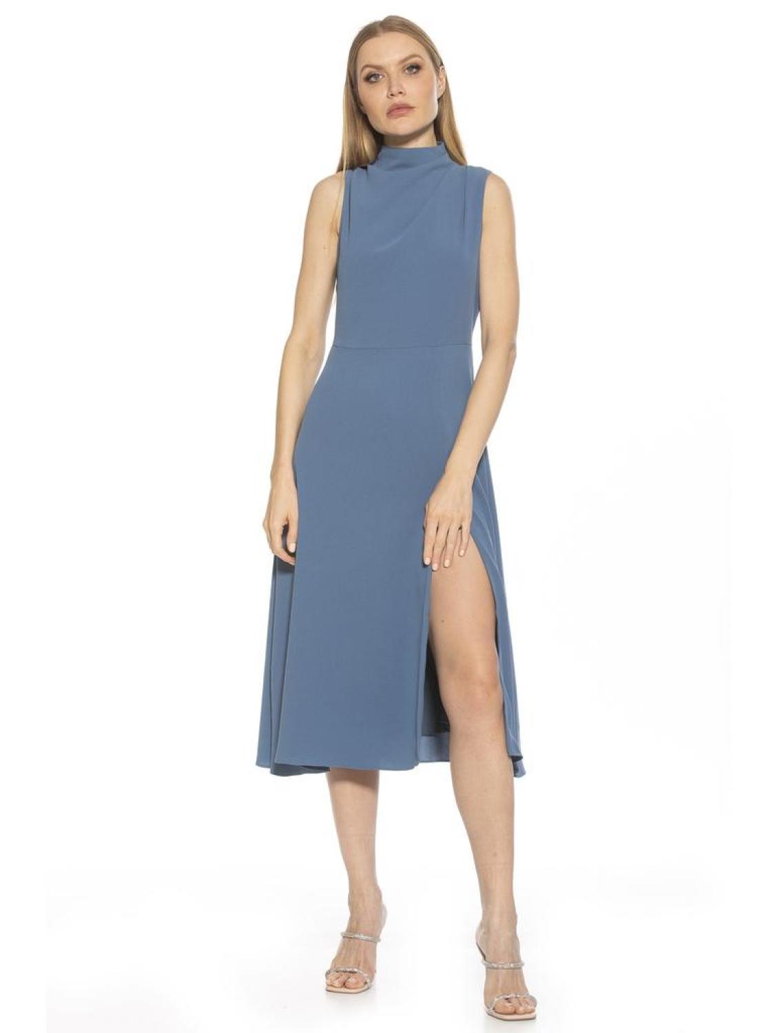 • PRODUCT FEATURES Draped mockneck Sleeveless Zip back closure Front slit 100% Polyester Lined - 97% Polyester, 3% Spandex Machine wash Imported Style D3915