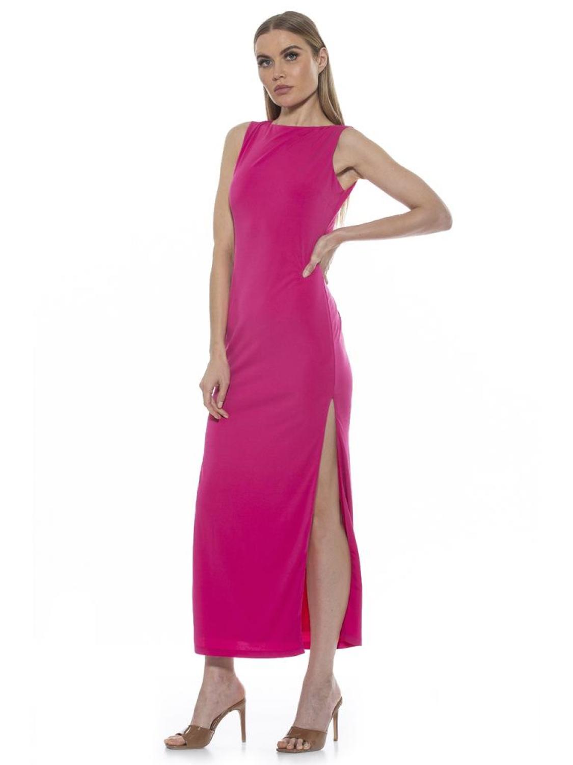 Sleeves are cancelled. The Violet is a sleeveless, maxi dress with a high boat neckline, and an open back with a tie detail.PRODUCT FEATURES Boatneck?� Sleeveless Backless dress with a tie detail?� High side slit?� Maxi Dress 95% Polyester, 5% Spandex Lining - 100% Polyester Machine Wash Imported Styles D4000