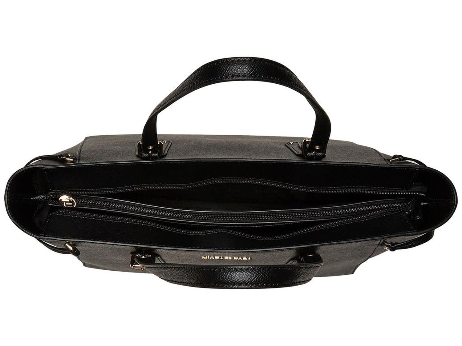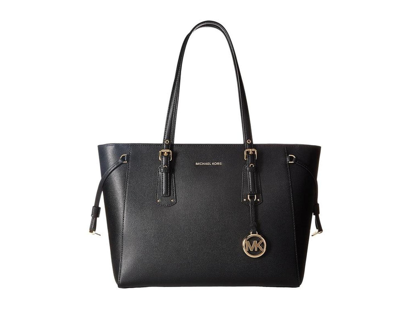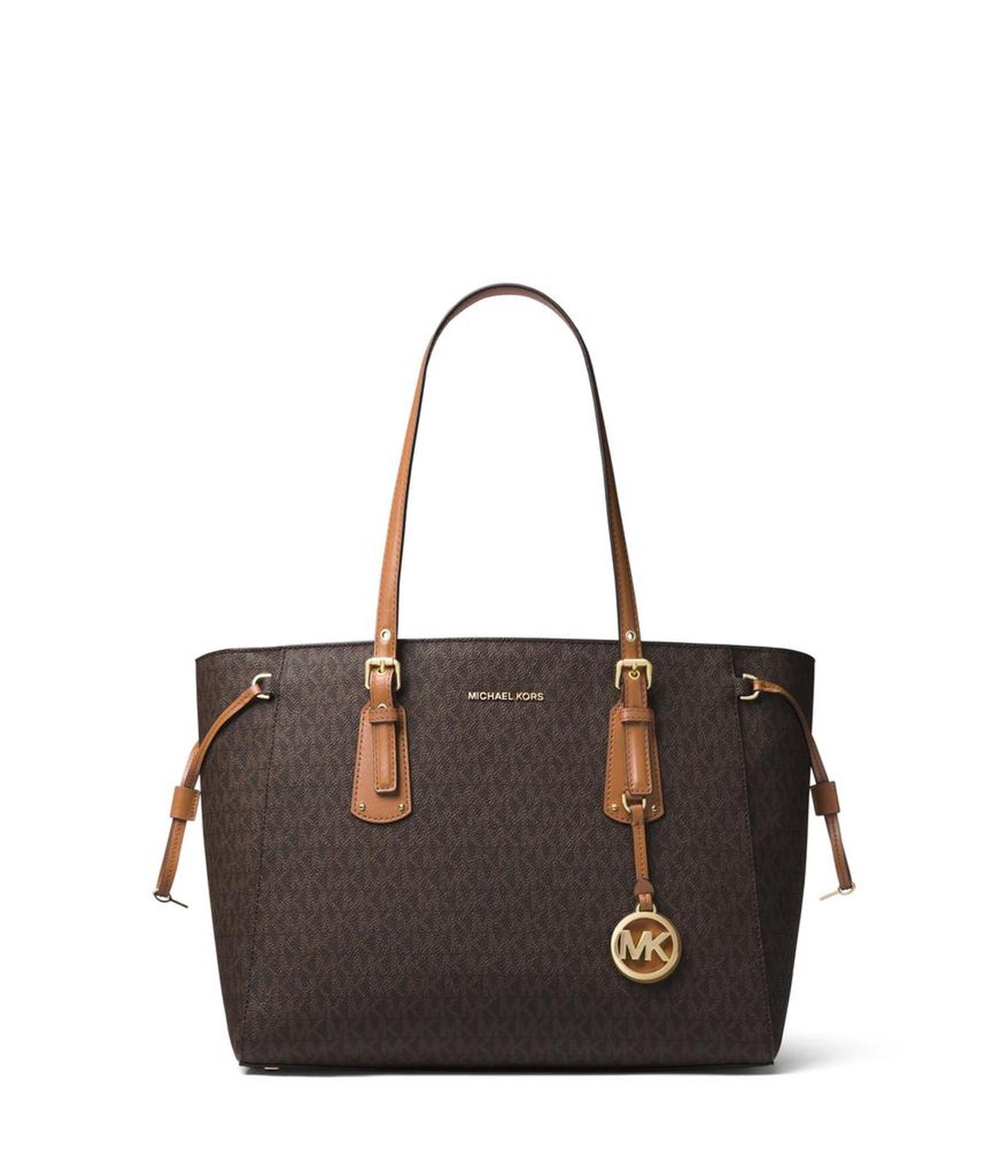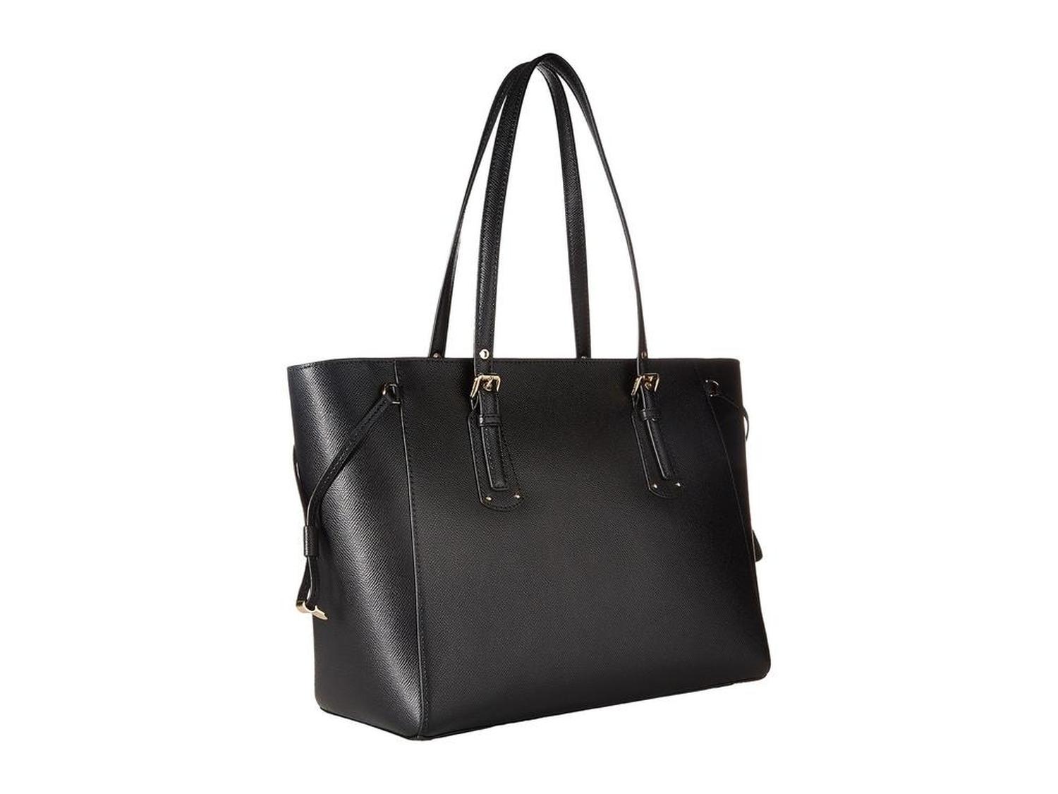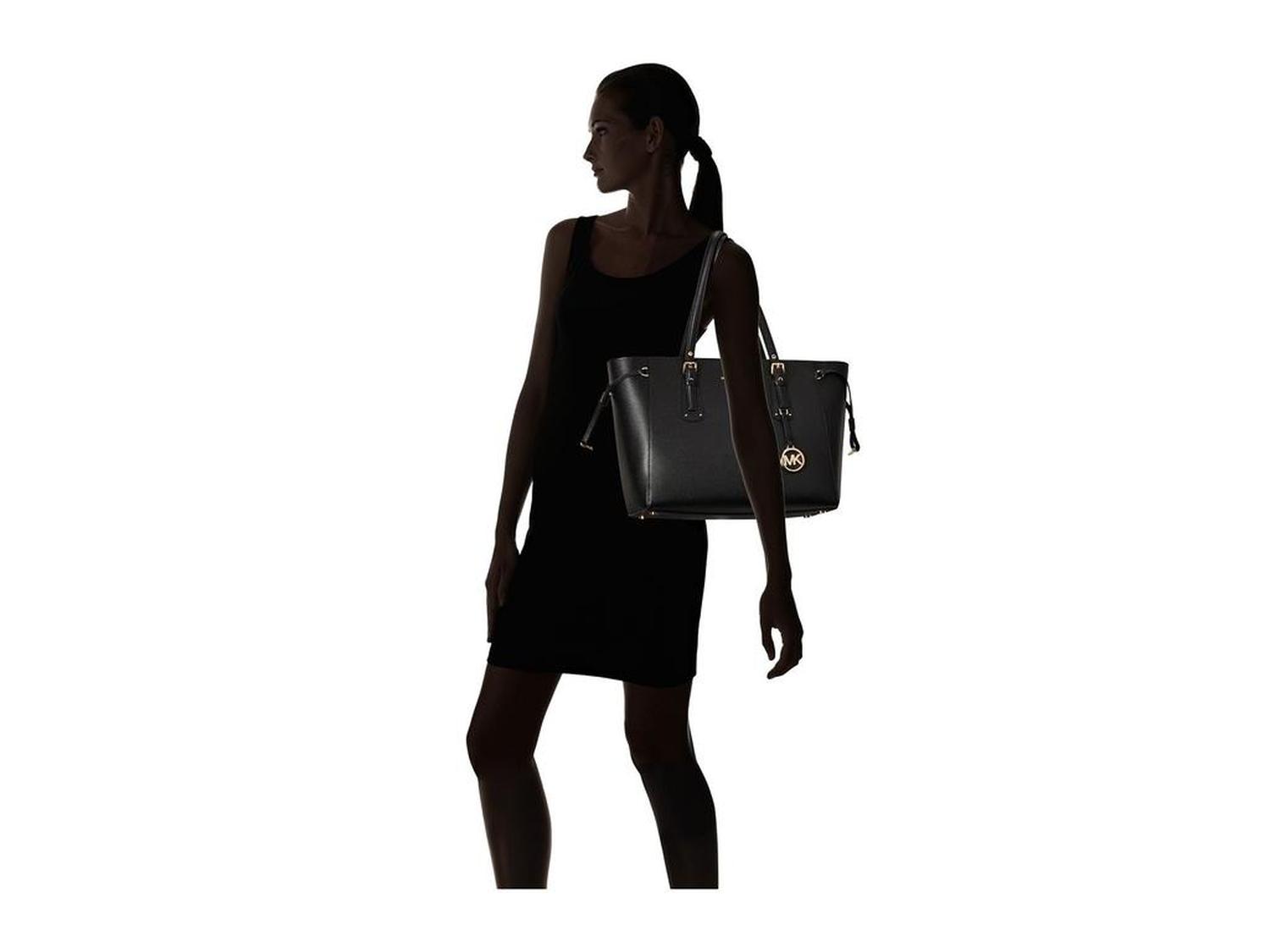 Your new daily look boasts a chic flair and a fierce edge when you flaunt the Voyager Medium Top Zip Tote. Made of polyurethane. Zipper closure with drawstring detail at sides. Dual carrying handles. Signature logo hardware detail in front. Protective metal foot base. Lining made of polyester. Interior center and back-wall zip pockets. Five interior slip pockets. Imported. Please note, the hardware color and interior lining may differ from the color shown in the photo. Measurements: Bottom Width: 13 in Depth: 5 1/2 in Height: 10 1/2 in Strap Length: 28 in Strap Drop: 9 in Weight: 2 lbs 2 oz