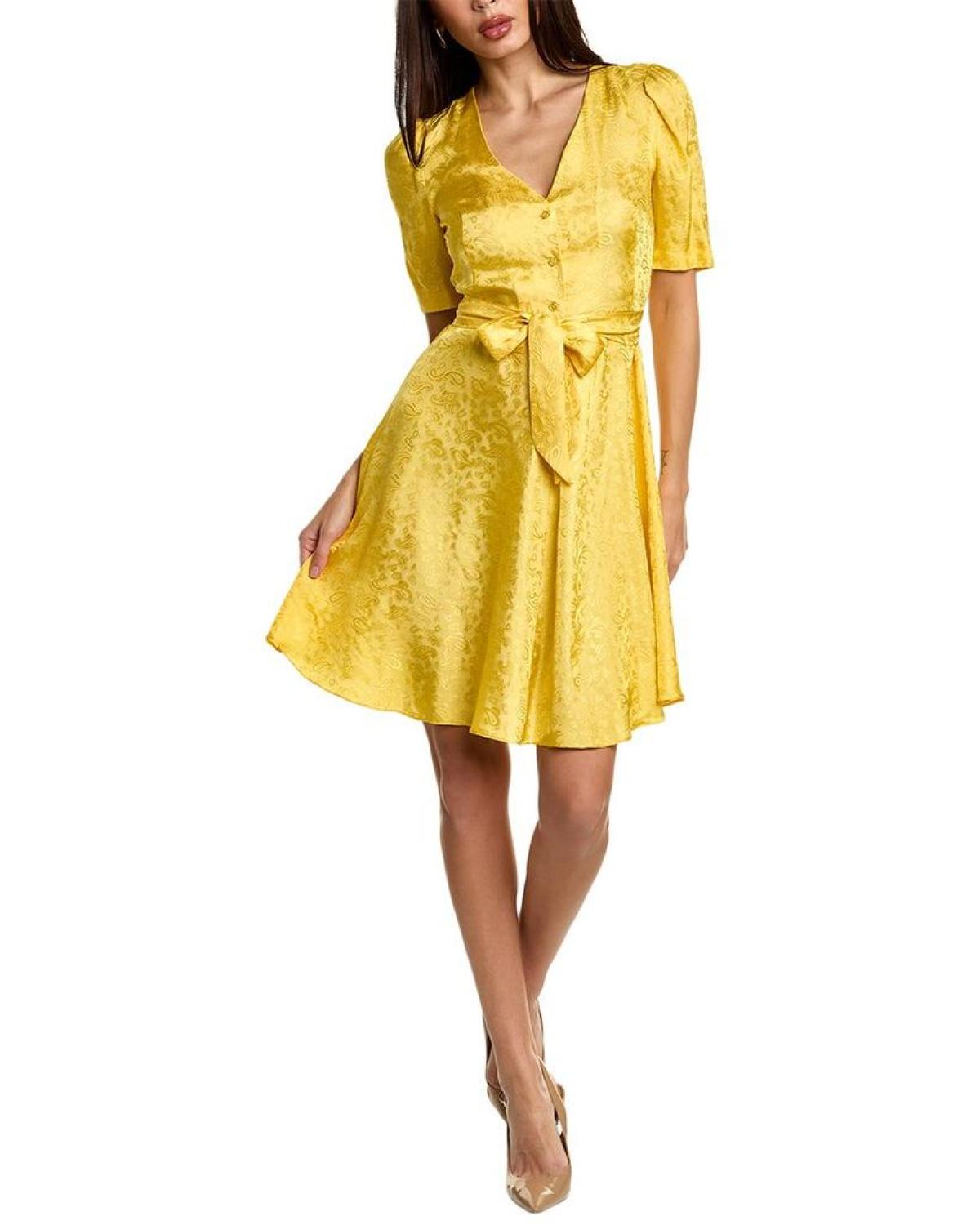 Introducing the Weekend Max Mara Fatto Dress, a stunning addition to your wardrobe that perfectly embodies the sophisticated, casual elegance that Max Mara is renowned for. This dress, featured in a glamorous gold hue, is designed with a flattering V-neck, shirred shoulders, and a self-tie sash at the waist, creating a flattering silhouette that effortlessly accentuates your figure.Measuring approximately 35 inches from shoulder to hem, this dress hits at just the right length for a versatile and stylish look. The model, standing at 5'10', is wearing a size 4, showcasing its impeccable fit. Please note that measurements may vary slightly by size, ensuring a personalized and tailored look.With its button front detailing, this dress exudes an air of refined elegance. Crafted from 100% viscose, it offers utmost comfort without compromising on style. For care instructions, simply dry clean only to preserve its pristine appearance. Imported with utmost craftsmanship, this Weekend Max Mara Fatto Dress epitomizes luxury and sophistication. Indulge yourself in the seamless blend of style and comfort that Max Mara is known for, and make a statement wherever you go. Embrace your individuality and redefine elegance with this exceptional piece from Max Mara's exclusive collection.