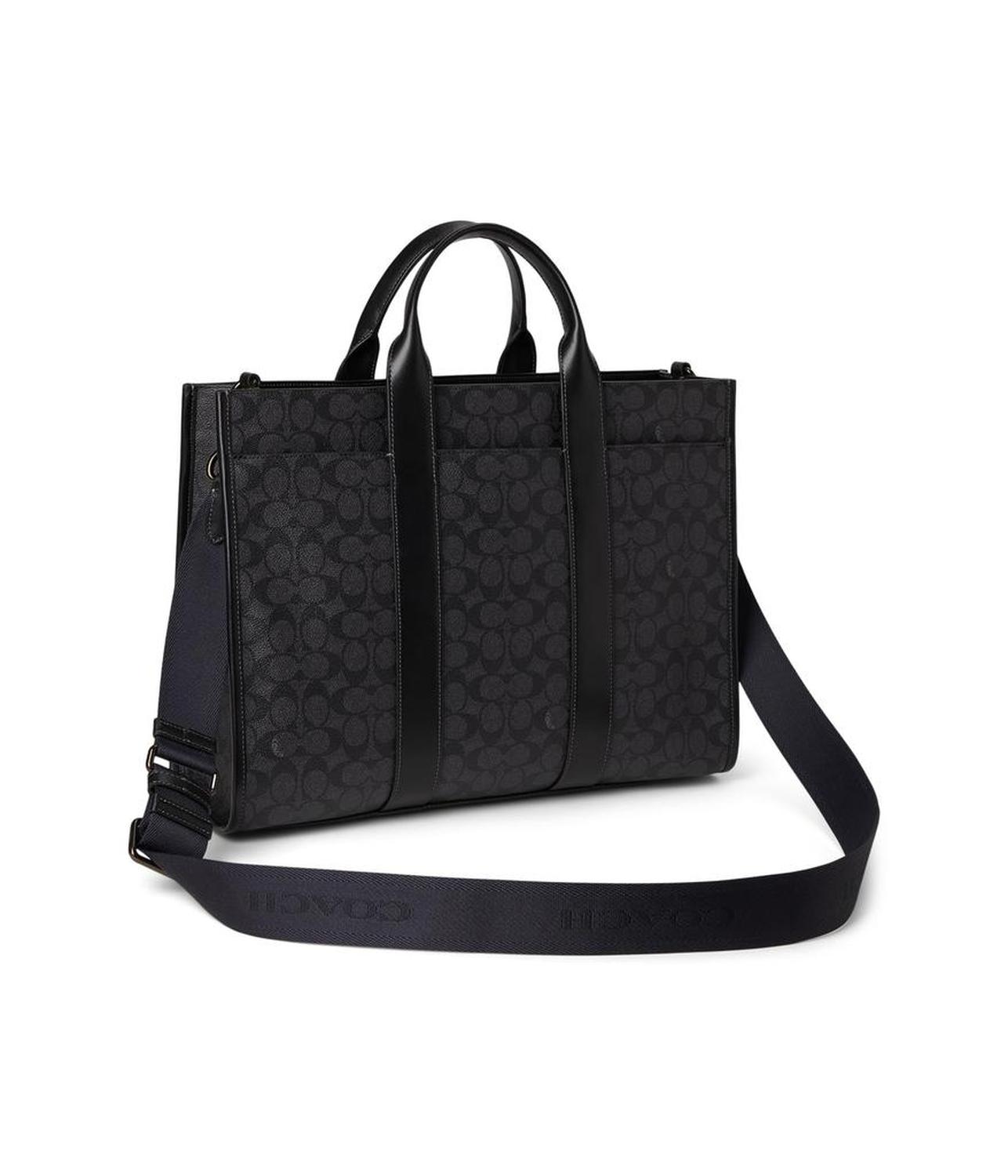 Please Note: COACH™ items cannot be shipped to military addresses (APO or FPO) and addresses in Hawaii, the Virgin Islands, Guam or any other locations outside of the continental US. This structured COACH™ Wesley Tote In Signature Canvas tote blends timeless style with practicality. Crafted from signature coated canvas and refined calf leather. It features adjustable detachable strap for shoulder or crossbody wear along with two handles on the top. It is provided with zip-top closure with two compartments, inside zippered pocket and outside magnetic snap pocket. It fits a 16 inch laptop. 75% PVC backed w/fabric(78% PVC, 22% Polyester), 25% cow leather. Four protective feet at base. Fabric cotton lining. Imported. Measurements: Laptop Compartment: 16 in Bottom Width: 6 in Height: 12 1/4 in Strap Drop: 26 in Handle Drop: 4 1/4 in