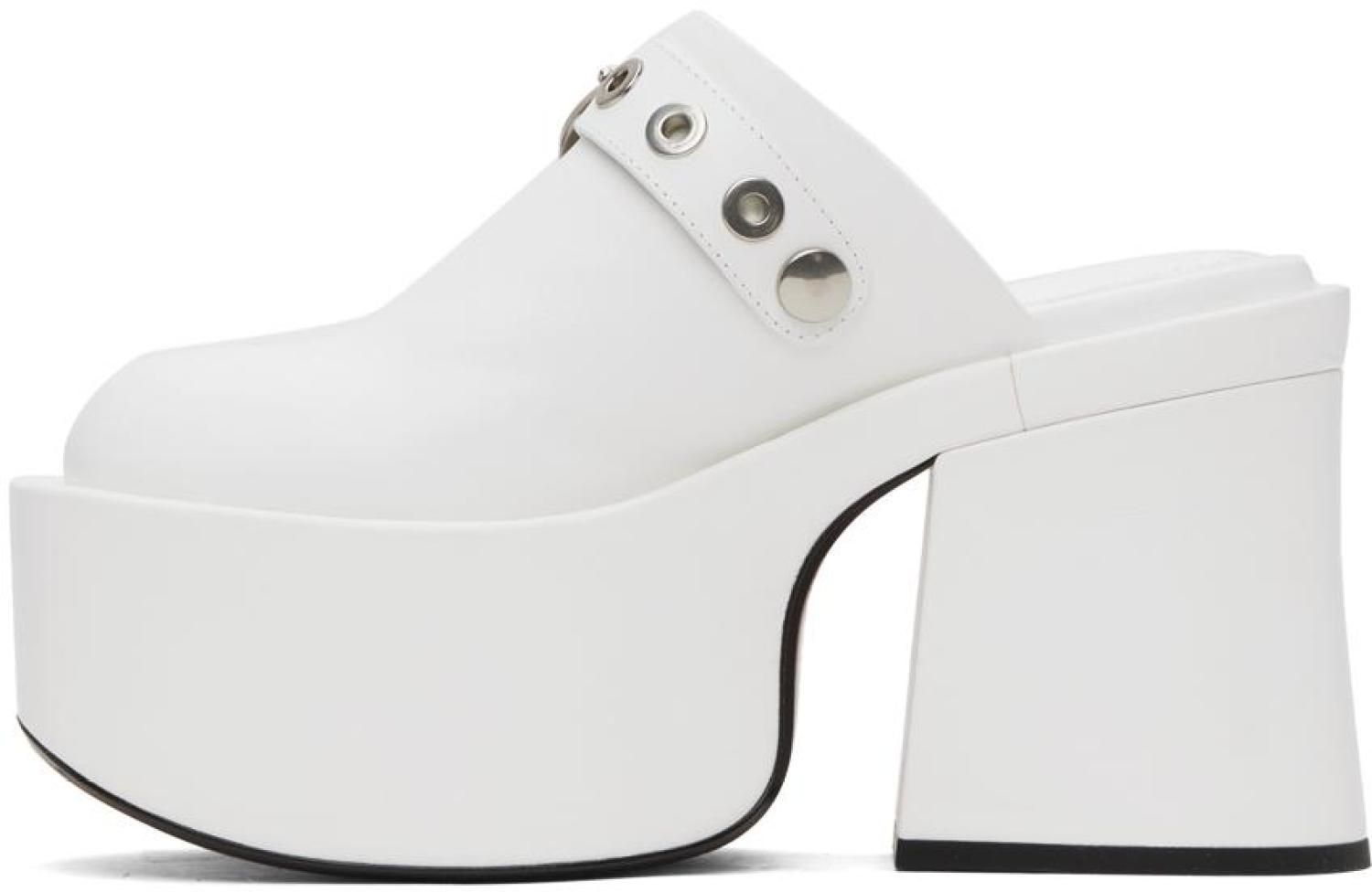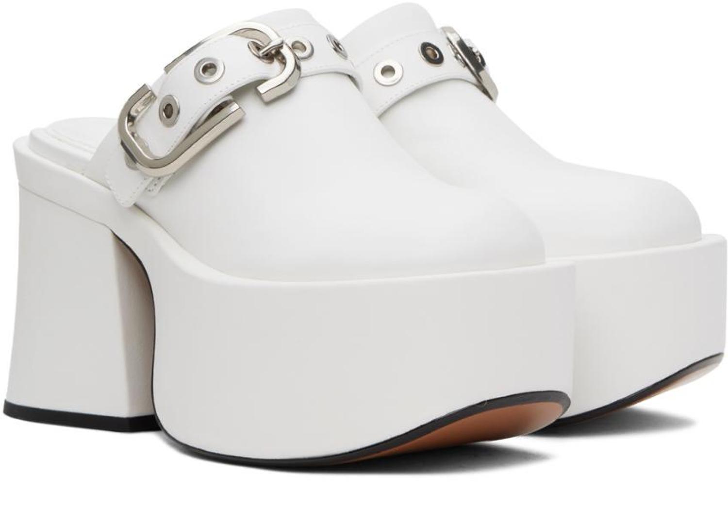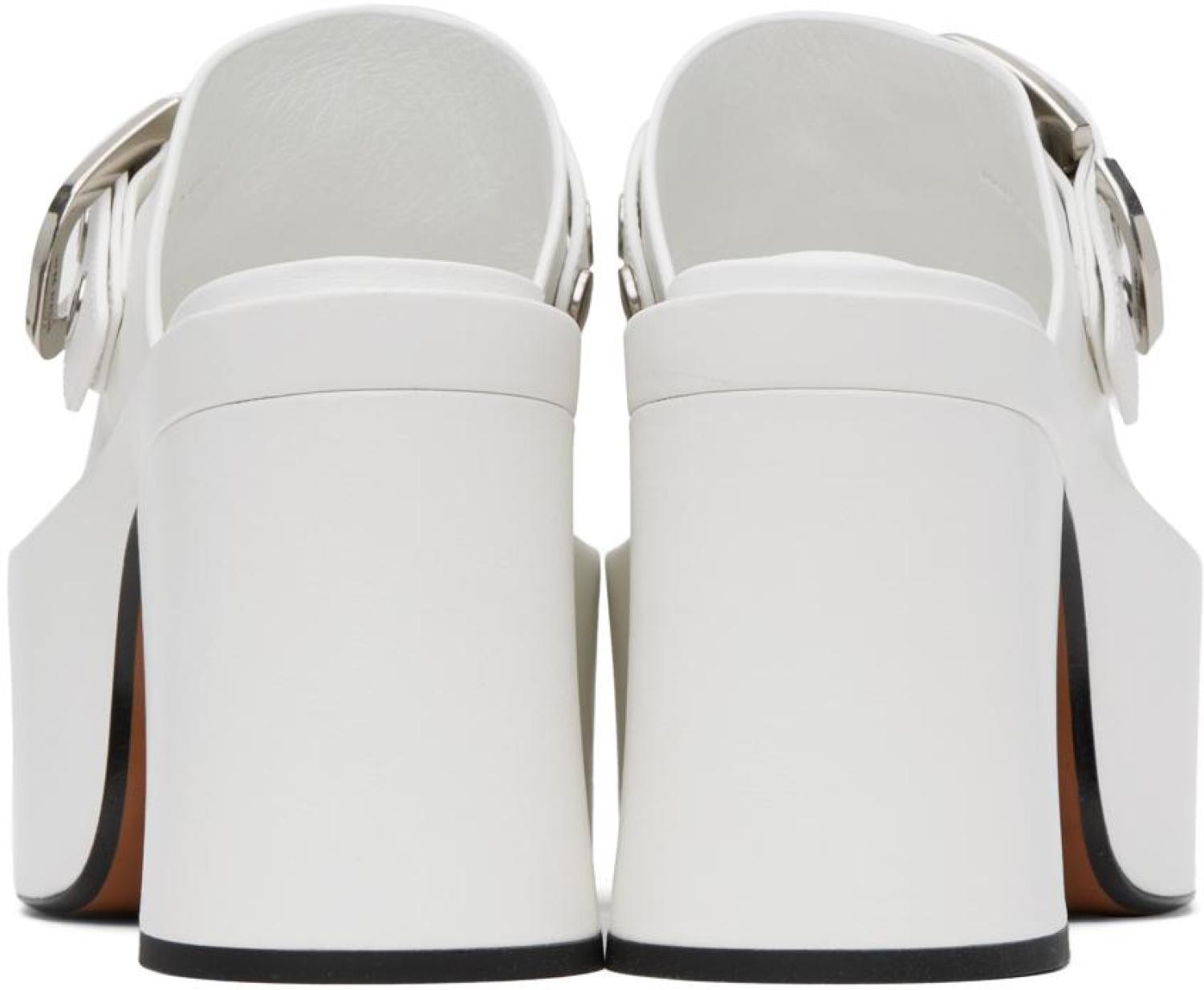 Marc Jacobs White 'The J Marc Leather' Mules Buffed leather mules in white. · Pin-buckle strap at vamp · Padded leather footbed · Grained leather lining · Covered block heel with rubber injection · Covered platform midsole · Leather sole · Platform: H2.5" · Heel: H3.75" Supplier color: White Leather. Made in China. 241190F122004