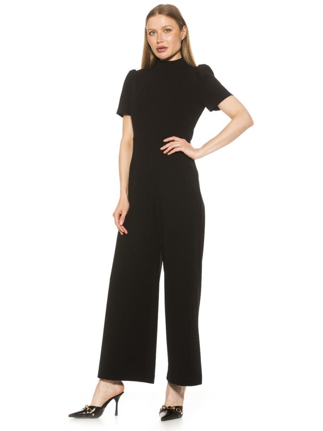 Willow Jumpsuit features a subtly sophisticated mockneck detail and puff short sleeves, The wide-leg silhouette creates a timelessly flattering silhouette, perfect for any occasion. PRODUCT FEATURES Mockneck Puff short sleeve Wide Leg Jumpsuit 95% Polyester, 5% Spandex Lining - 100% Polyester Machine Wash Imported Style D4087