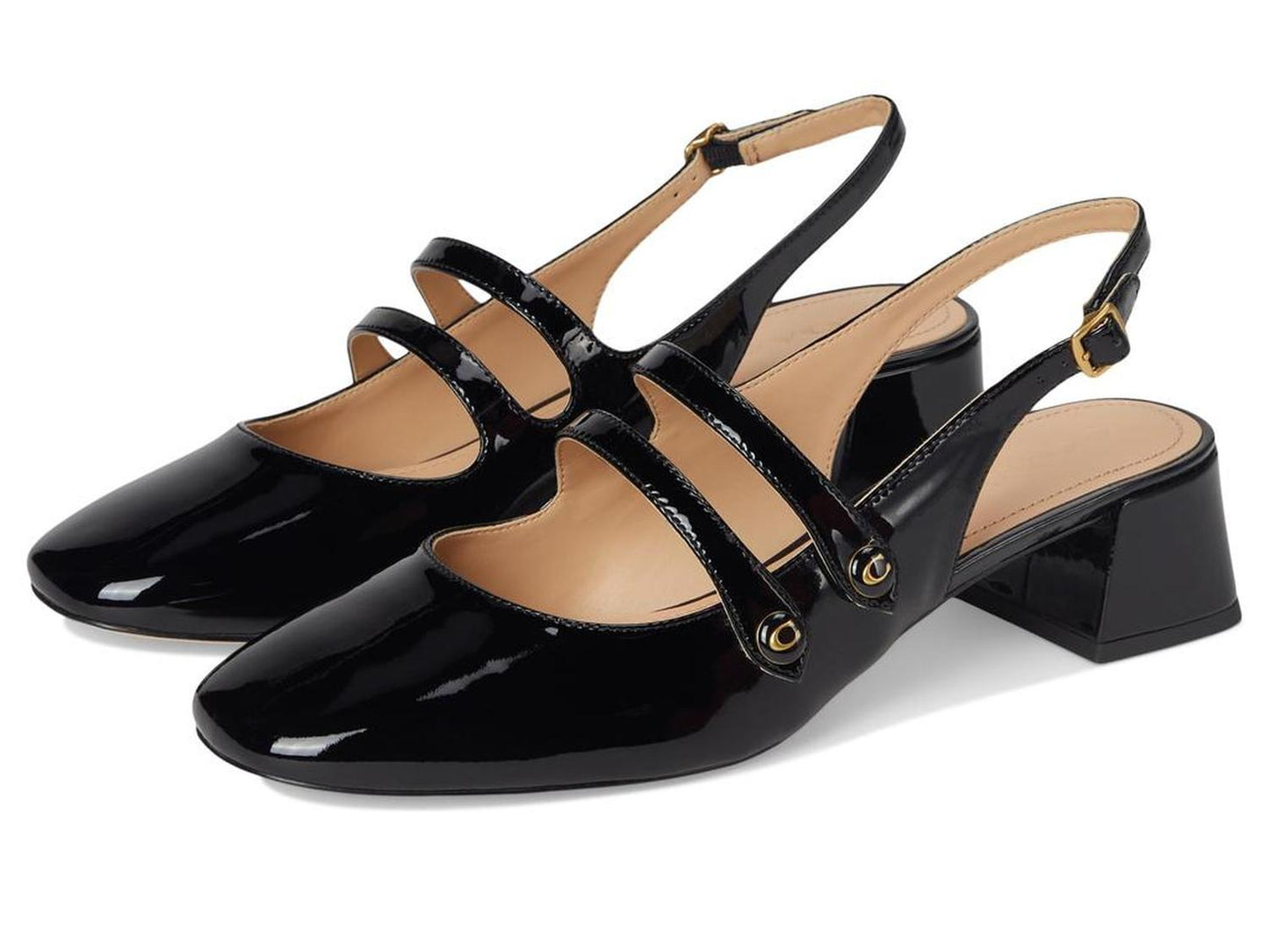 Strut with confidence wearing the COACH® Winley Patent Leather Slingback Mary Jane. Crafted from leather upper, man-made leather lining, and leather footbed, this pair of sandals features round toe, block heel, two strap detailing, and buckle closure.