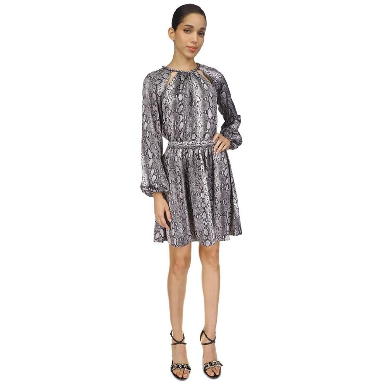 • Playful sophistication. This fun MICHAEL Michael Kors mini dress accents a sleek snake print with a chunky chain at the neckline. Flowy sleeves and an easy skirt move with you.