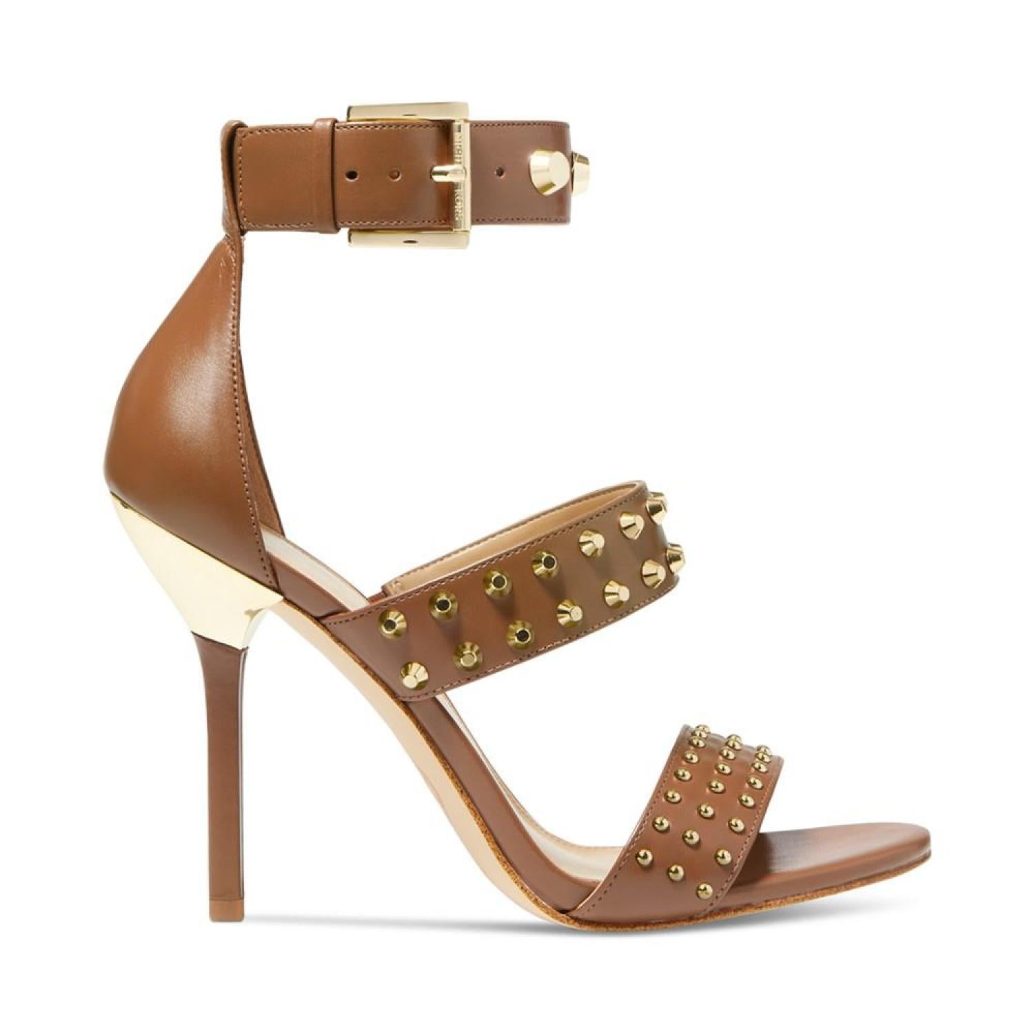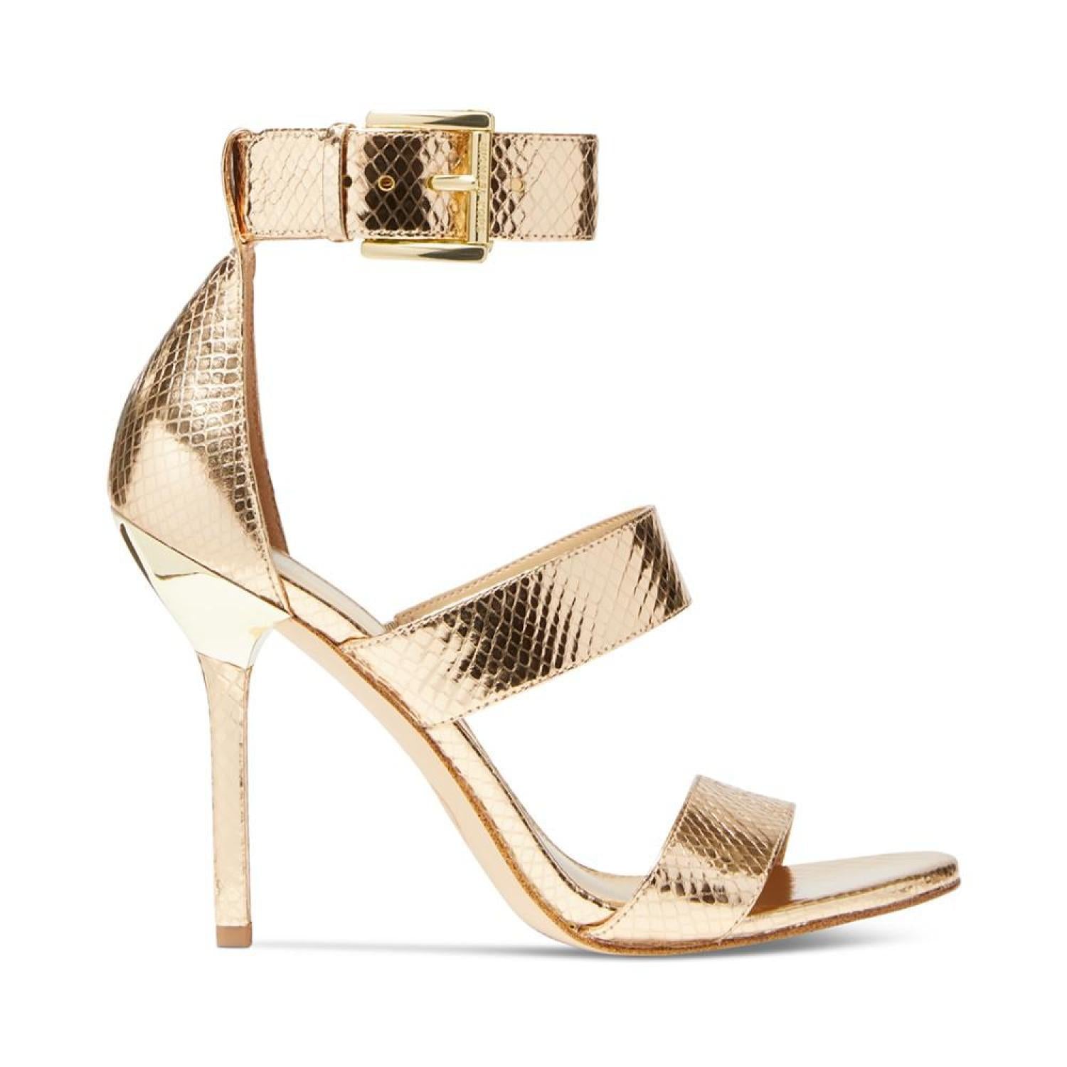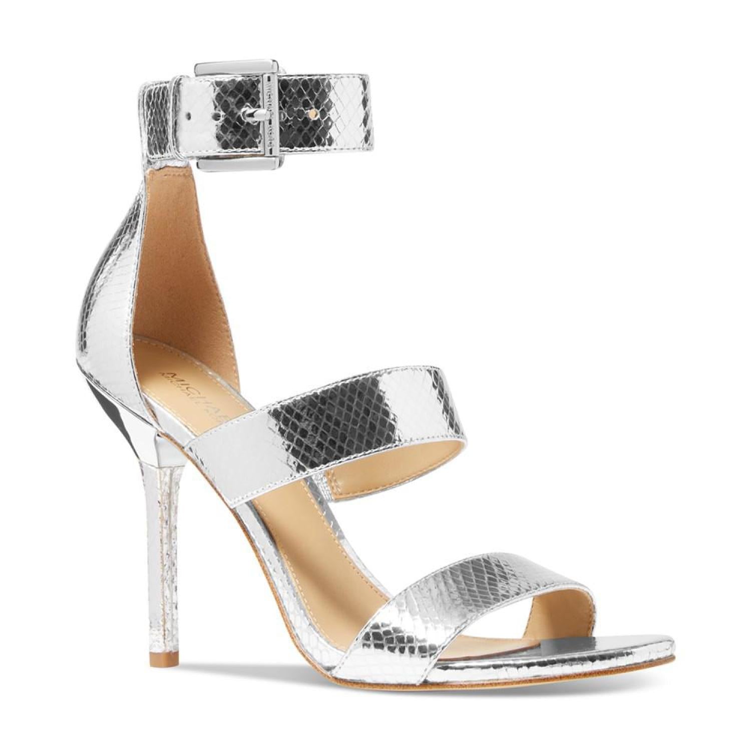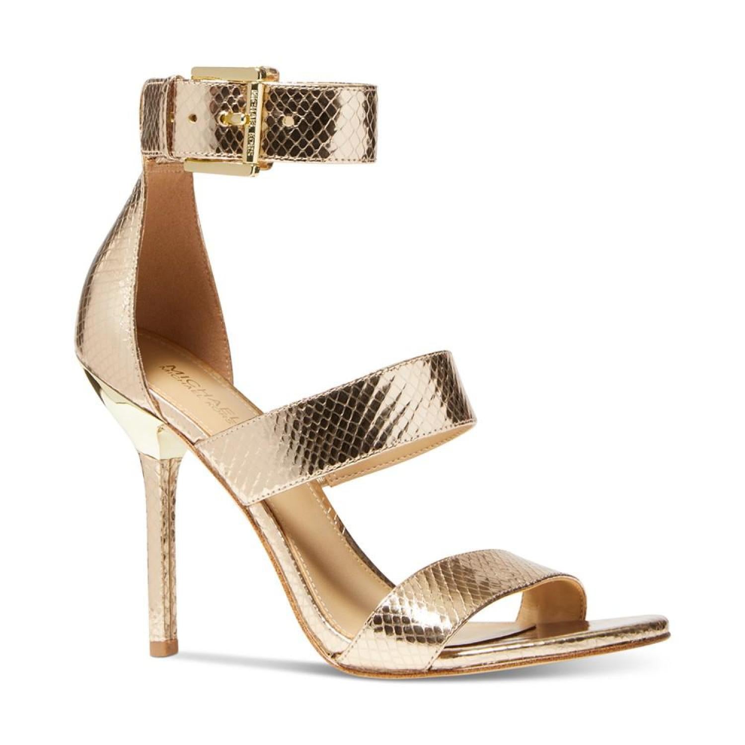 • A trio of sturdy straps top slender galvanized heels for a gorgeous lift in the Amal dress sandals from MICHAEL Michael Kors.