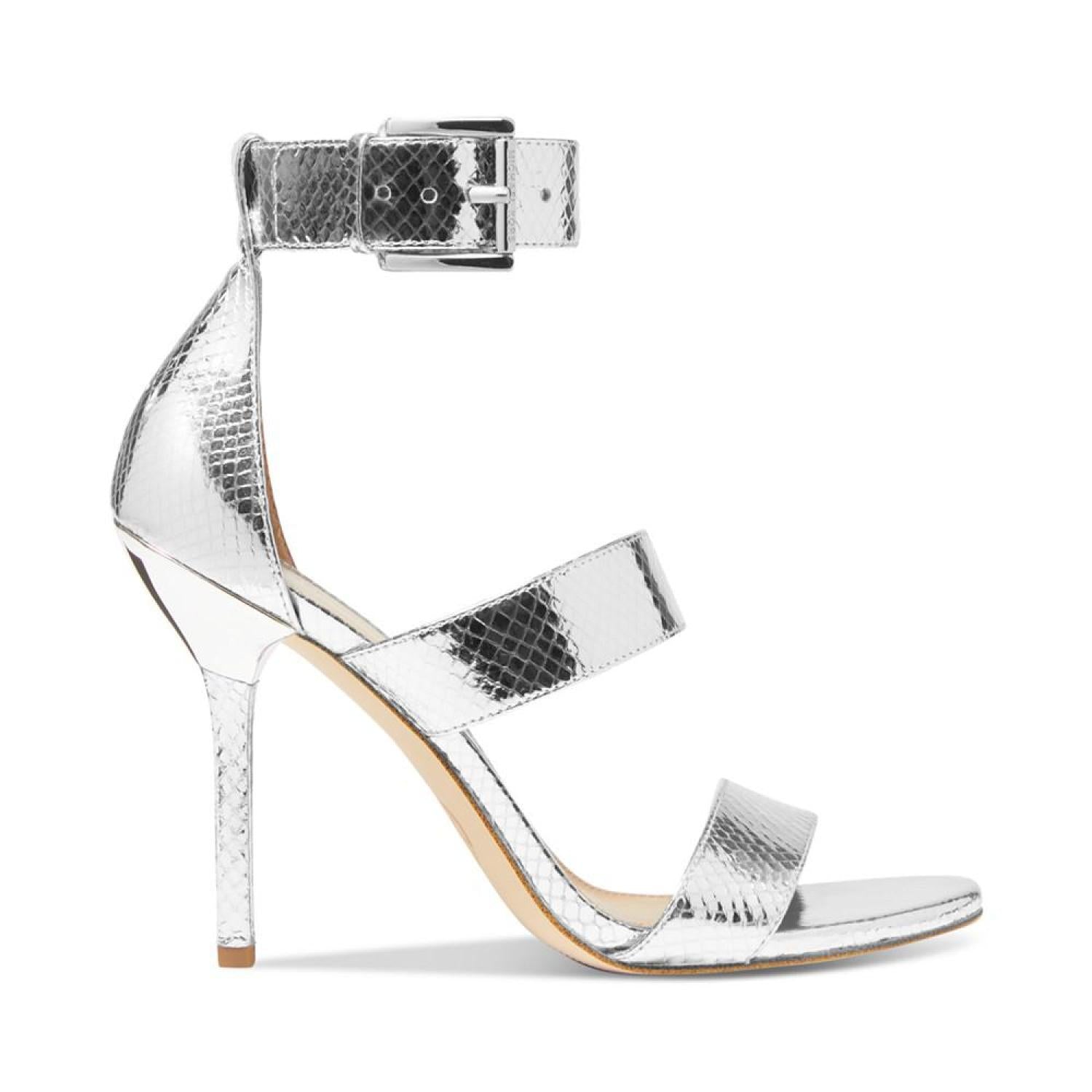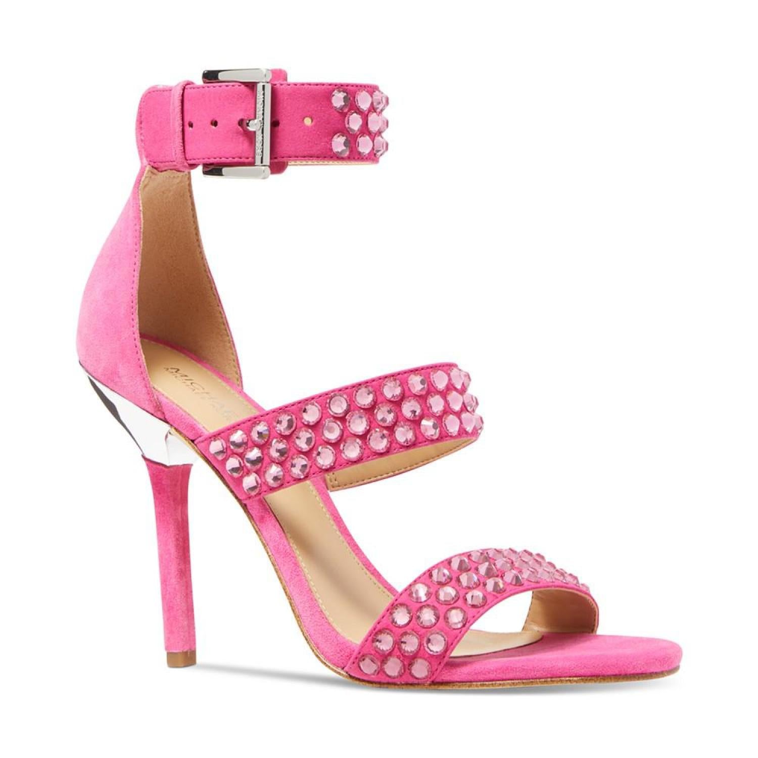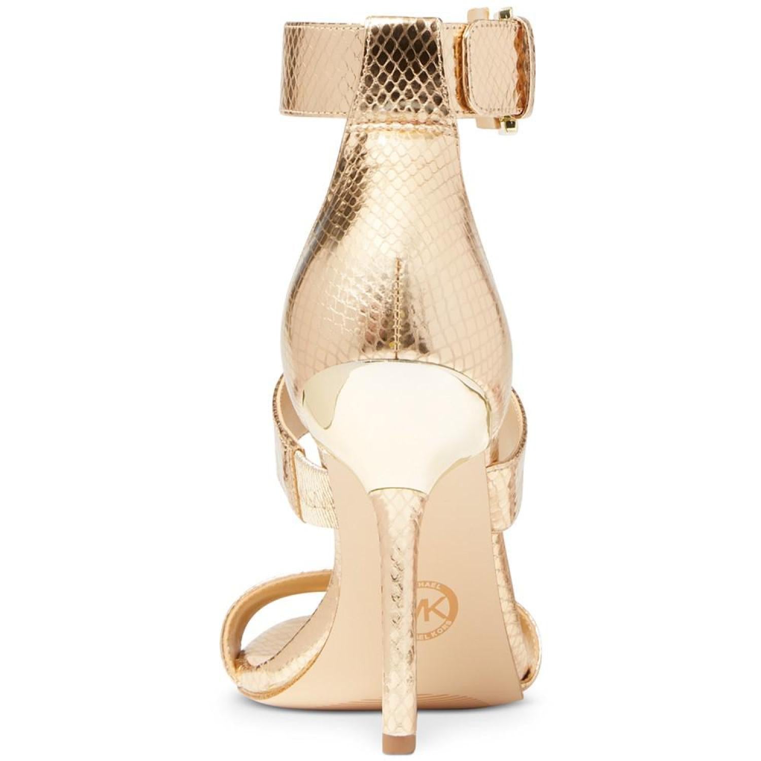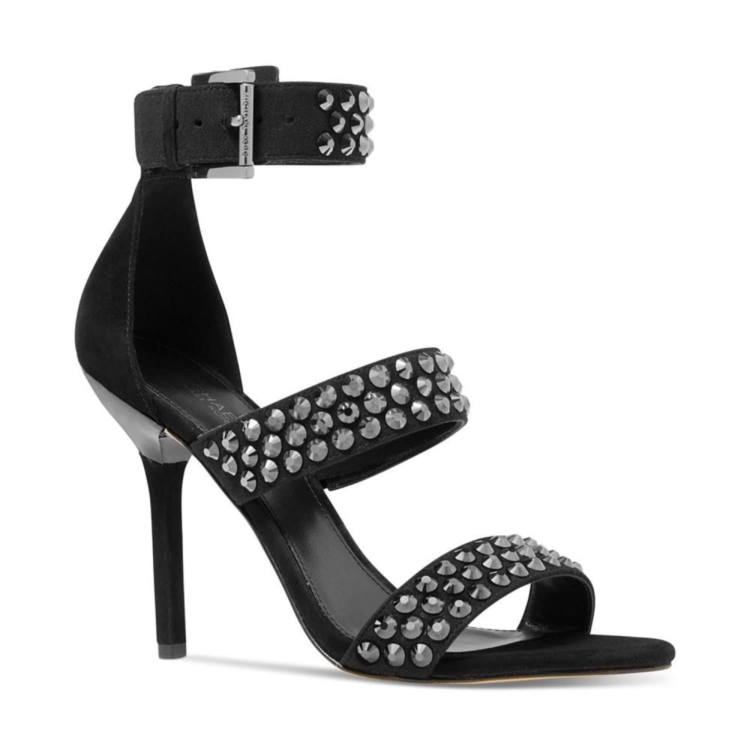 • A trio of sturdy straps top slender galvanized heels for a gorgeous lift in the Amal dress sandals from MICHAEL Michael Kors.