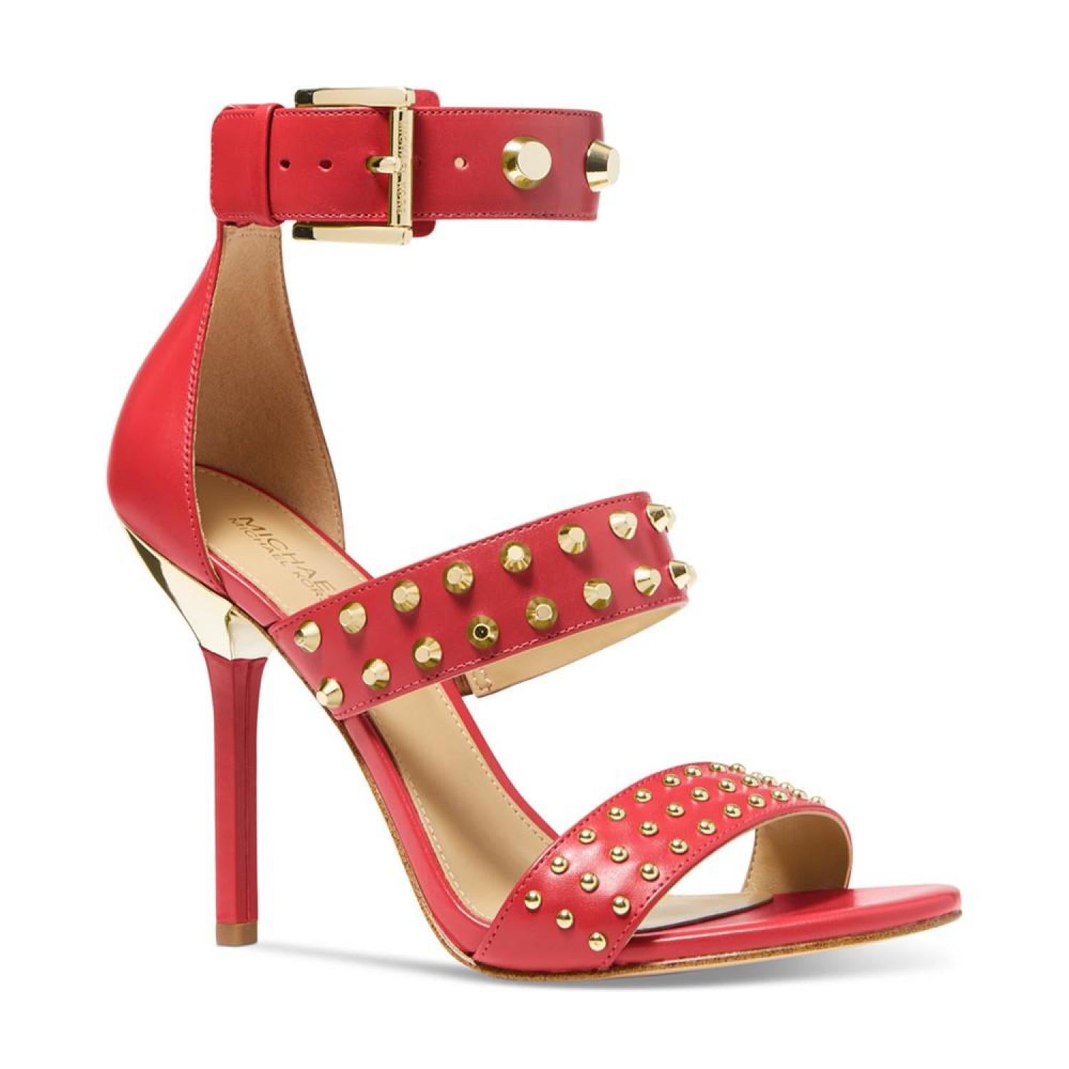 • A trio of sturdy straps top slender galvanized heels for a gorgeous lift in the Amal dress sandals from MICHAEL Michael Kors.
