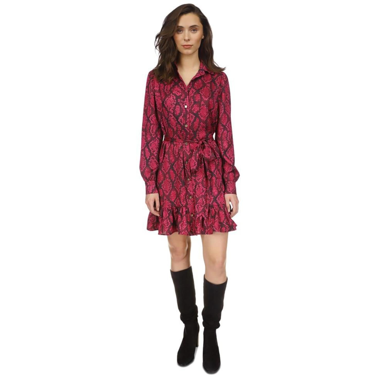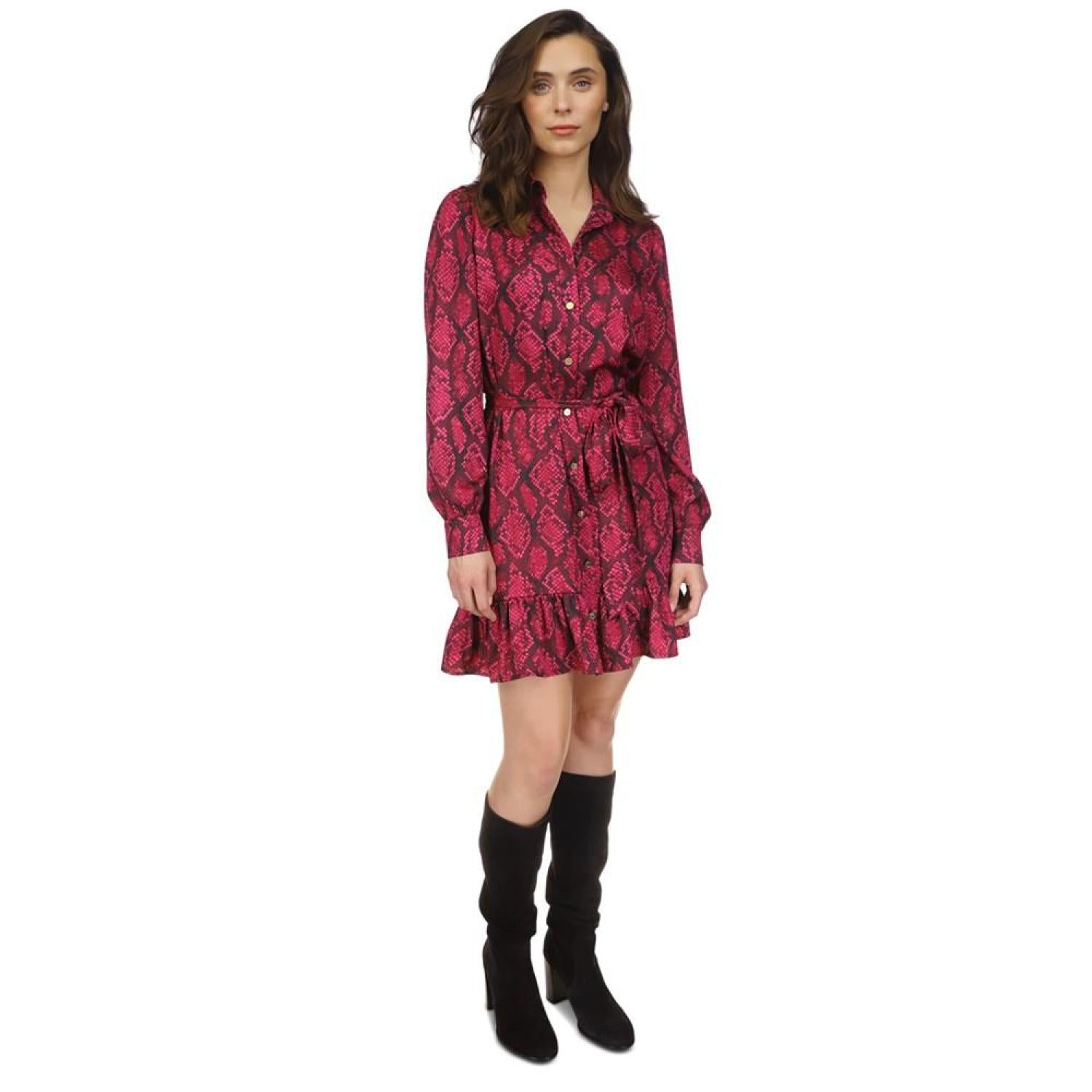A little sugar and a touch of spice. This MICHAEL Michael Kors dress finishes an edgy snake print with a sweet ruffle. Approx. 35-1/2" long from high point of shoulder at back Spread collar Button closure at front Self tie belt Ruffled hem Long sleeves with button cuffs XS=0-2, S=2-4, M=6-8, L=10-12, XL=14-16 Unlined Polyester Machine wash Imported
