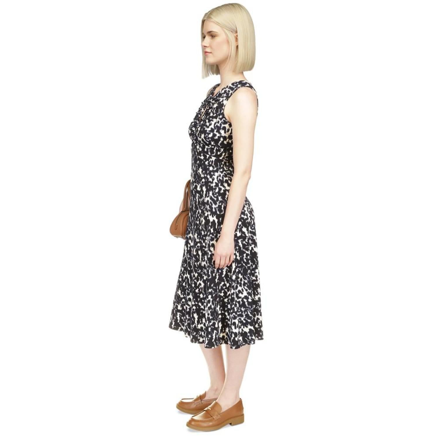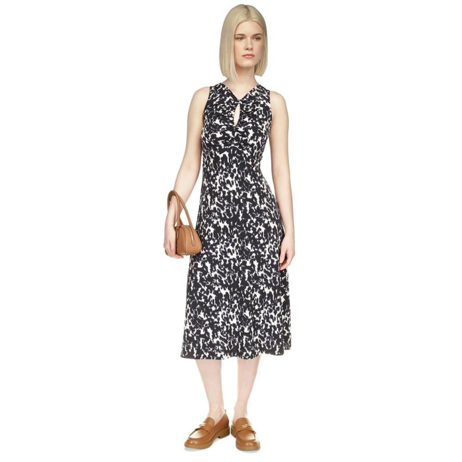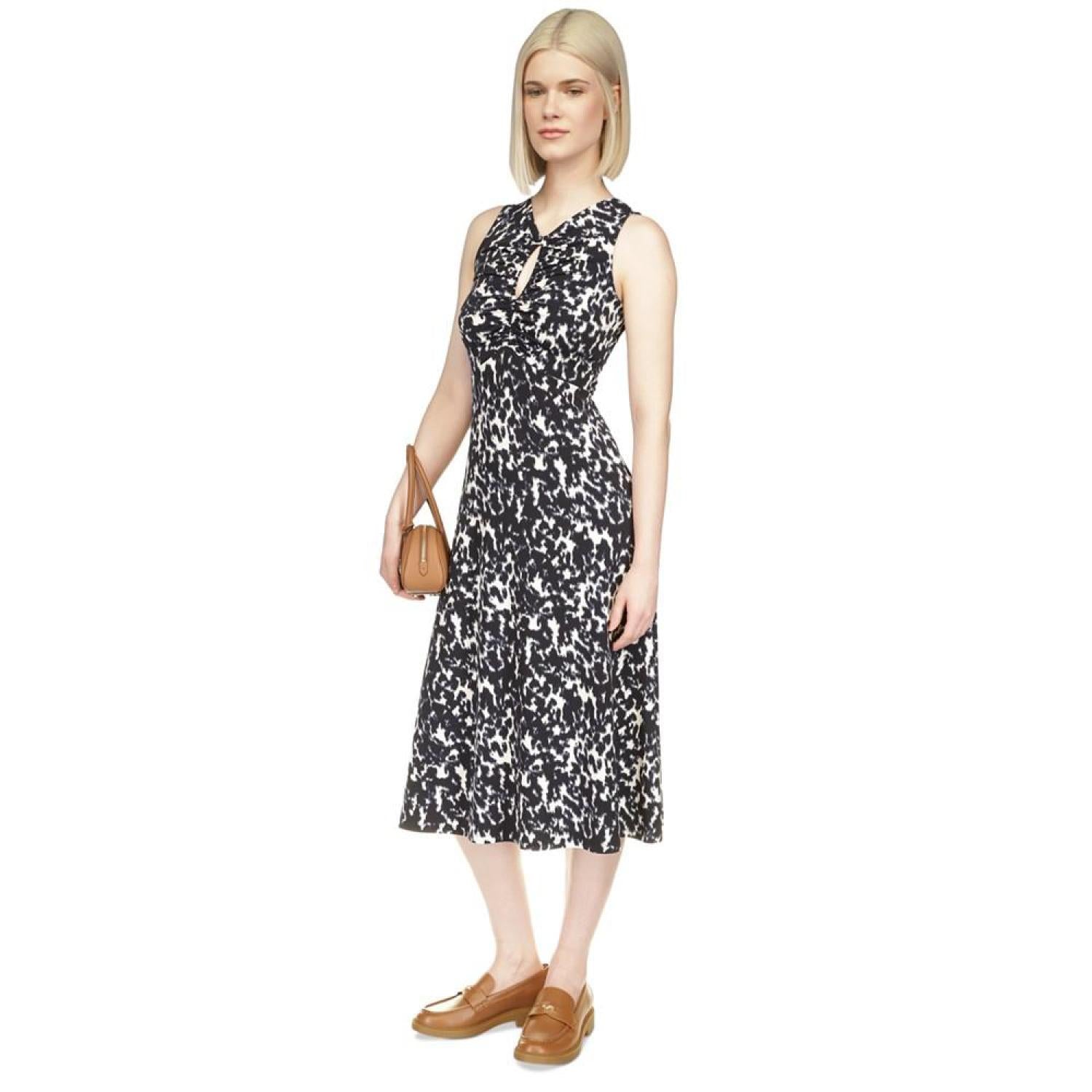 Pounce on a fierce look: MICHAEL Michael Kors' A-line midi dress accents a contemporary animal print with a chic keyhole surrounded by ruched details. Approx. 46" long from center back neck to hem Fitted through the chest and waist; structured A-line skirt sits slightly over hips V-neck with ruched keyhole; A-line silhouette Pulls on Sleeveless Allover print Unlined Polyester/elastane; lining: polyester Machine washable Imported