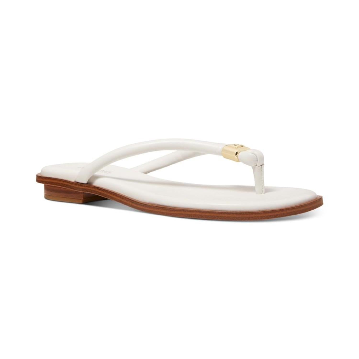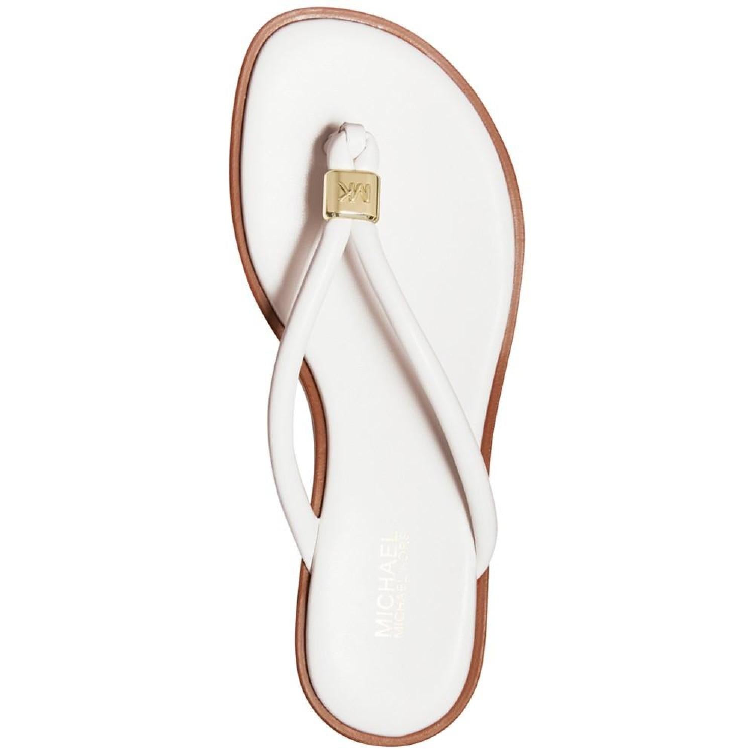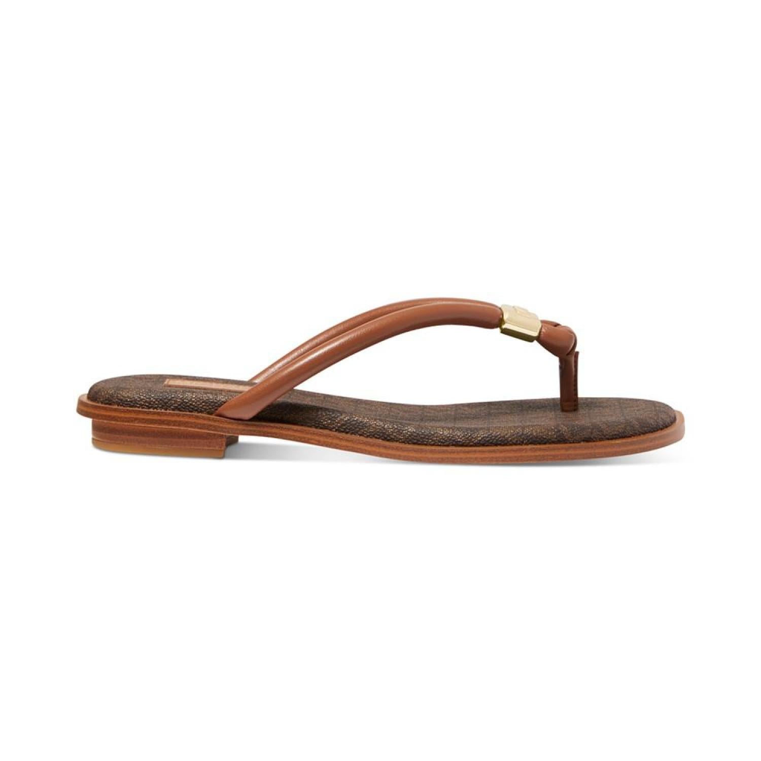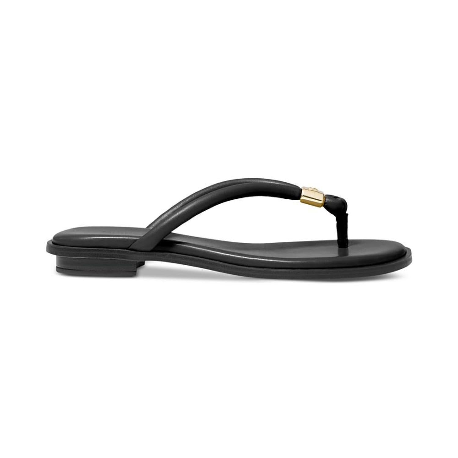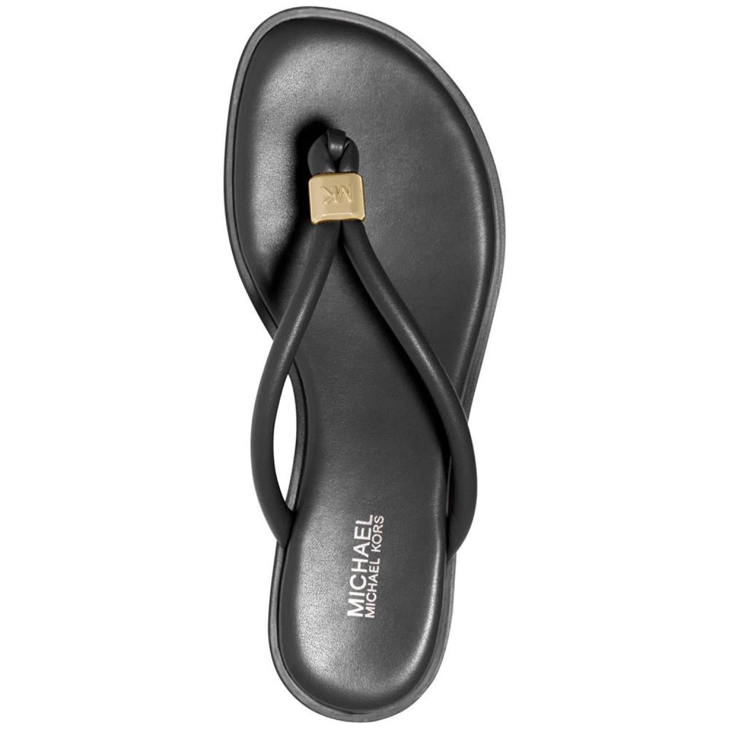 Cinched with signature style, tubular straps enhance the beautifully bare look of the Annie thong flat sandals from MICHAEL Michael Kors. 1/4" stack-look heel Round-toe thong slip-on sandals Signature charm at strap Manmade or metallic manmade uppers; manmade lining; rubber sole Imported