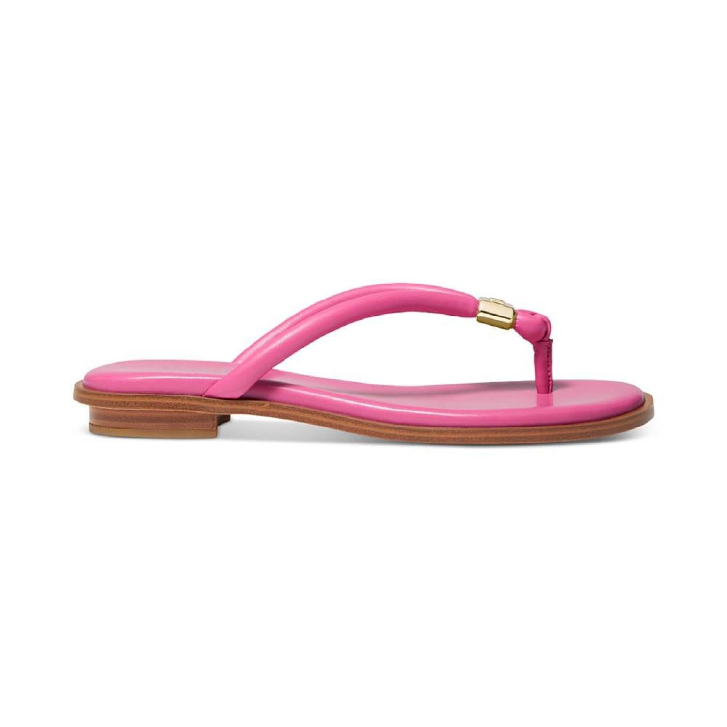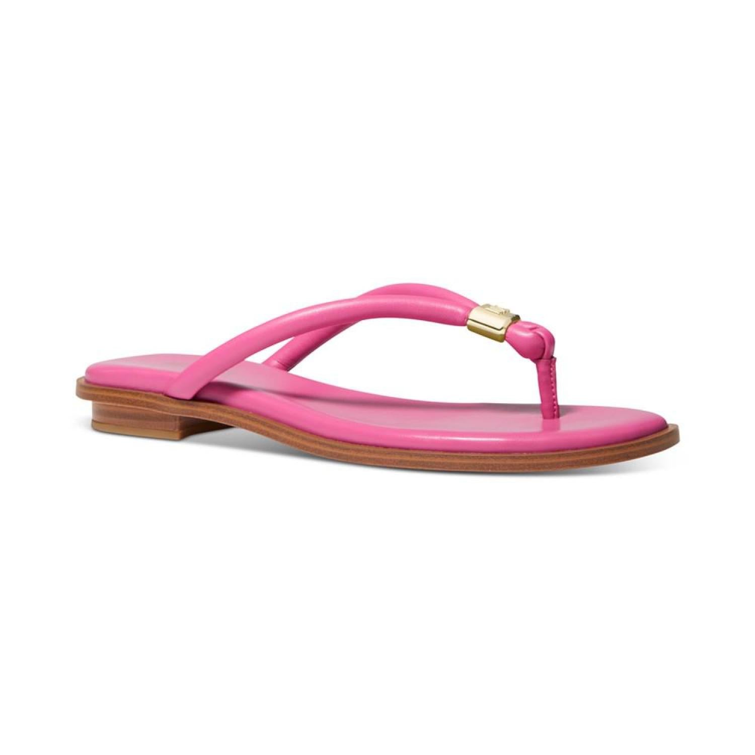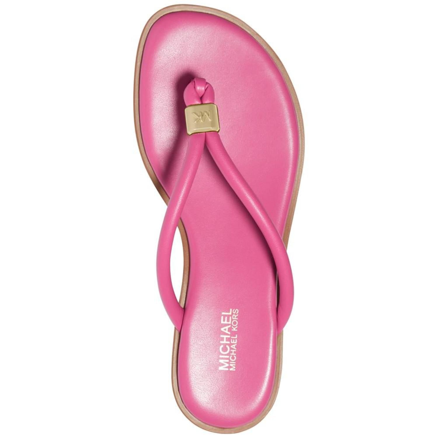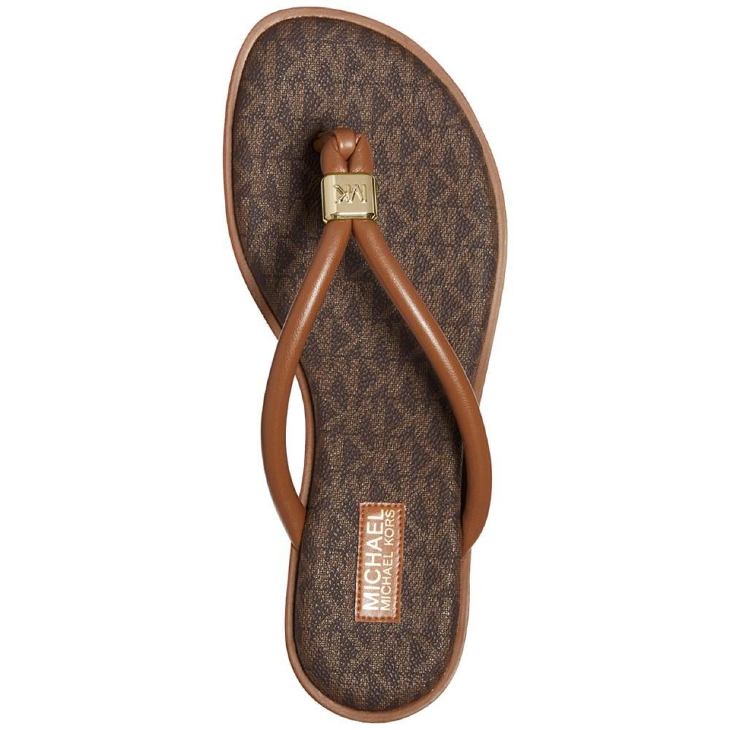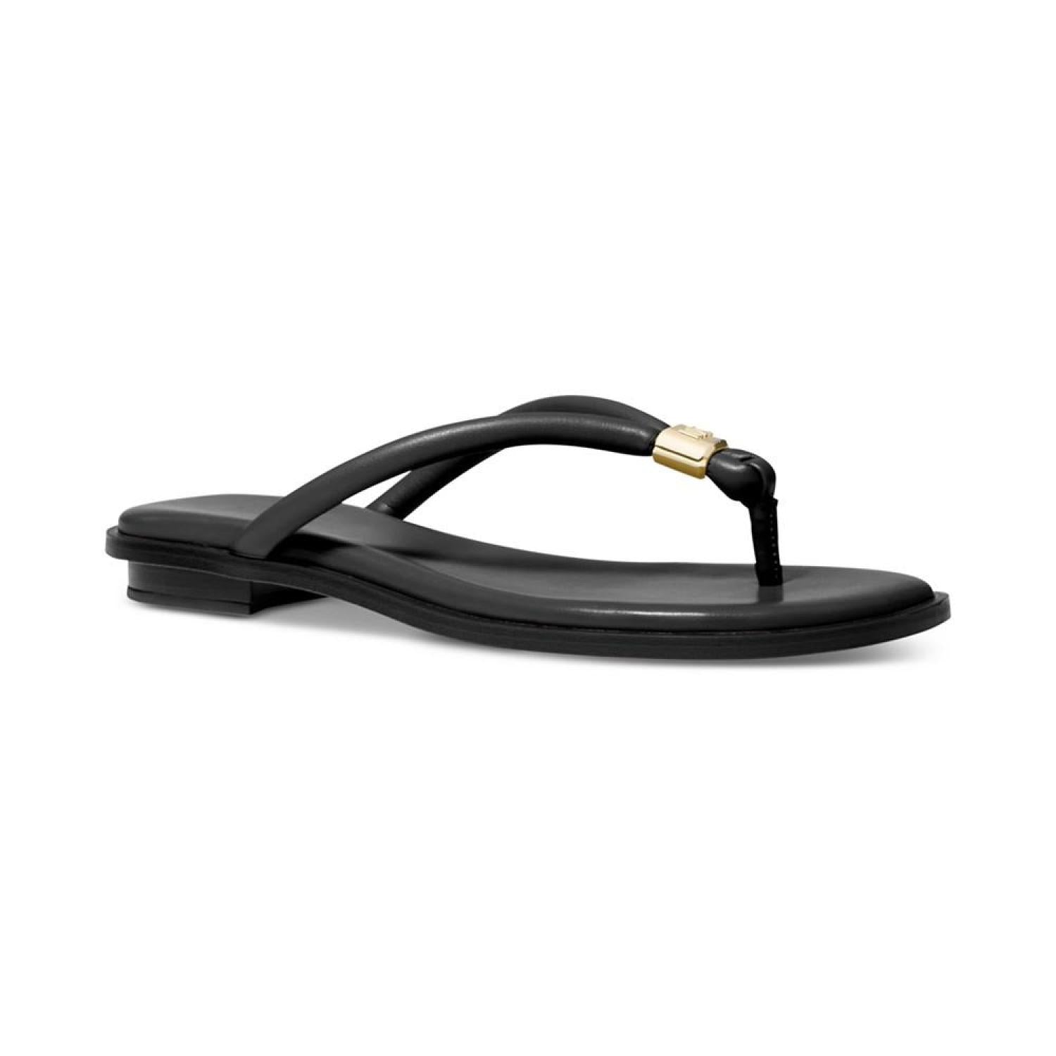 Cinched with signature style, tubular straps enhance the beautifully bare look of the Annie thong flat sandals from MICHAEL Michael Kors. 1/4" stack-look heel Round-toe thong slip-on sandals Signature charm at strap Manmade or metallic manmade uppers; manmade lining; rubber sole Imported