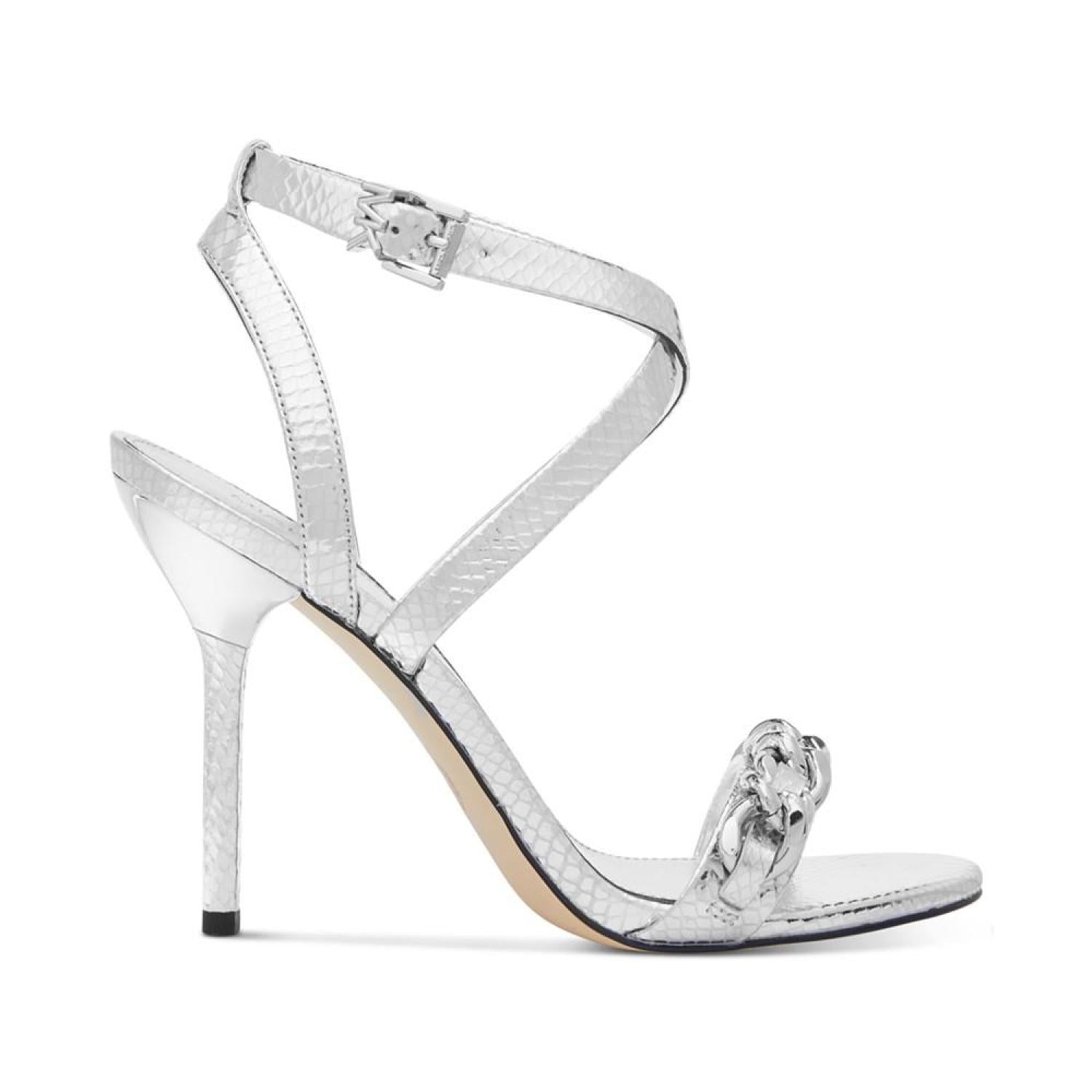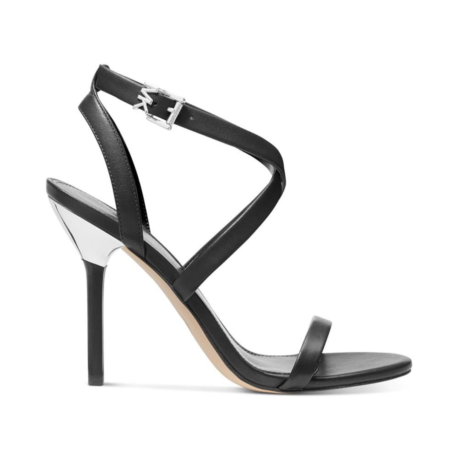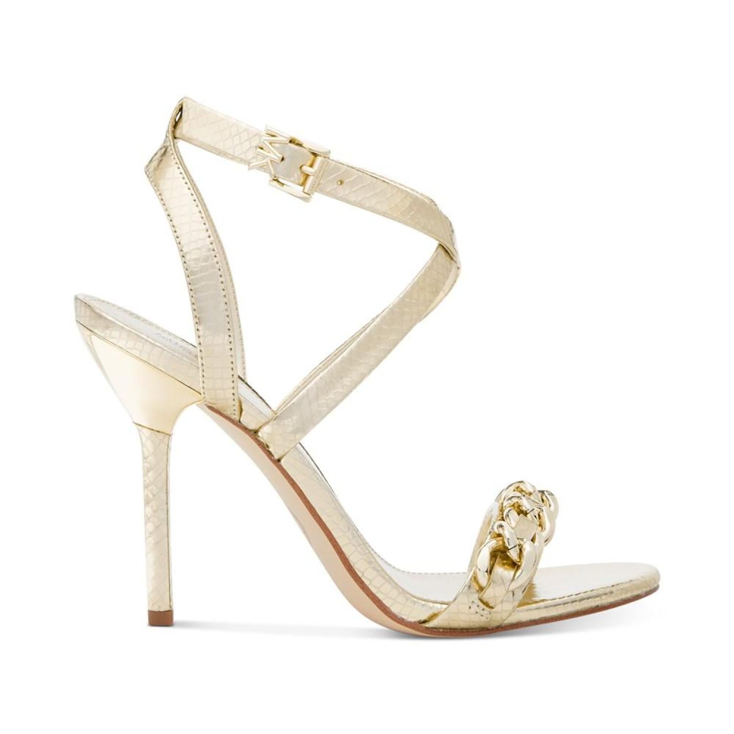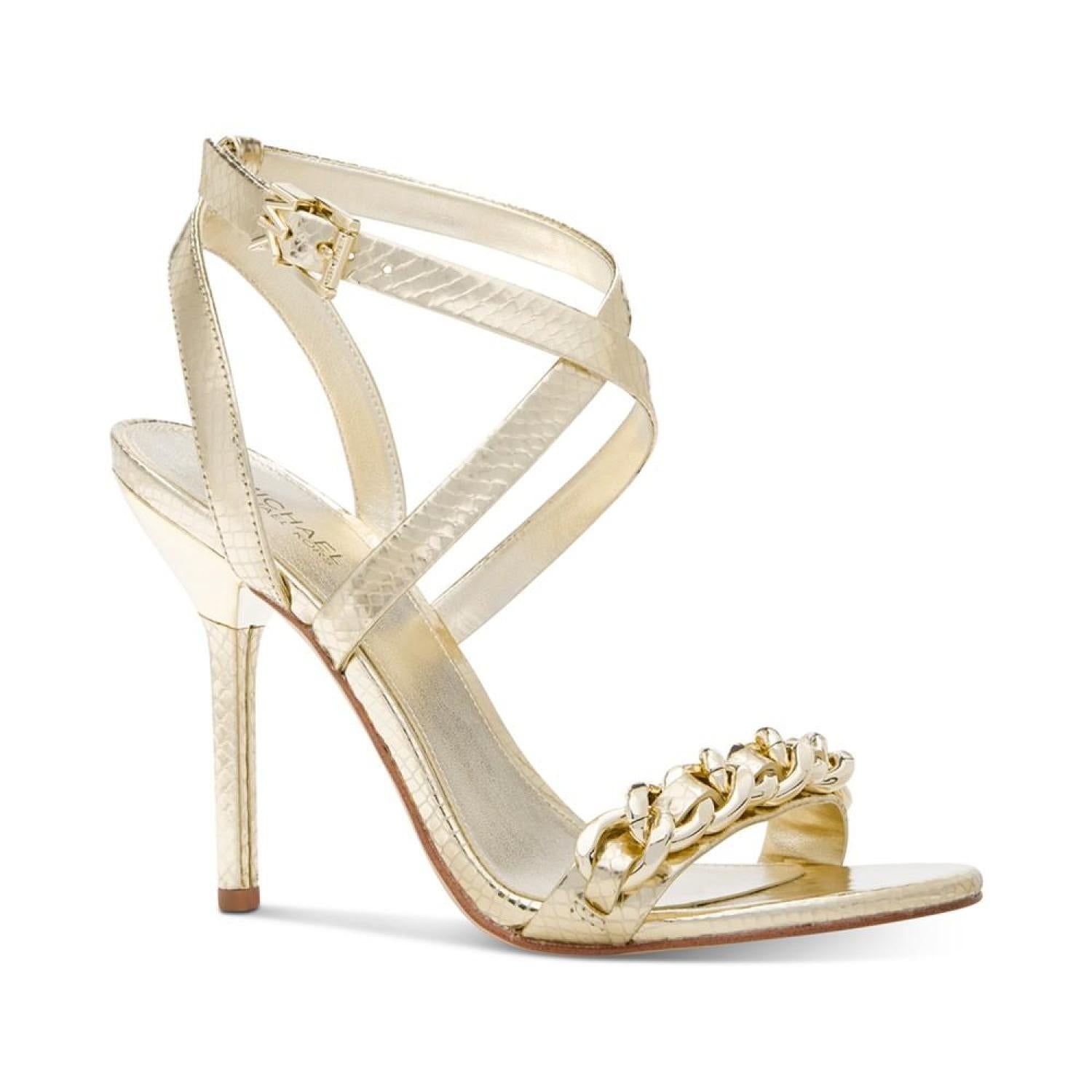• Crisscrossing ankle straps set atop metallic shine in the sleek silhouette of the Asha sandals from MICHAEL Michael Kors.