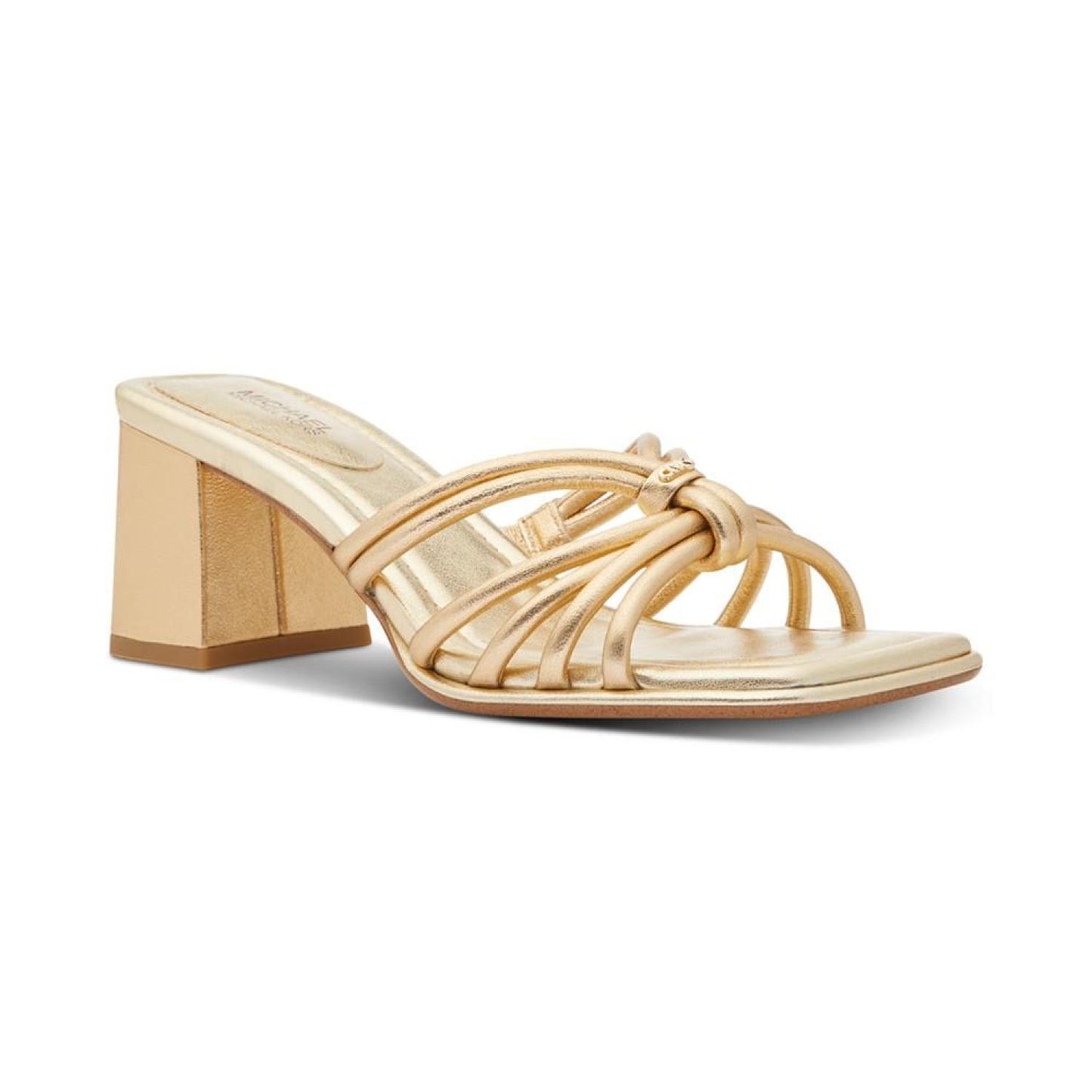 • Logo hardware secures a strappy silhouette over lacquered heels in the MICHAEL Michael Kors Astra sandals.