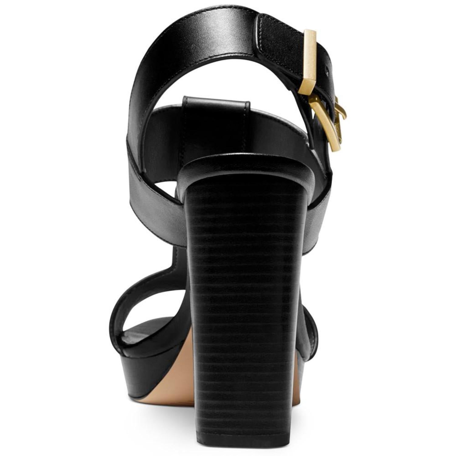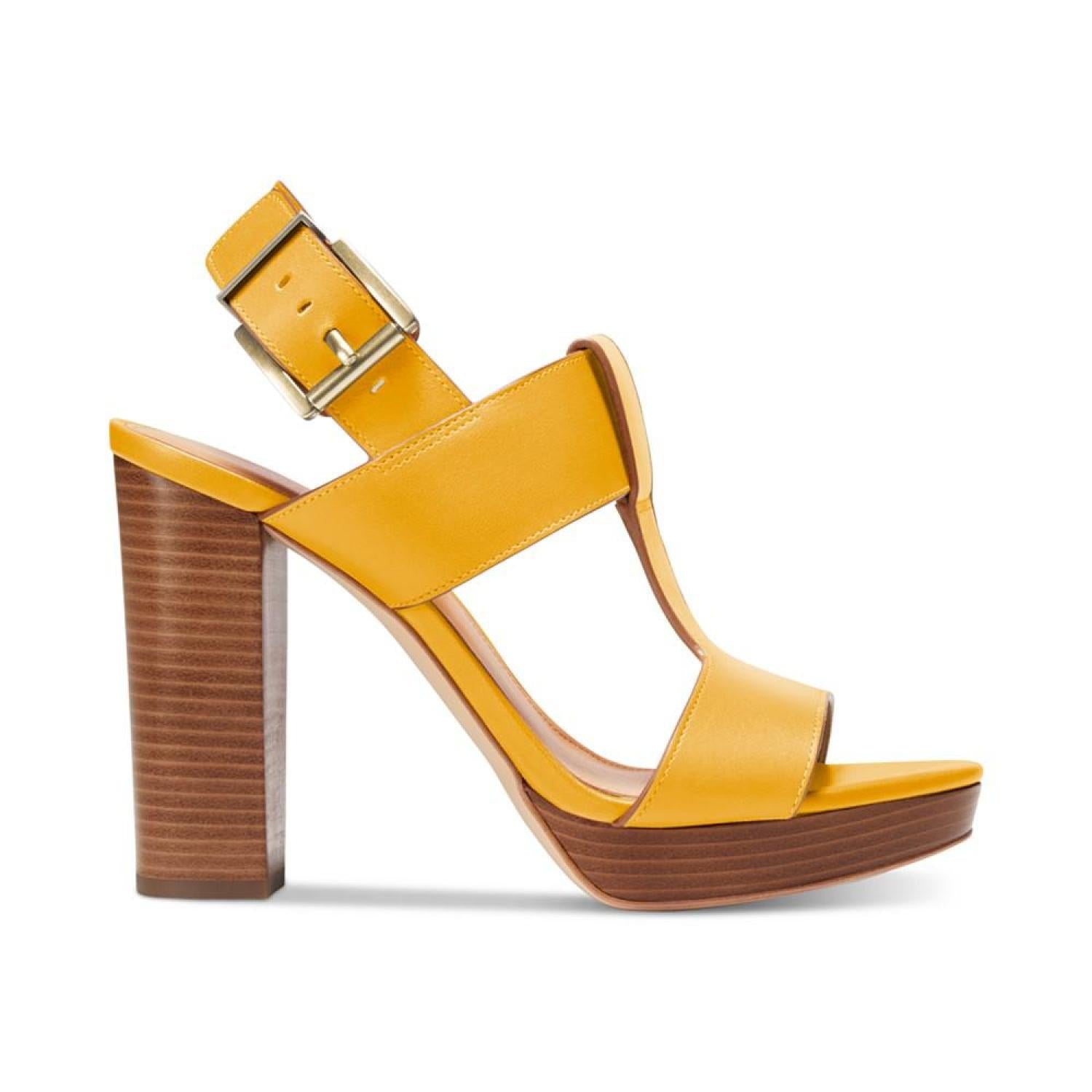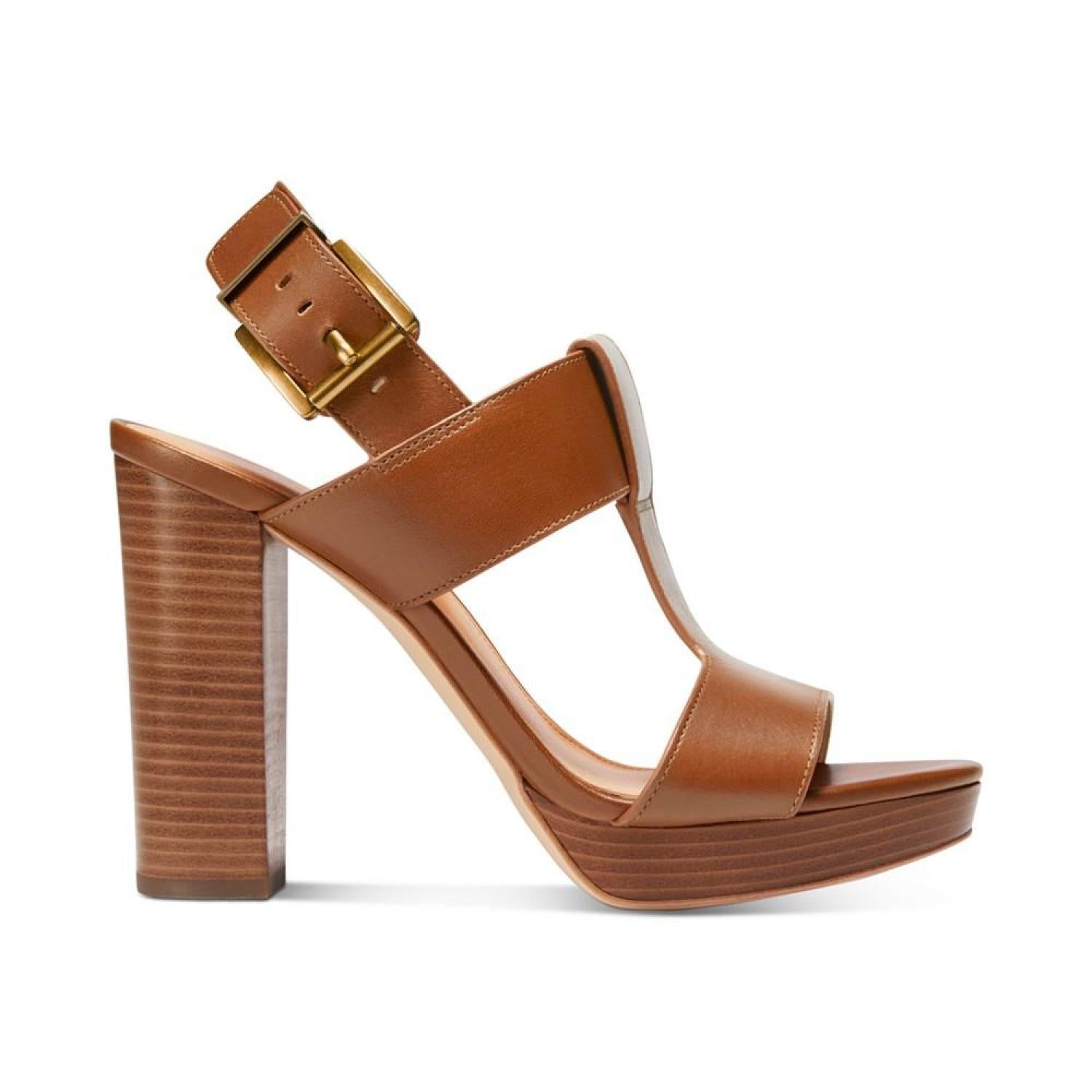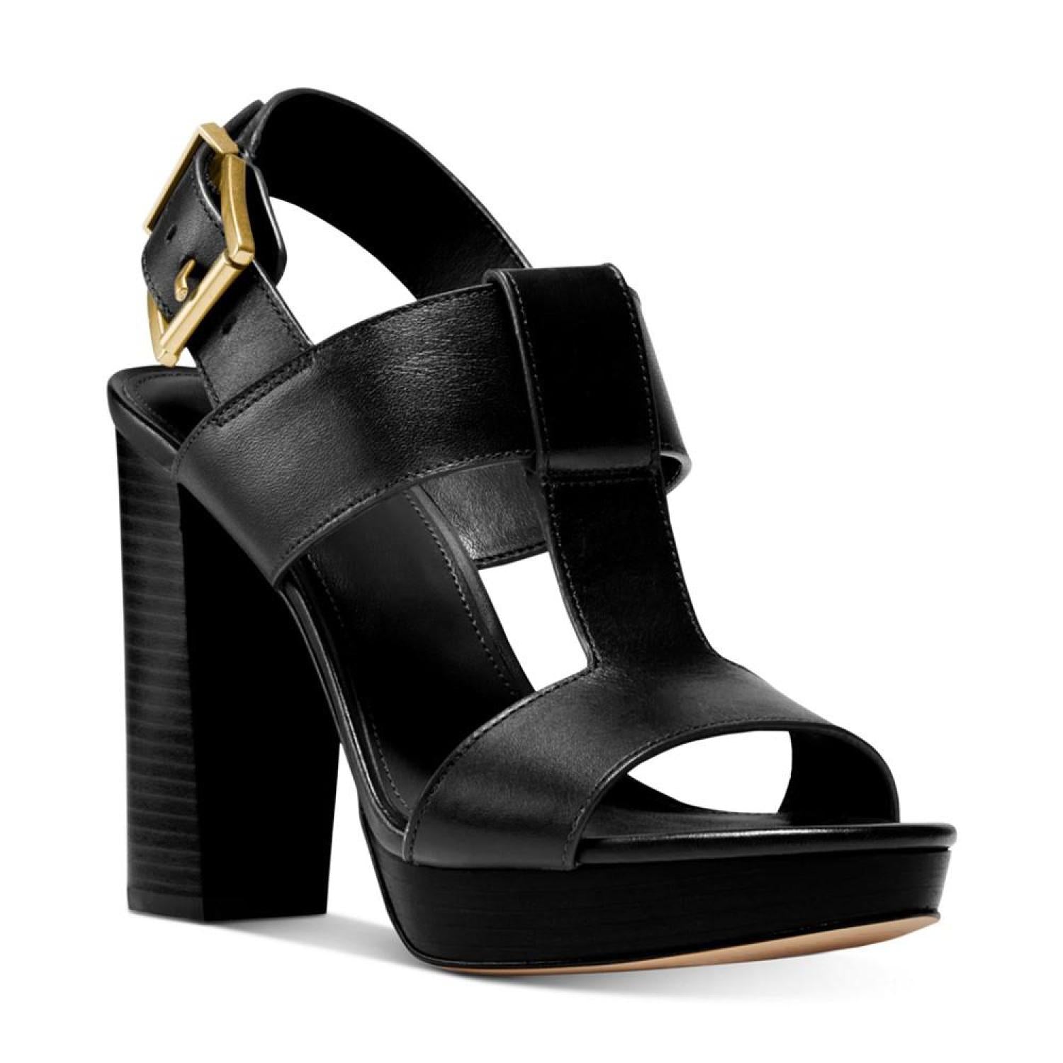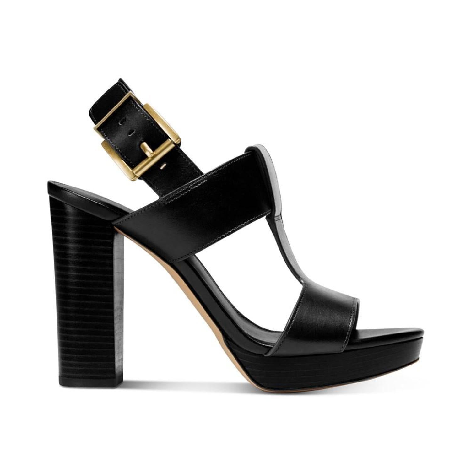 A wide T-strap and sturdy slingback stylishly secure the stunning platform height of the Becker sandals from Michael Michael Kors. 4" heel; 3/4" platform Round-toe T-strap slingback platform dress sandals with adjustable buckle closure Leather upper; rubber sole Imported