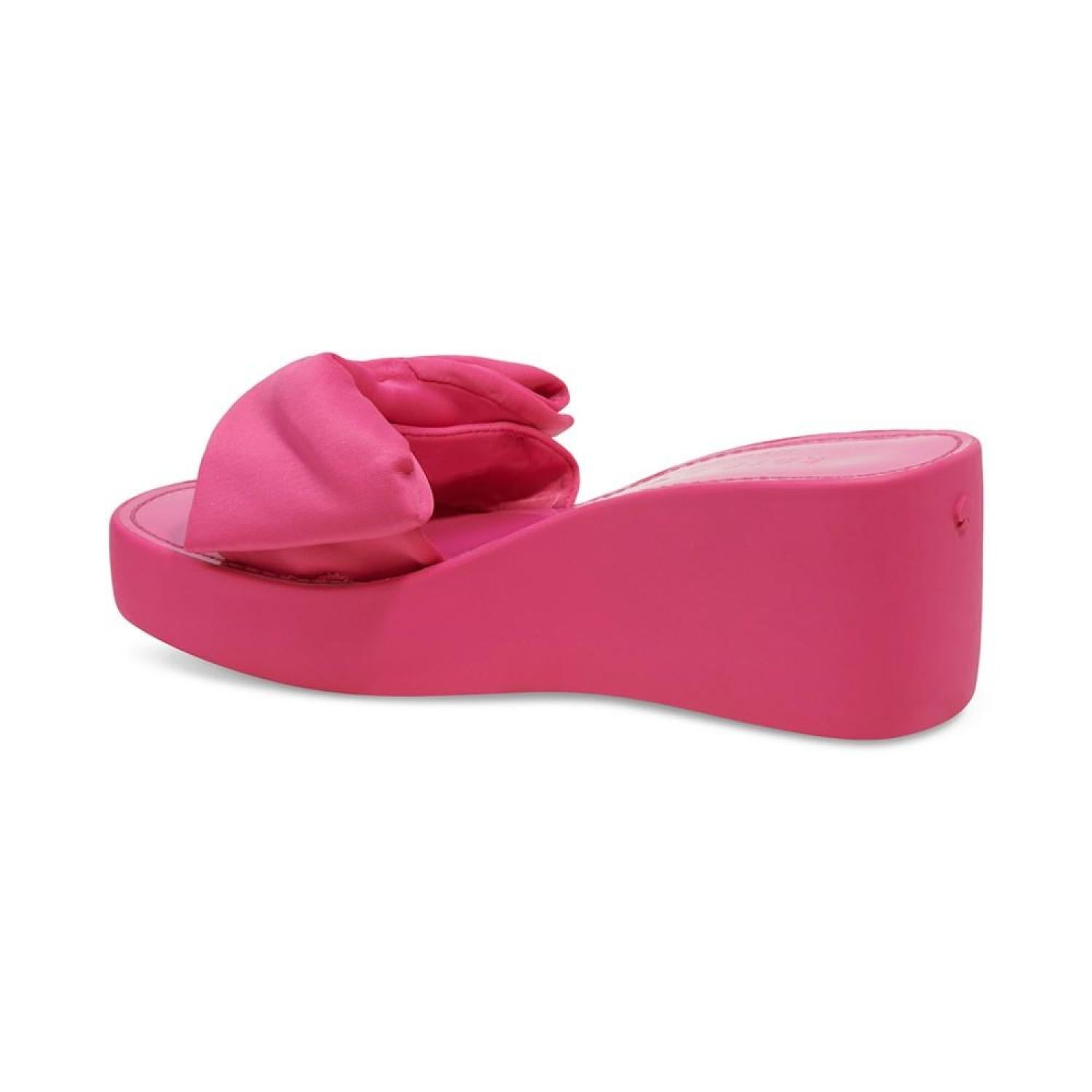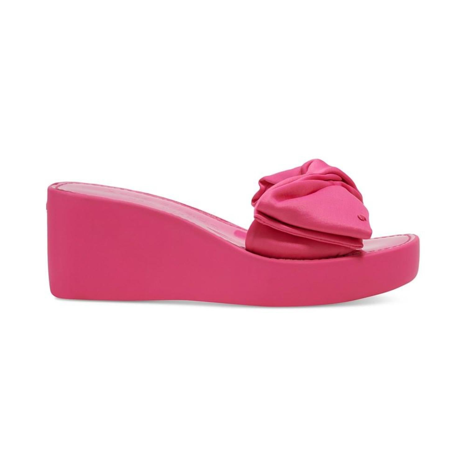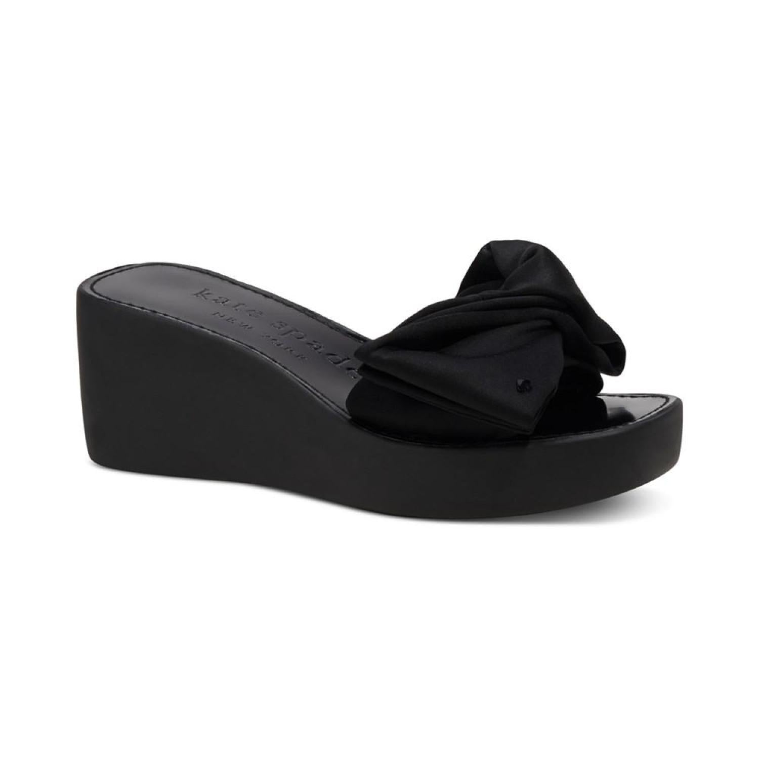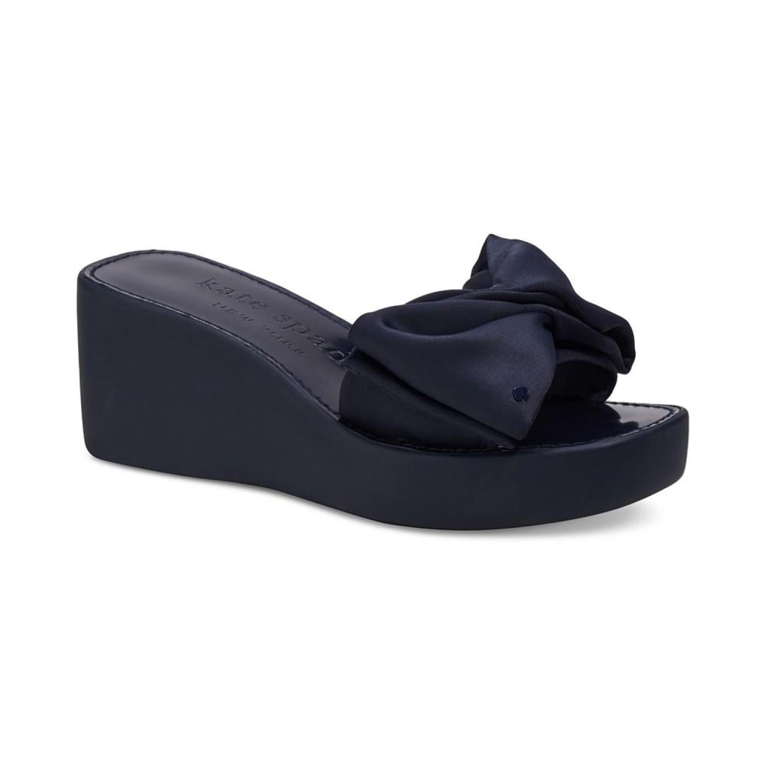 A pool-ready look gets topped with dimensional bows in the fresh style of the Kate Spade New York Bikini platform wedges. 2-3/4" wedge heel; 1" platform Round-toe slip-on platform wedge sandals Bow detail at strap Fabric upper; fabric lining; rubber sole Imported