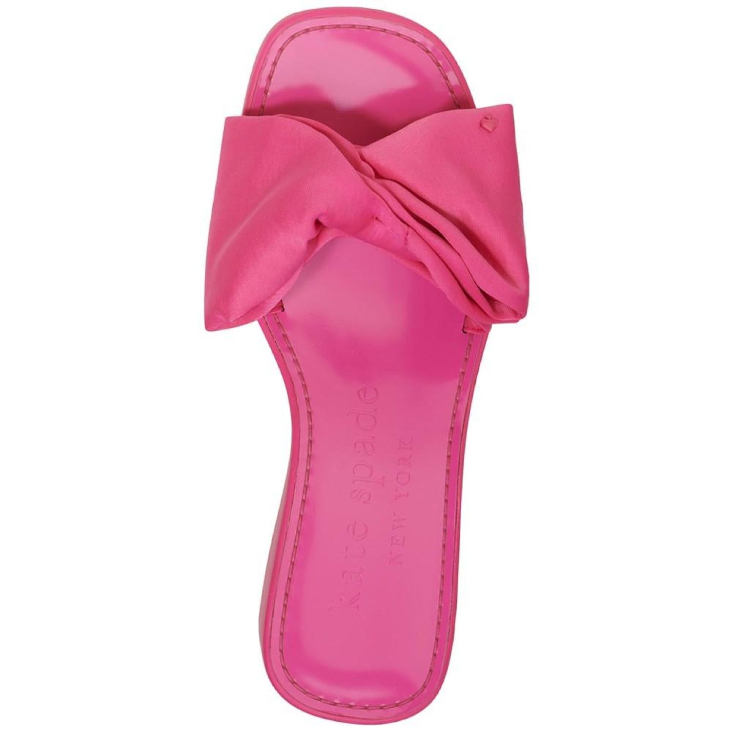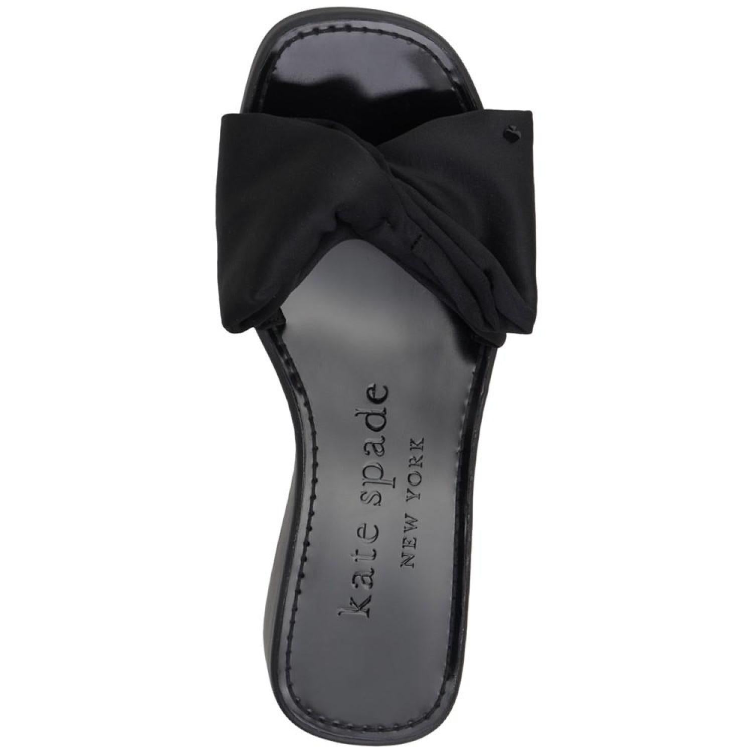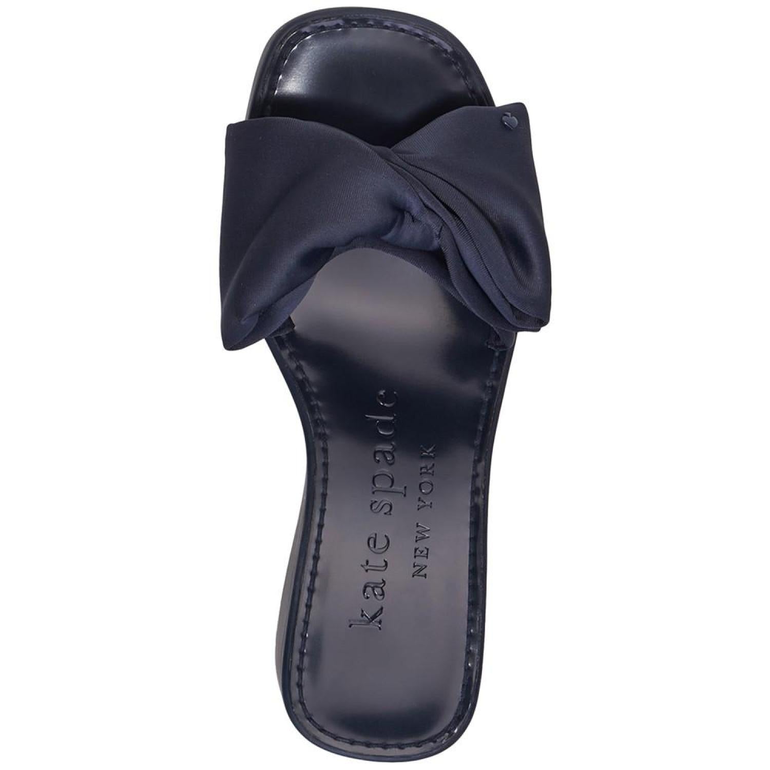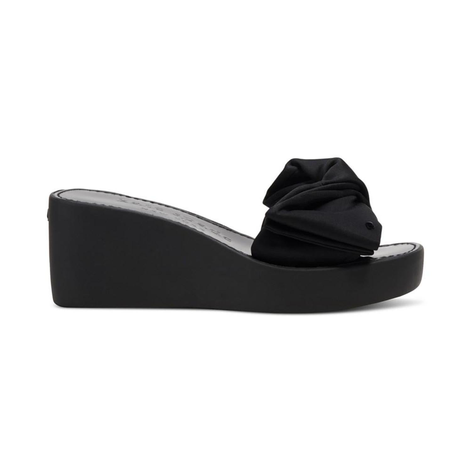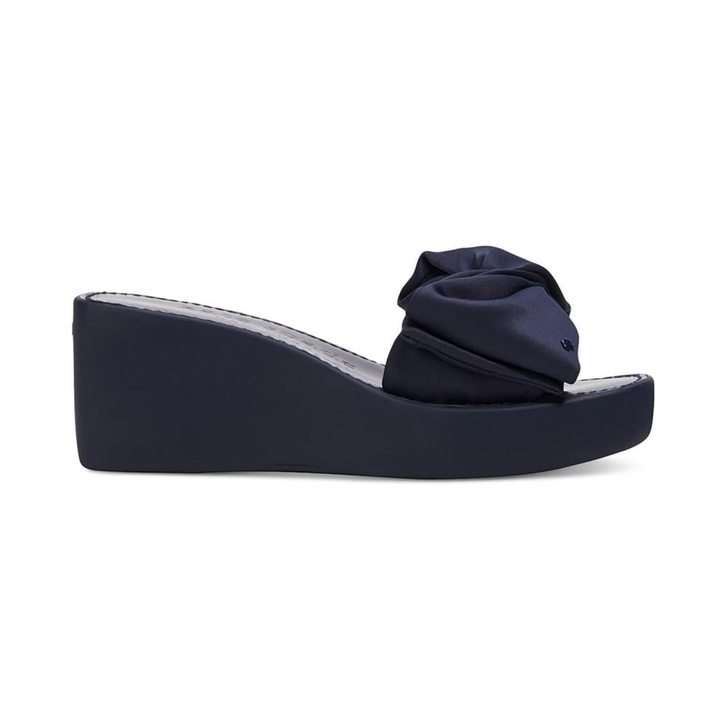 A pool-ready look gets topped with dimensional bows in the fresh style of the Kate Spade New York Bikini platform wedges. 2-3/4" wedge heel; 1" platform Round-toe slip-on platform wedge sandals Bow detail at strap Fabric upper; fabric lining; rubber sole Imported