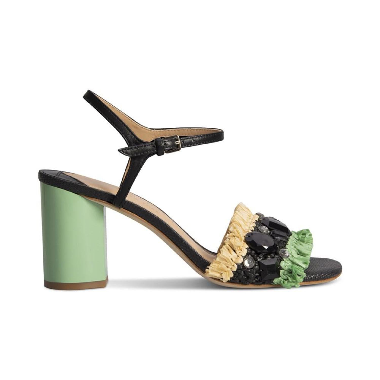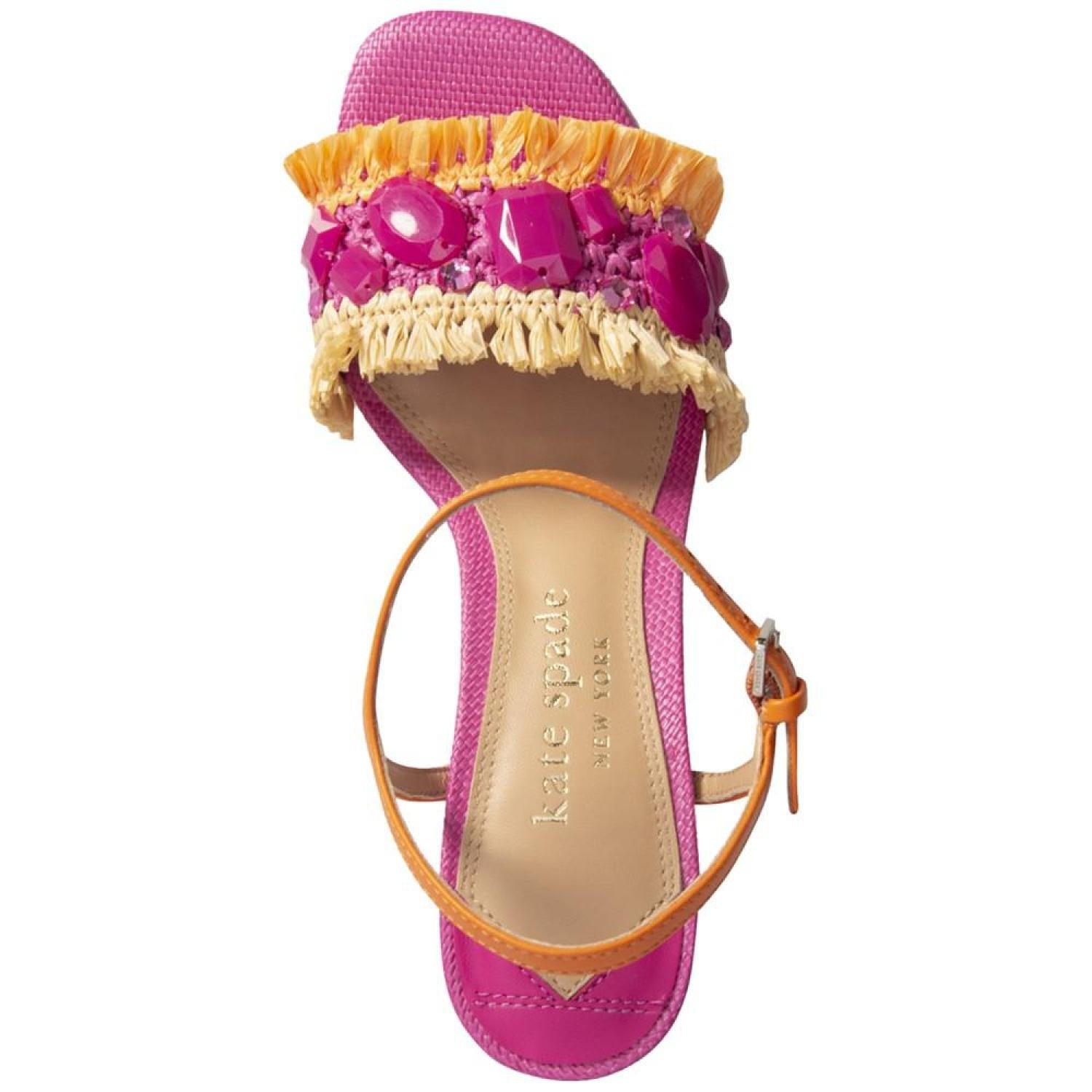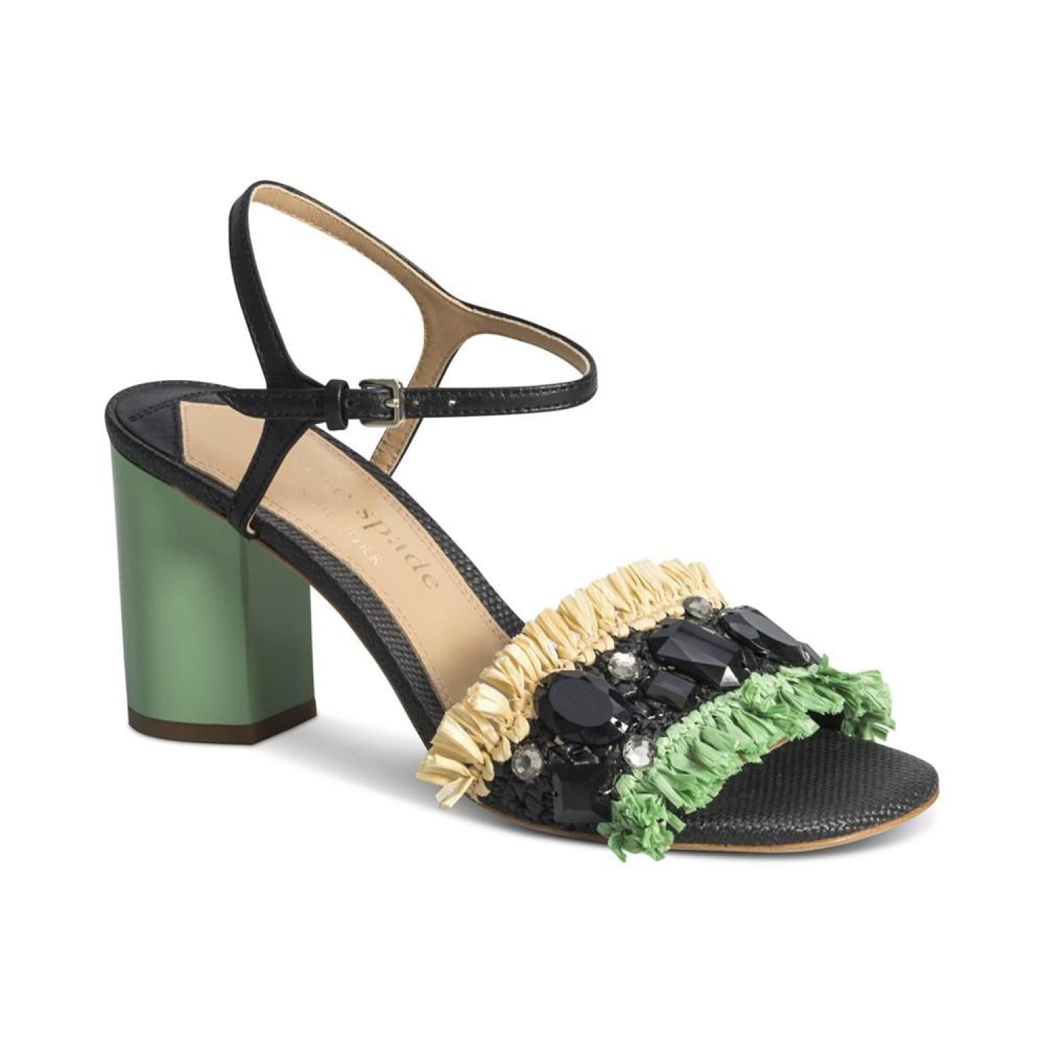 • Fringe and beads add airy dimension to colorful stacked heels in the fun Bora Bora sandals from Kate Spade New York.