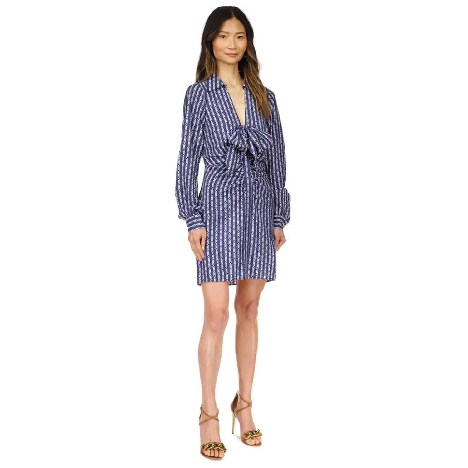 The key to a chic look: MICHAEL Michael Kors' chain-print dress, featuring a tie front. Approx. 36" long at front from high point of shoulder Point collar Hidden side zipper Long sleeves Tie at front Lined Shell: viscose, nylon; lining: 100% cotton Dry clean Imported