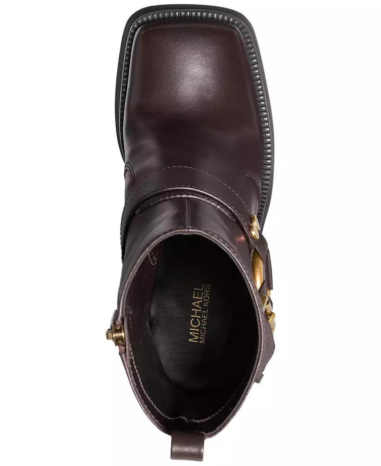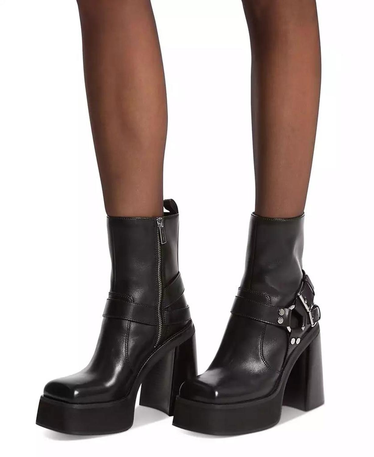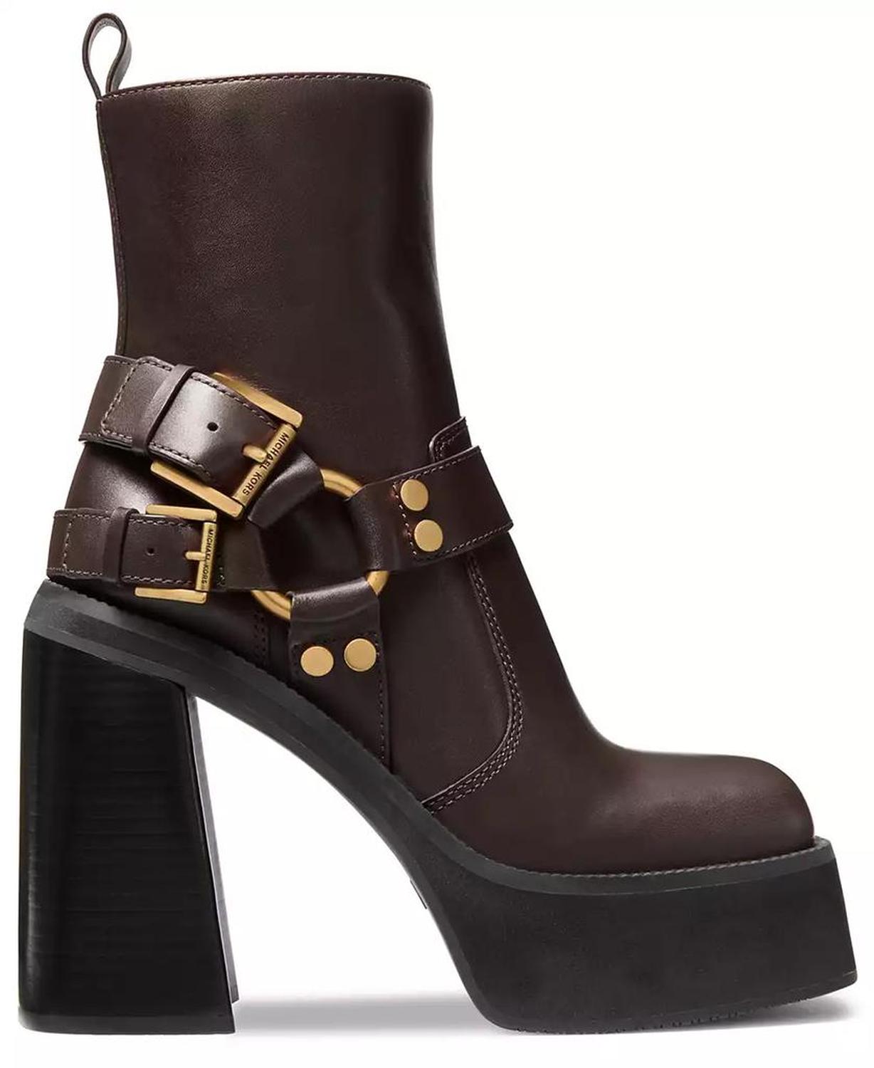 A moto boot with retro flair, the Crosby leather booties by MICHAEL Michael Kors combines classic harness detailing with a soaring platform and heel reminiscent of '70s style. Stacked heel: 5"; platform: 1-3/4" Square toe Side zipper with buckle detail Upper: 100% leather; lining: 100% polyester; sole: 100% rubber Imported