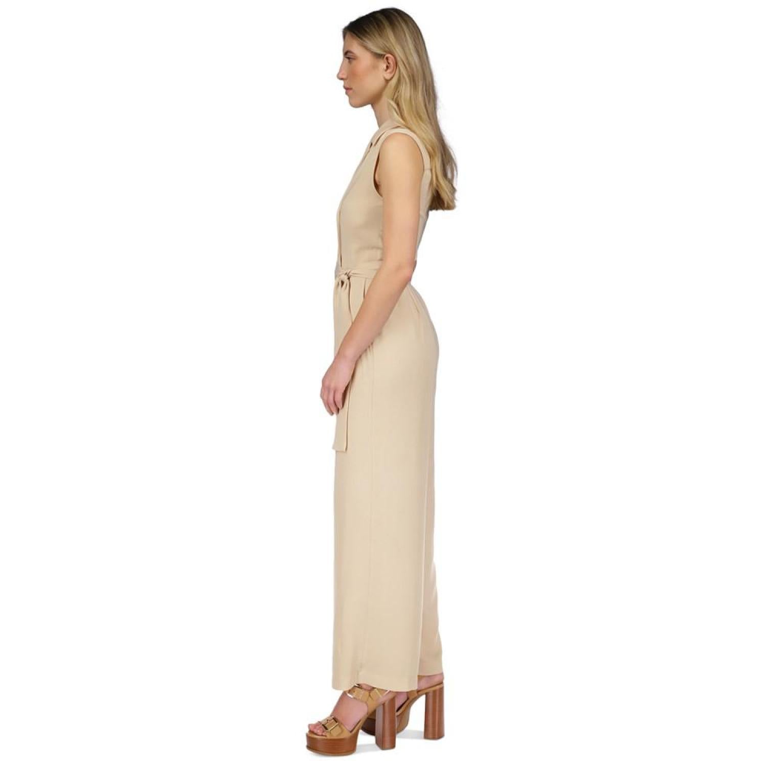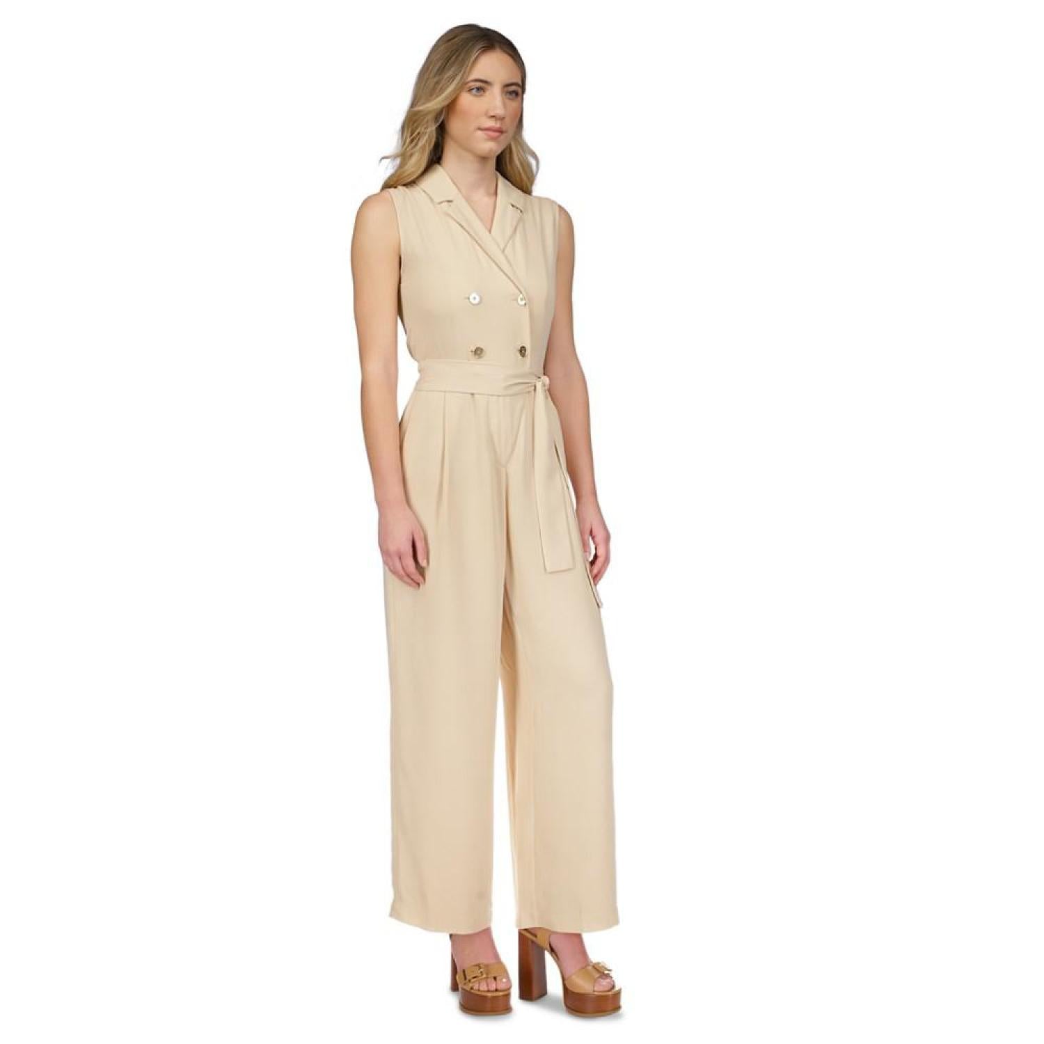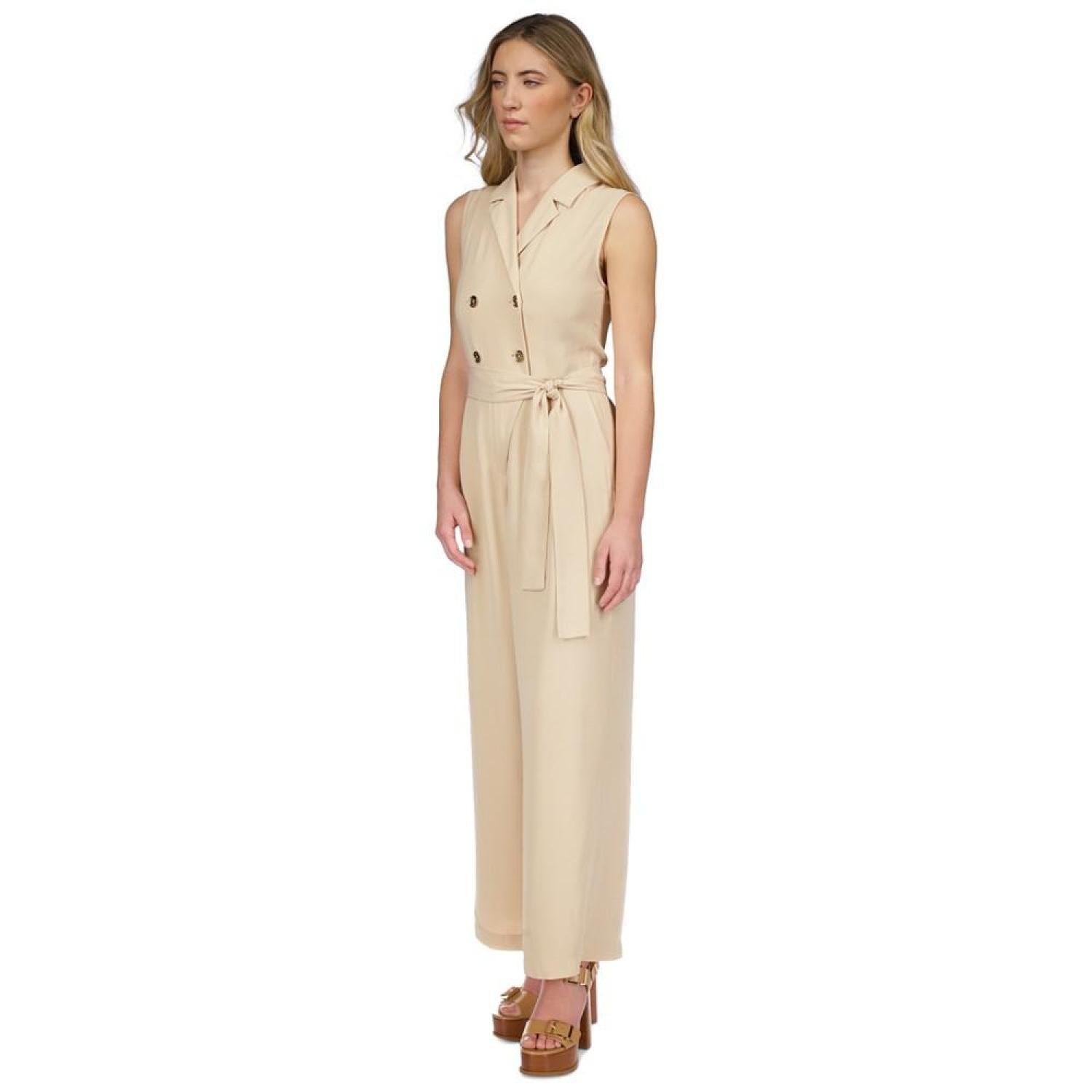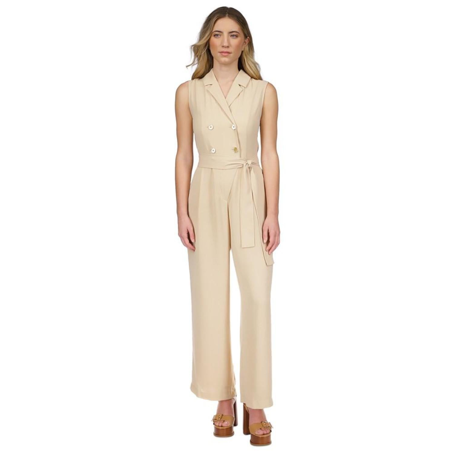 You're out the door in no time with this effortless look from MICHAEL Michael Kors, a crepe jumpsuit with a tailored bodice and drapey flow. Approx. inseam: 28-1/2" Front rise: approx. 12-7/8"; back rise: approx. 17-5/8" Notch lapels; front button closure Tie at waist Slant pockets at hips Sleeveless Polyester; lining: polyester Machine washable Imported