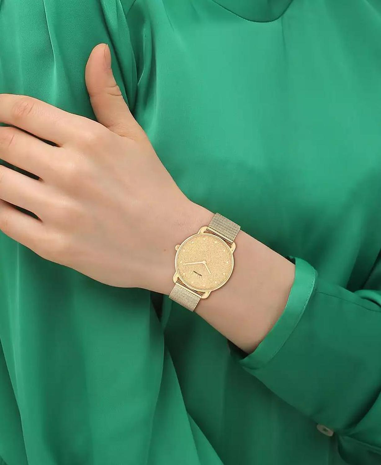 With clean lines and a modern minimalist sensibility, the Elliot is a true design classic ready for workdays and weekends. Finished with a shimmering mesh bracelet, this gold tone design features a glittery shimmer dial detailed with polished dome markers. SKU# 14504553