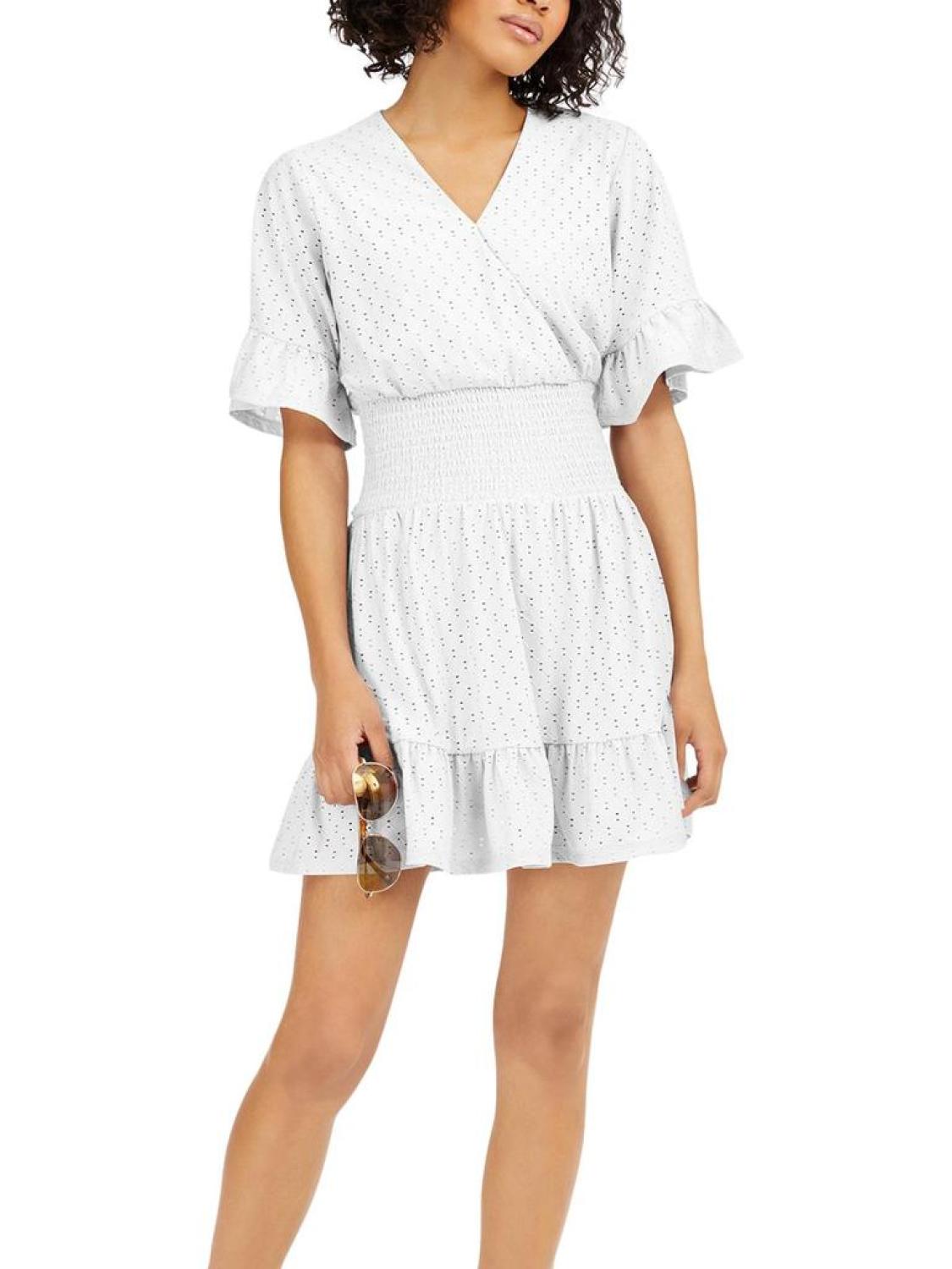 Manufacturer - MICHAEL Michael Kors Retail - $135.00 Style Type - Casual Dress Collection - MICHAEL Michael Kors Sleeve Length - Short Sleeves Closure - Pullover Material - 94% Polyester/6% Elastane Fabric Type - Eyelet Specialty - Smocked P2507664The item for sale is pictured above and described on this page. The photo may include additional clothing or props that are for display purpose only and will not be included. Please be sure to read the description carefully.