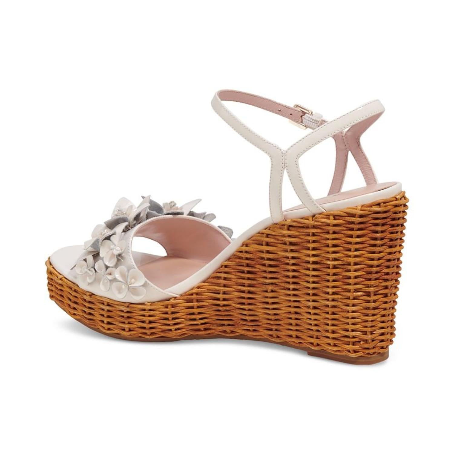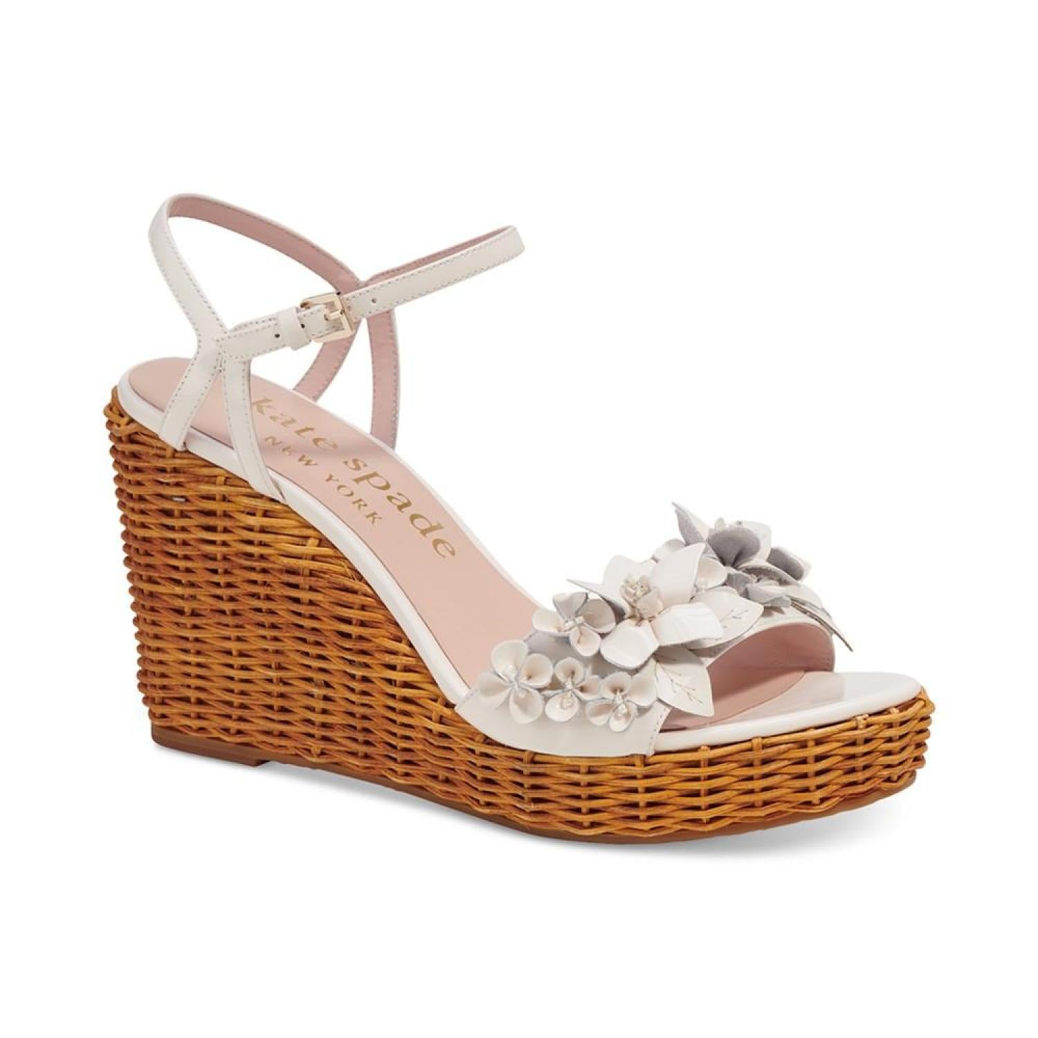 Floral accents and basketweave heels bring whimsical dimension to a dressy lift in the Fiori sandals from Kate Spade New York. 3" espadrille wedge heel; 1-1/2" platform Round-toe ankle-strap espadrille platform wedge sandals with adjustable buckle closure Dimensional accents at straps; basketweave detailing at platform heel Leather upper; leather lining; straw sole Imported
