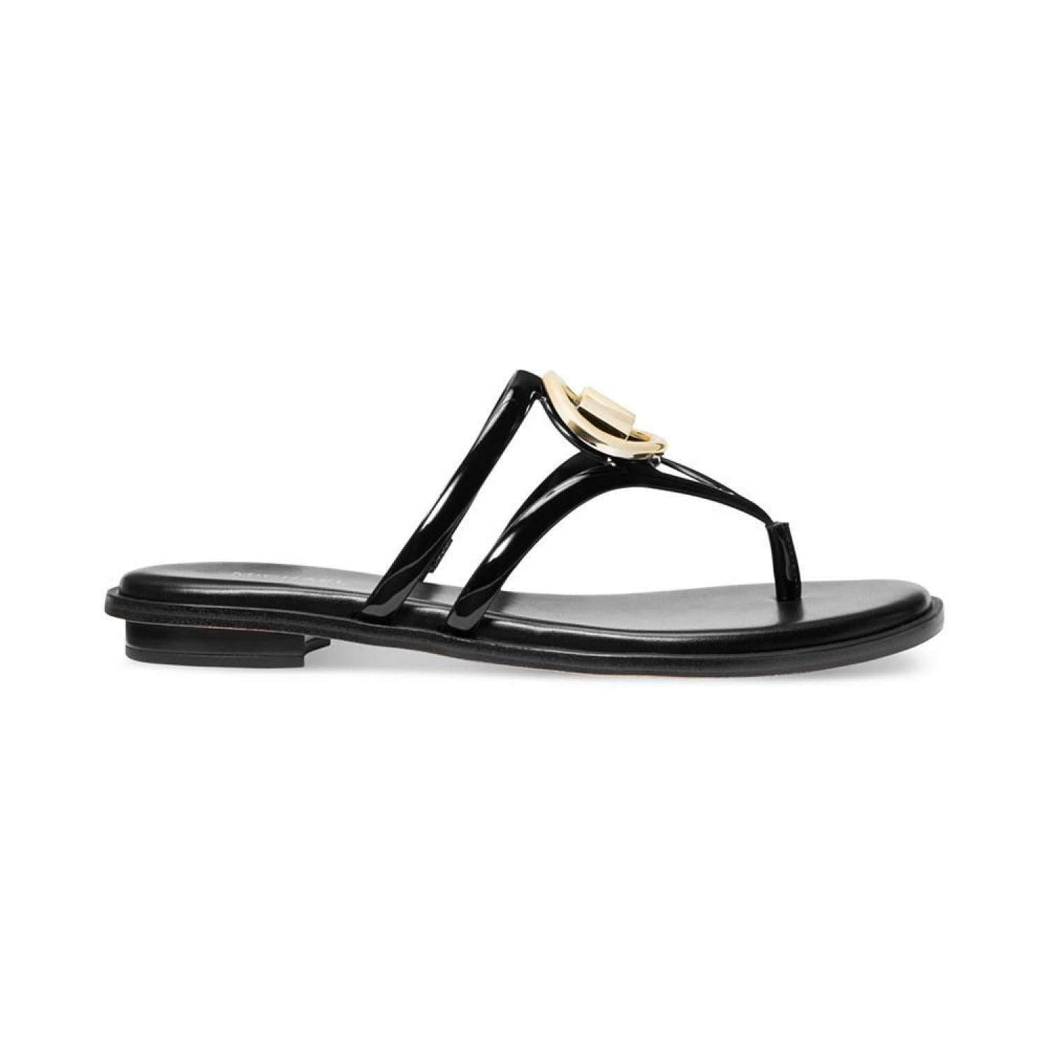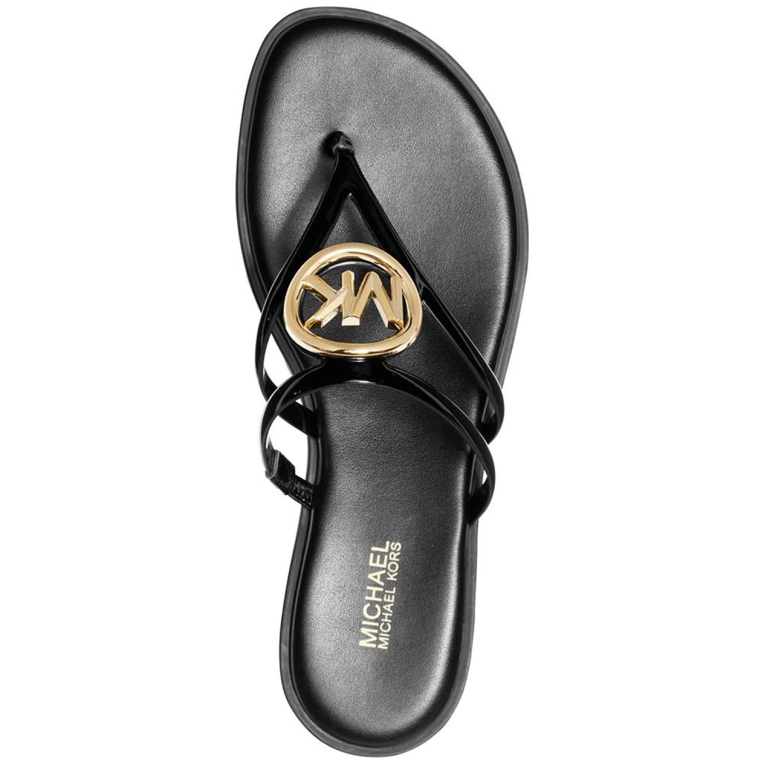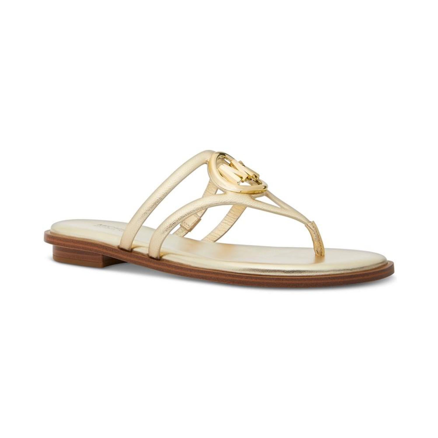 Signature logo hardware adds gold-tone flash to a warm-weather staple in the easy slip-on stylings of the MICHAEL Michael Kors Hampton sandals. 1/4" heel Round-toe slip-on slide sandals Hardware detail at strap Manmade upper; manmade lining; rubber sole Imported