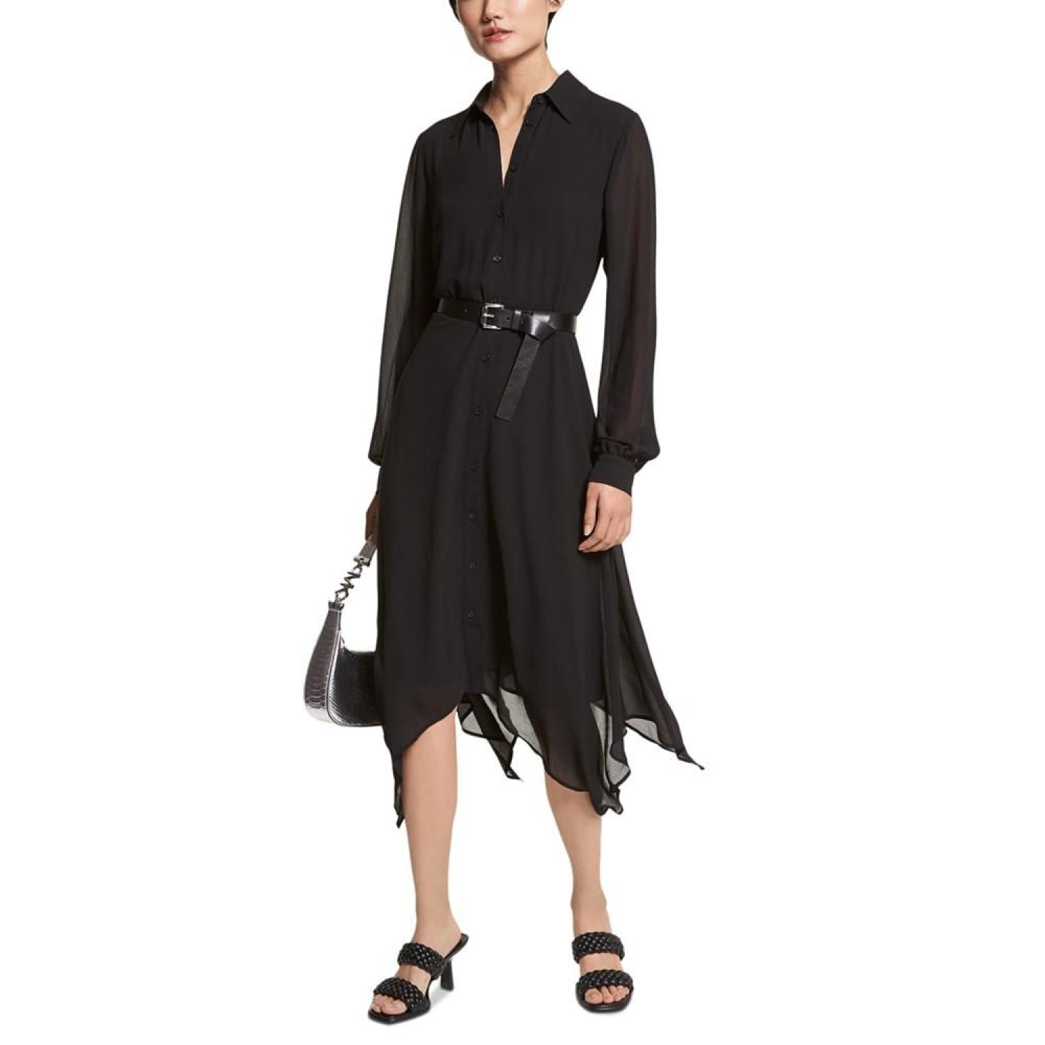 An elegant update on the shirtdress, this MICHAEL Michael Kors midi features sheer sleeves, a leather belt and a chic handkerchief hem. Approx. 50" long from center back neck to hem Button-front dress Spread collar Button closure at front Buckle leather belt; handkerchief hem Long sheer sleeves Lined body Shell, lining: polyester; belt: leather Machine wash Imported