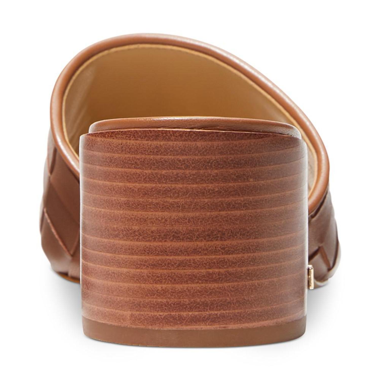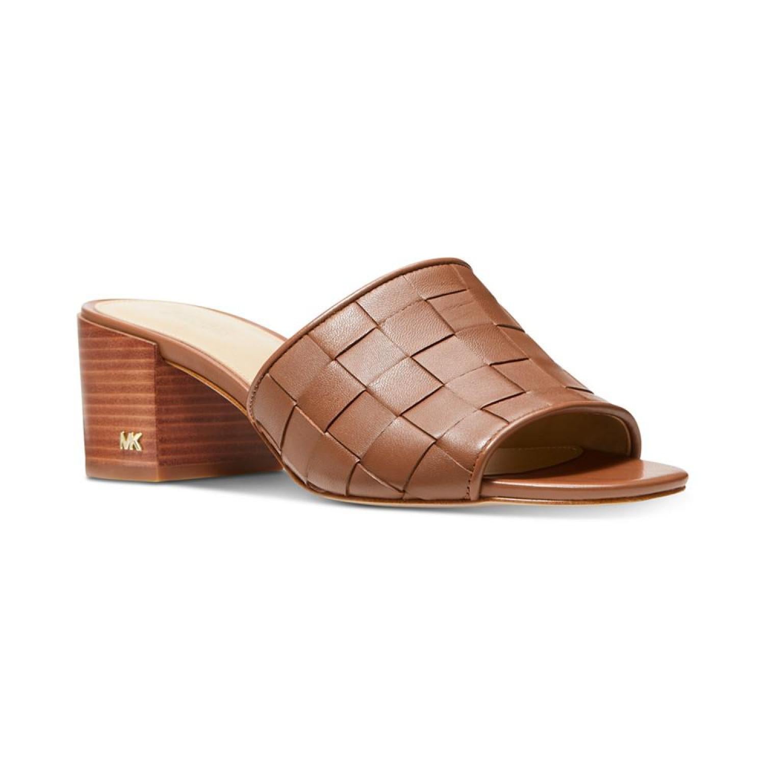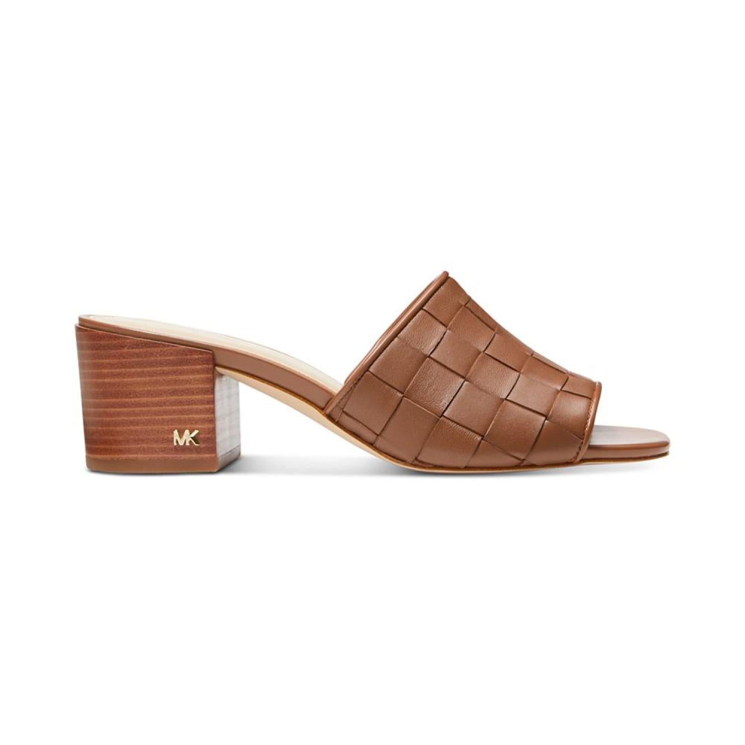 • A single wide woven strap tops sensible stacked heels for a go-to dressy look in the Ingrid sandals from MICHAEL Michael Kors.