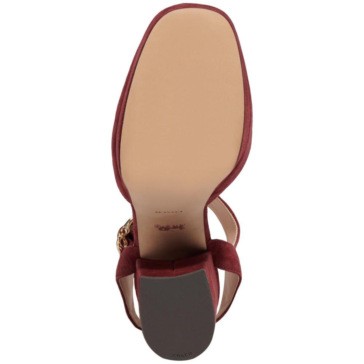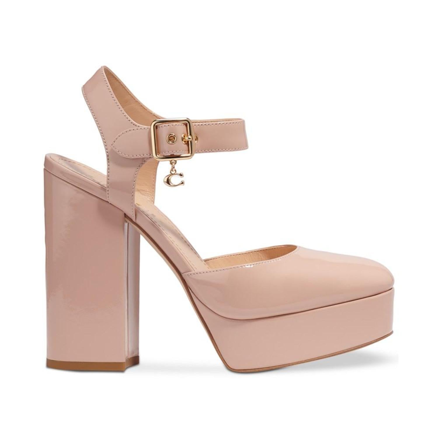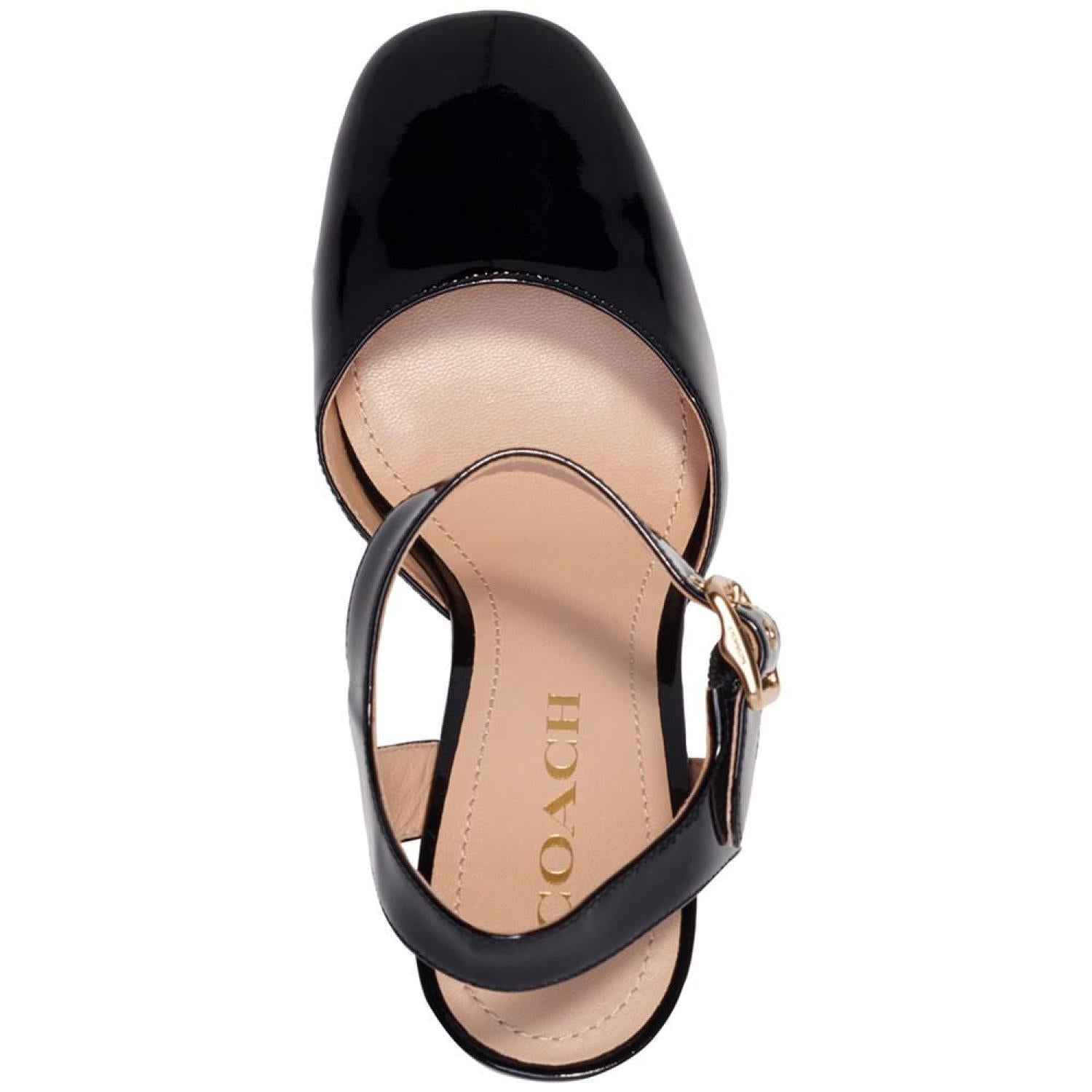 • Patent leather adds smart polish to towering platform heels in the gorgeous Isabella ankle-strap pumps from COACH.