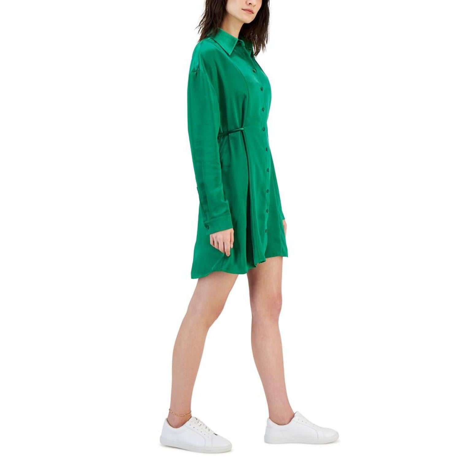 HUGO brings this fashionable, button-down dress and elevates the fit with figure-flattering self-ties to cinch in the waistline. Approx. 34-1/2" long Point collar Button closures down front Long sleeves Fitted waist with self-tie closure at back Polyester Hand wash Imported