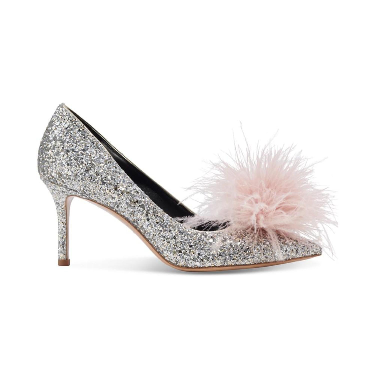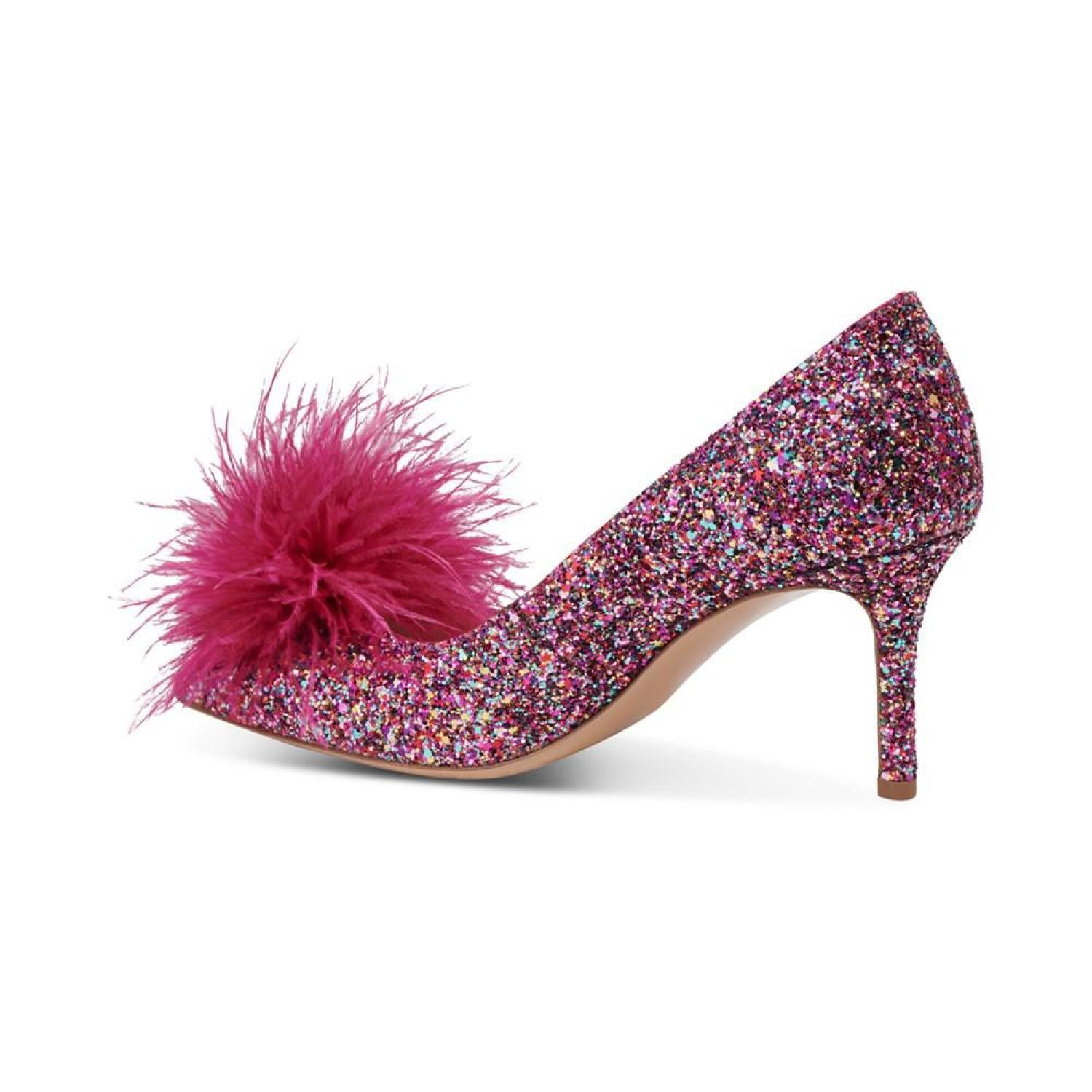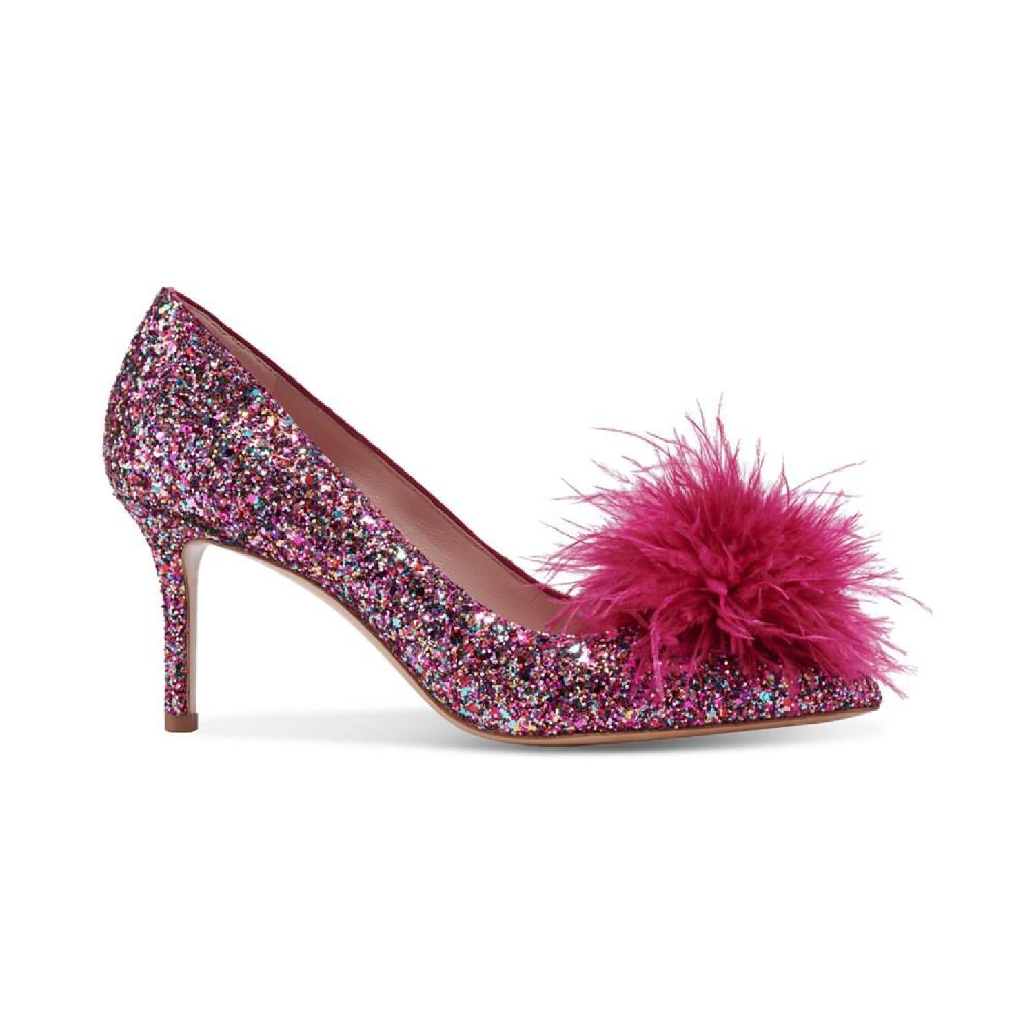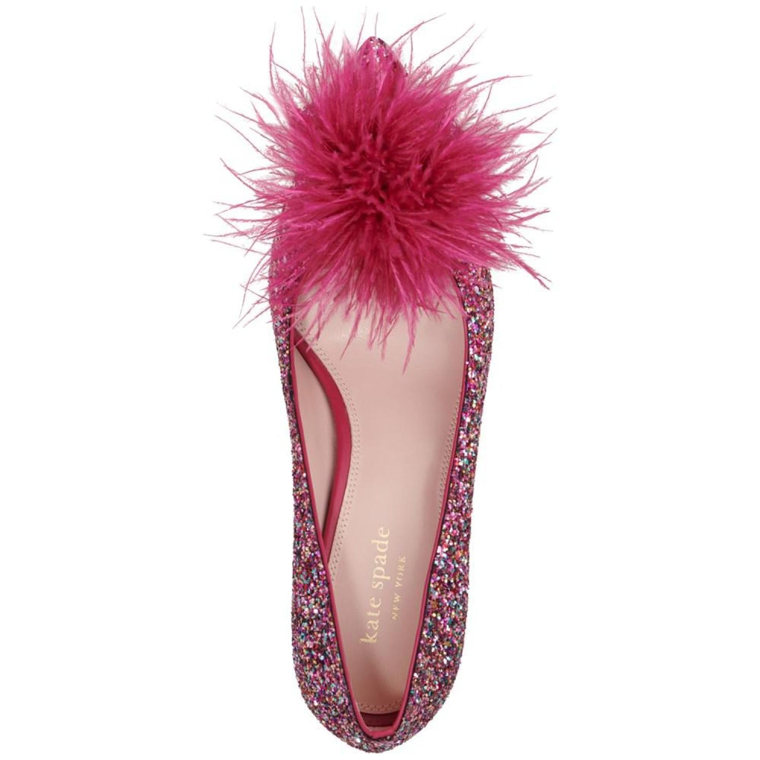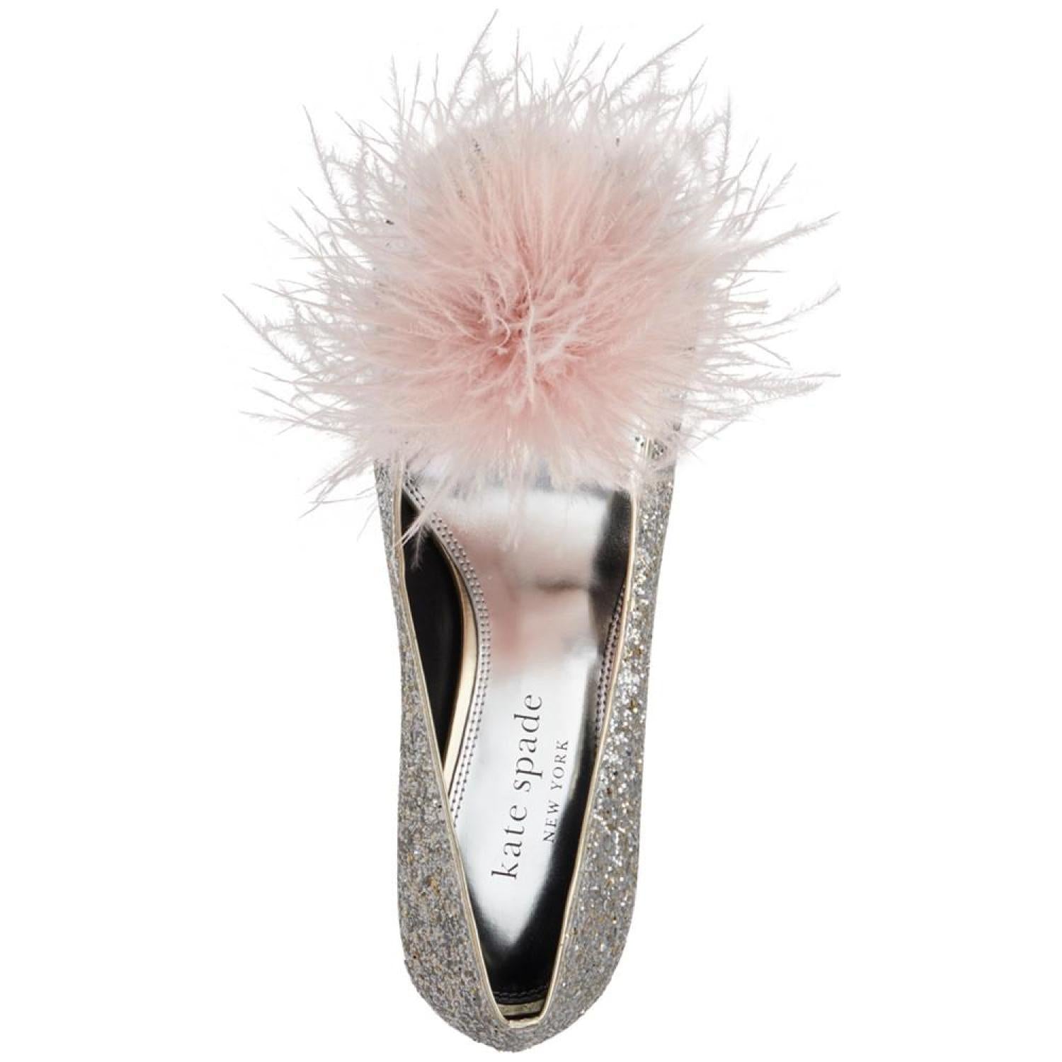 Fluffy feather pom poms combine with colorful glitter for a fun accent in the Marabou pumps from Kate Spade New York. 3-1/2" heel Pointed-toe slip-on pumps Feather pom pom detail at upper Manmade upper; leather lining; leather sole Imported