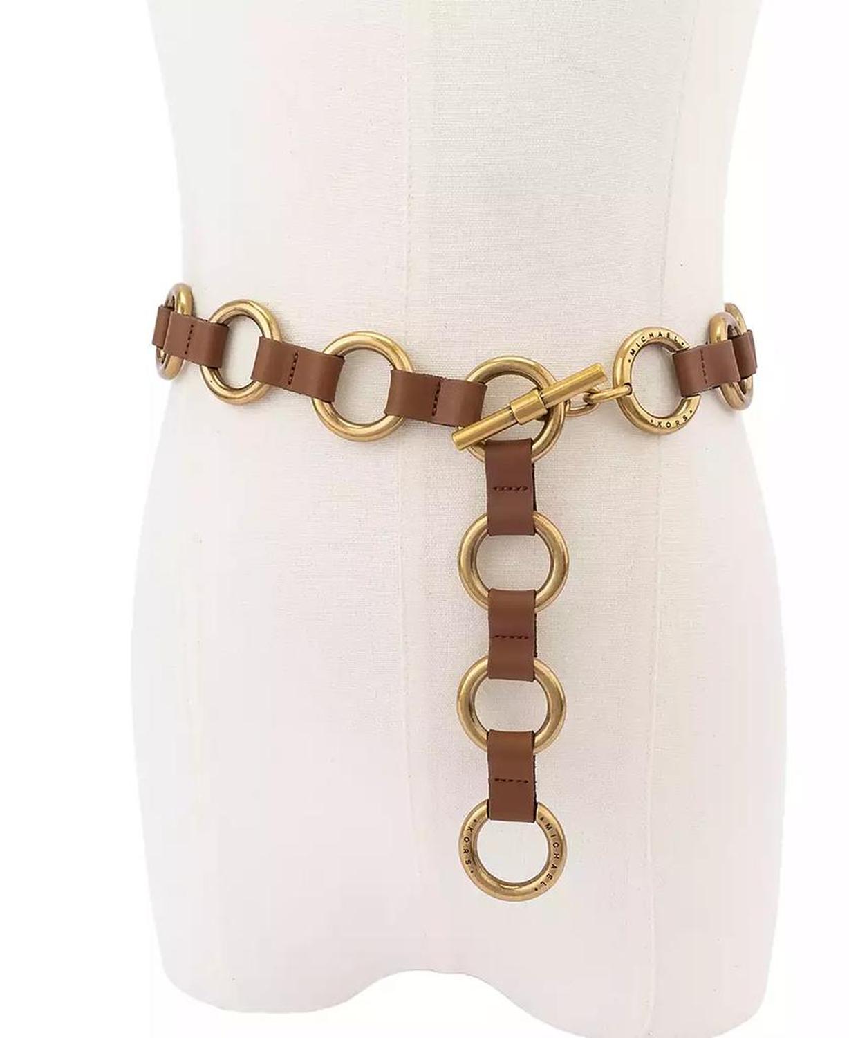 • The Marisa belt by Michael Kors will add a hint of bohemian flair to your look. Featuring a series of polished rings anchored by bold leather links, it's designed to sit low and gently hang at the hips. Let this eye-catching piece take center stage by pairing it with an understated knit dress.