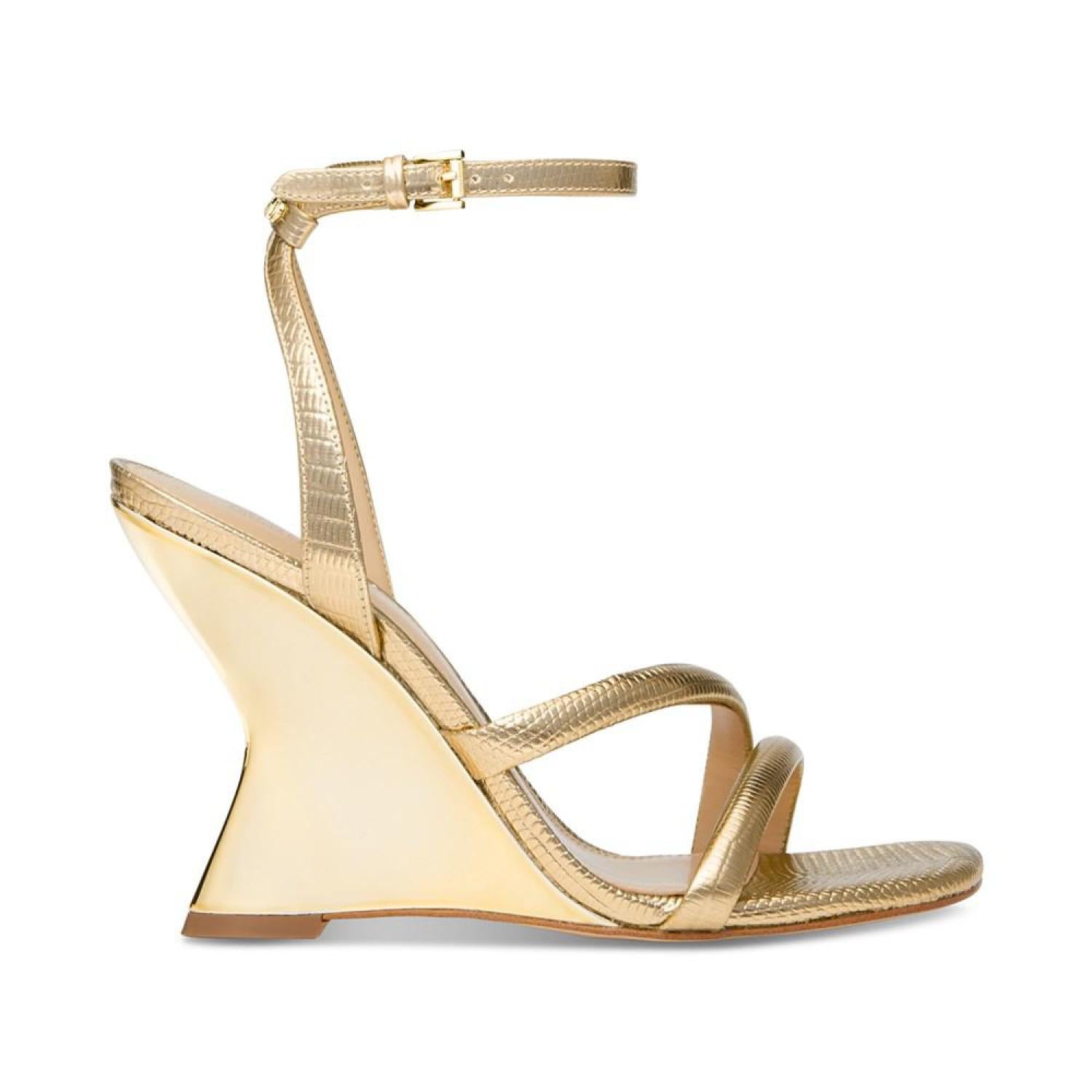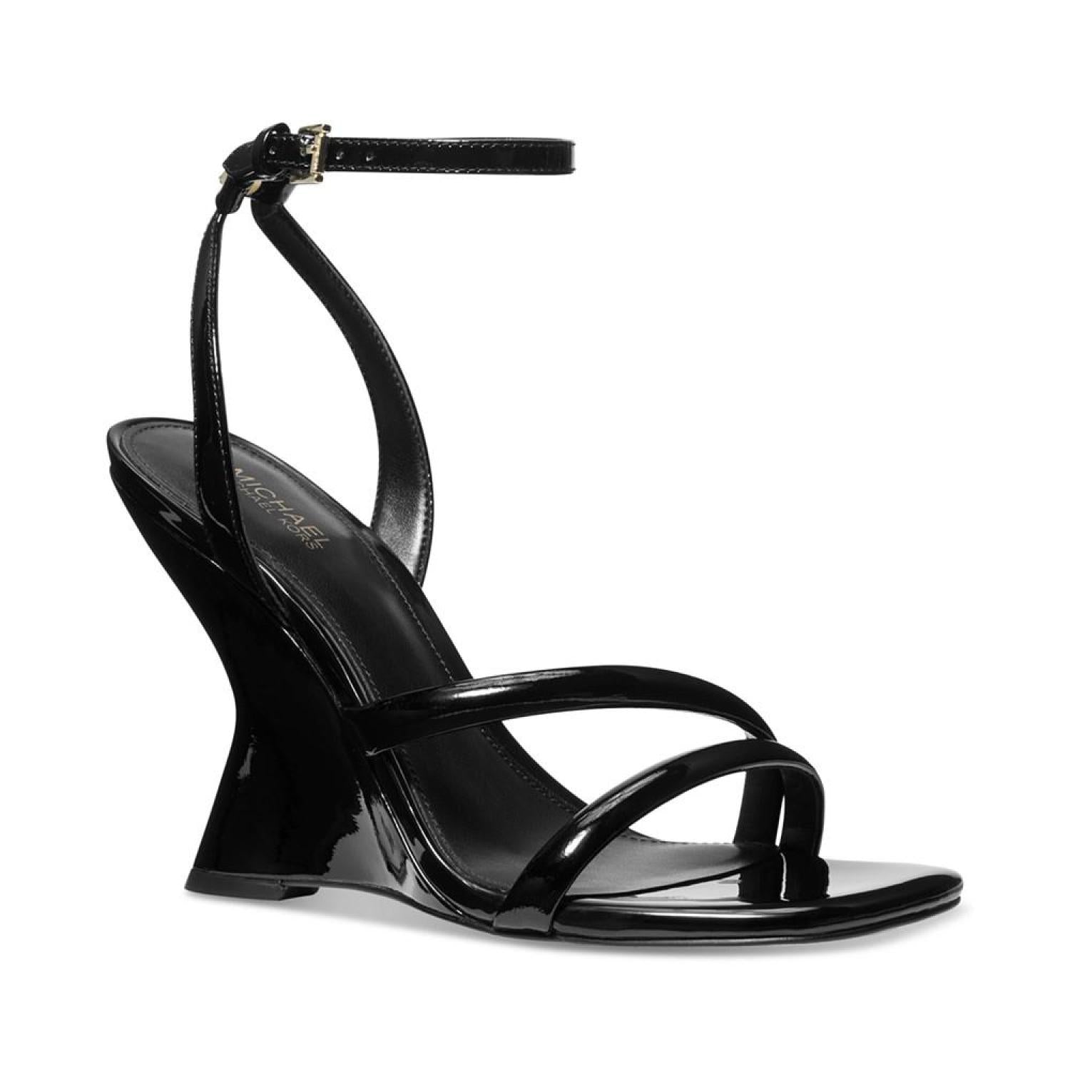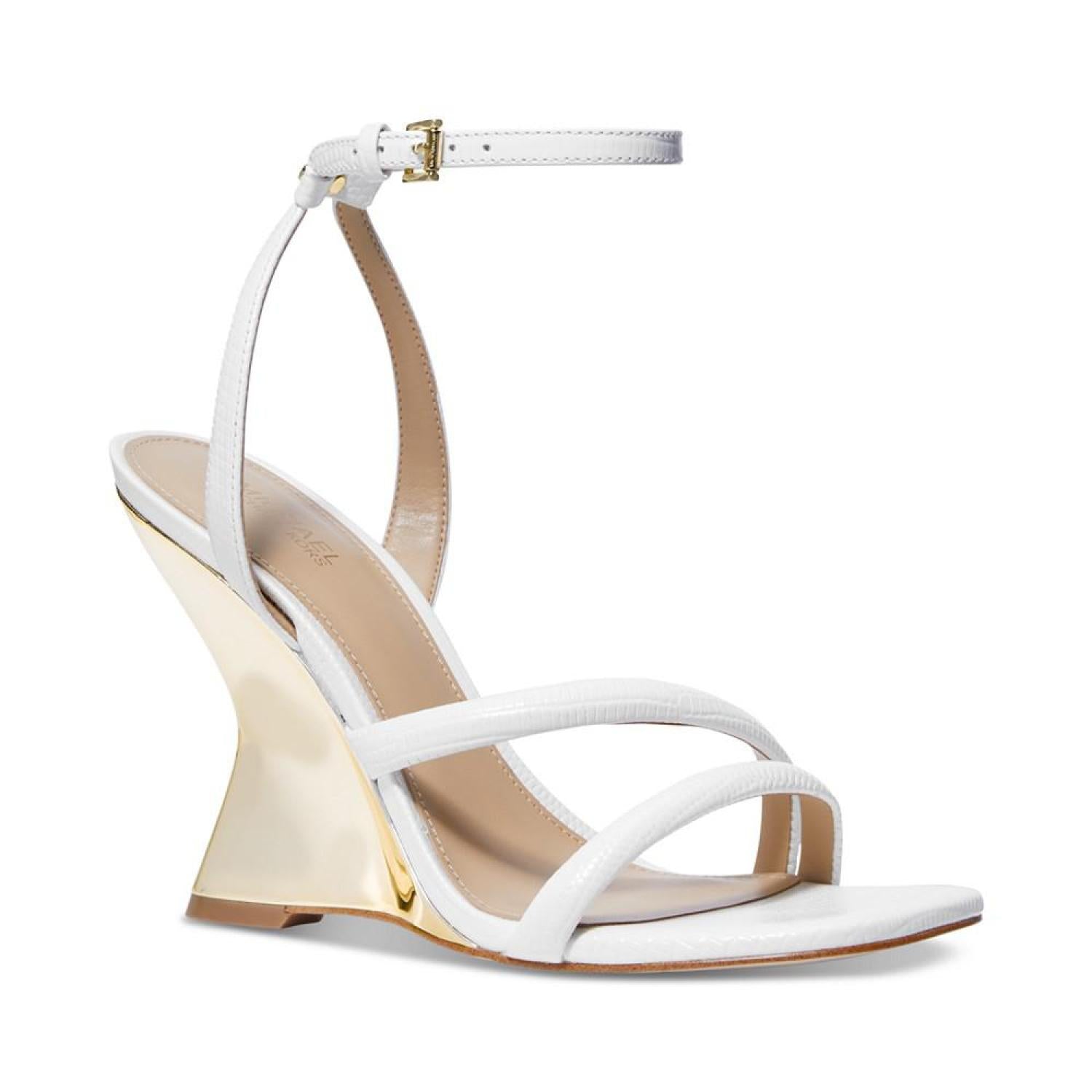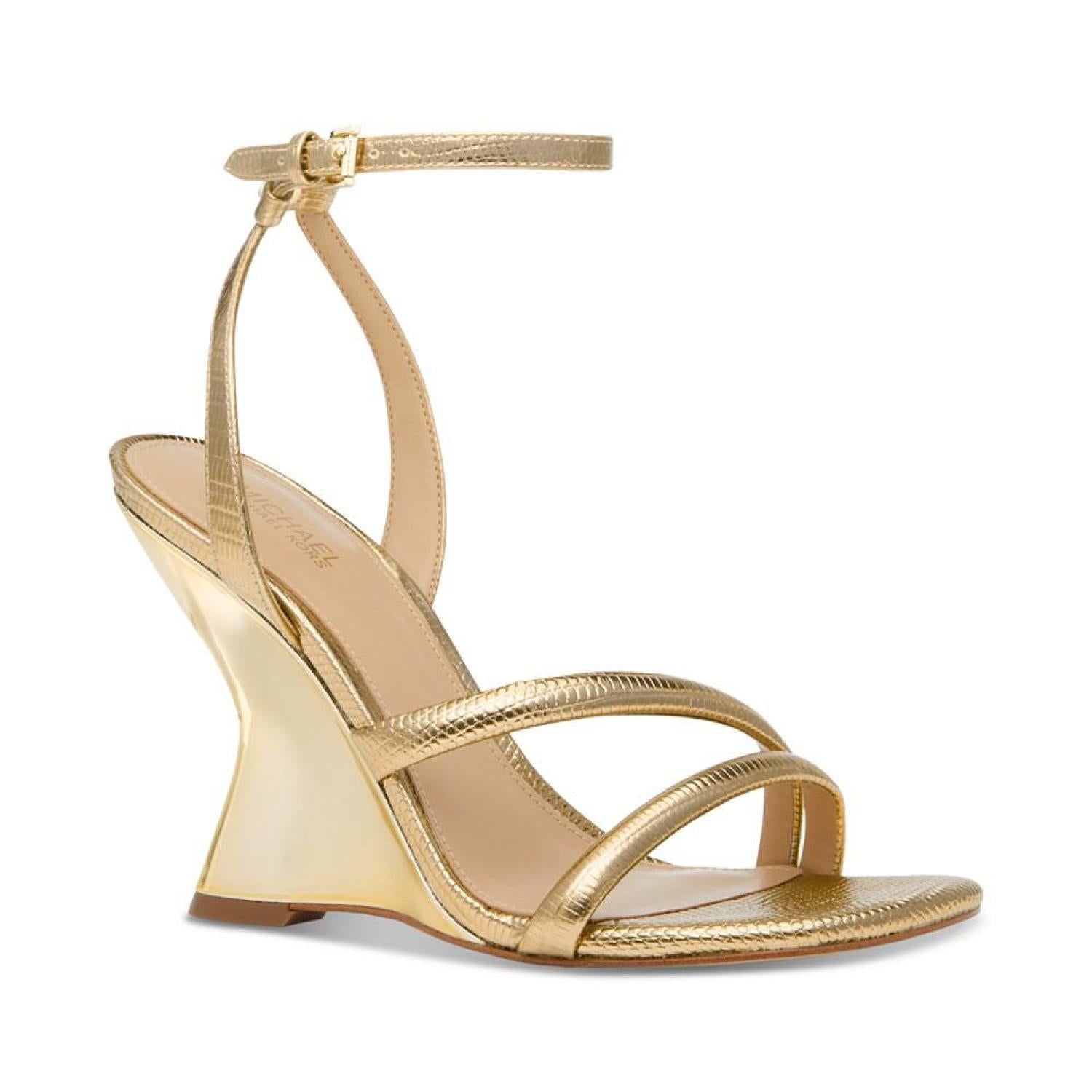 Polished straps and galvanized wedges elevate a gorgeous silhouette in the Nadina sandals by MICHAEL Michael Kors. 4" galvanized wedge heel Round toe Buckled ankle strap Leather upper; manmade lining; manmade sole Imported