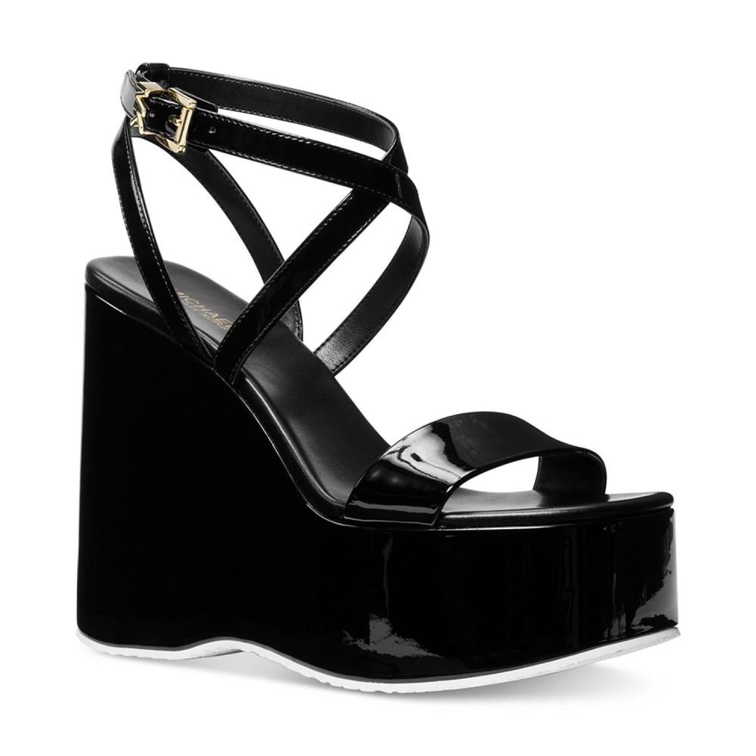 Crisscross ankle straps add elegant lines to bold wedges in the towering Paola sandals by MICHAEL Michael Kors. 5" wedge heel; 2" platform Round-toe crisscross ankle-strap platform wedge sandals with adjustable buckle closure Manmade or leather uppers; manmade lining; rubber sole Imported
