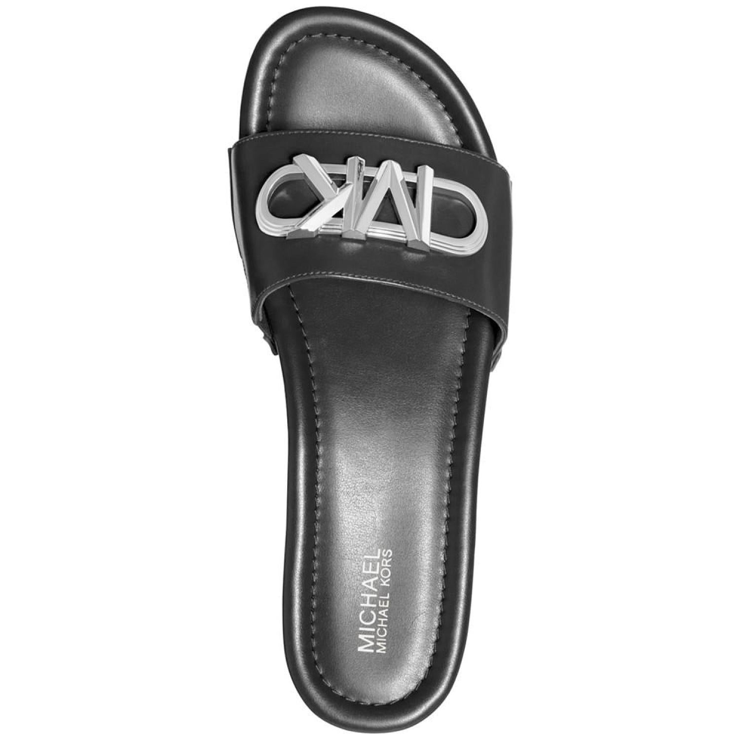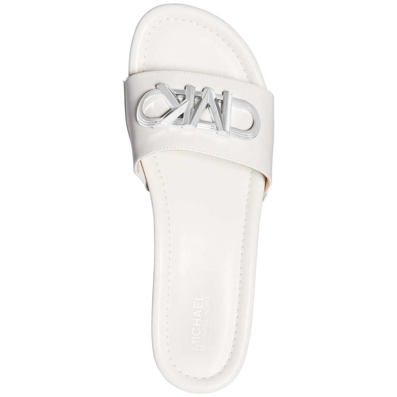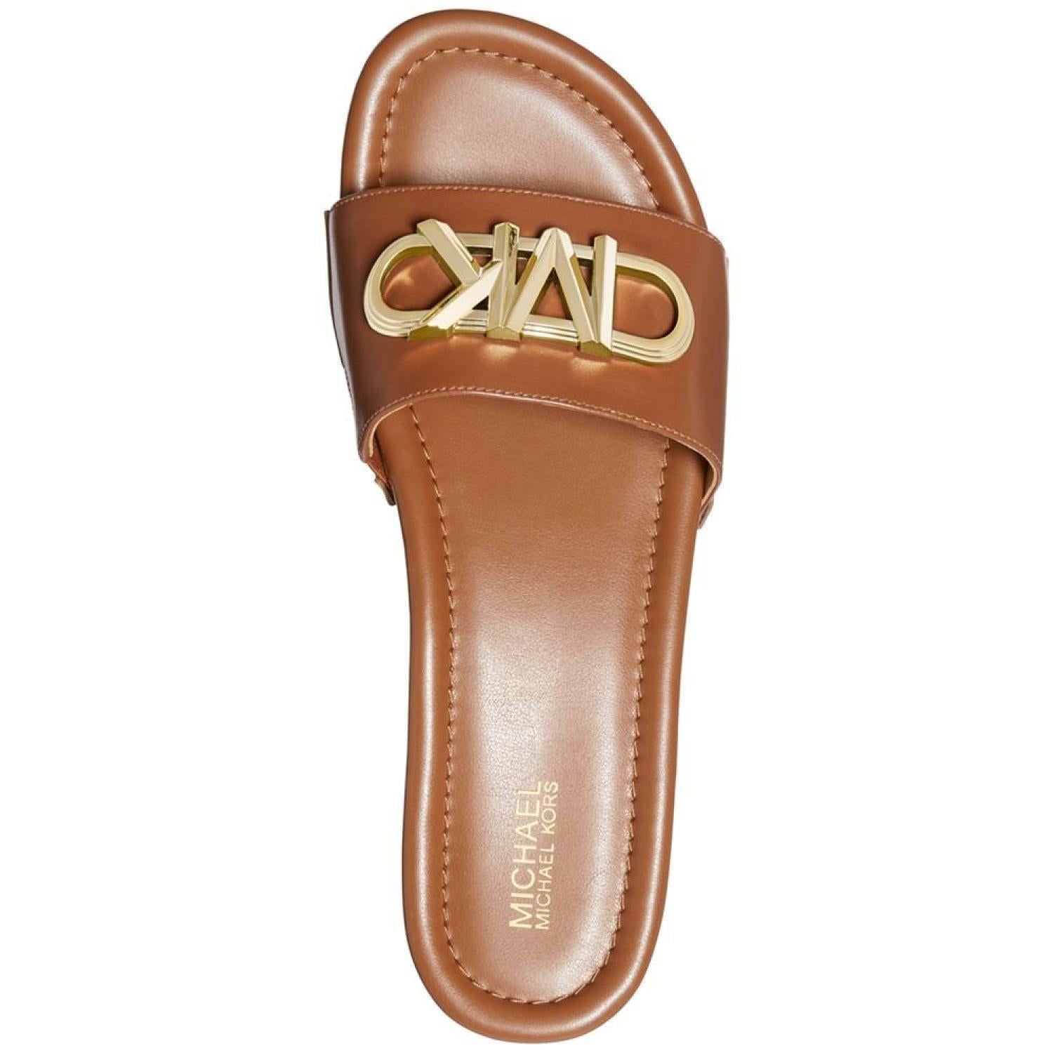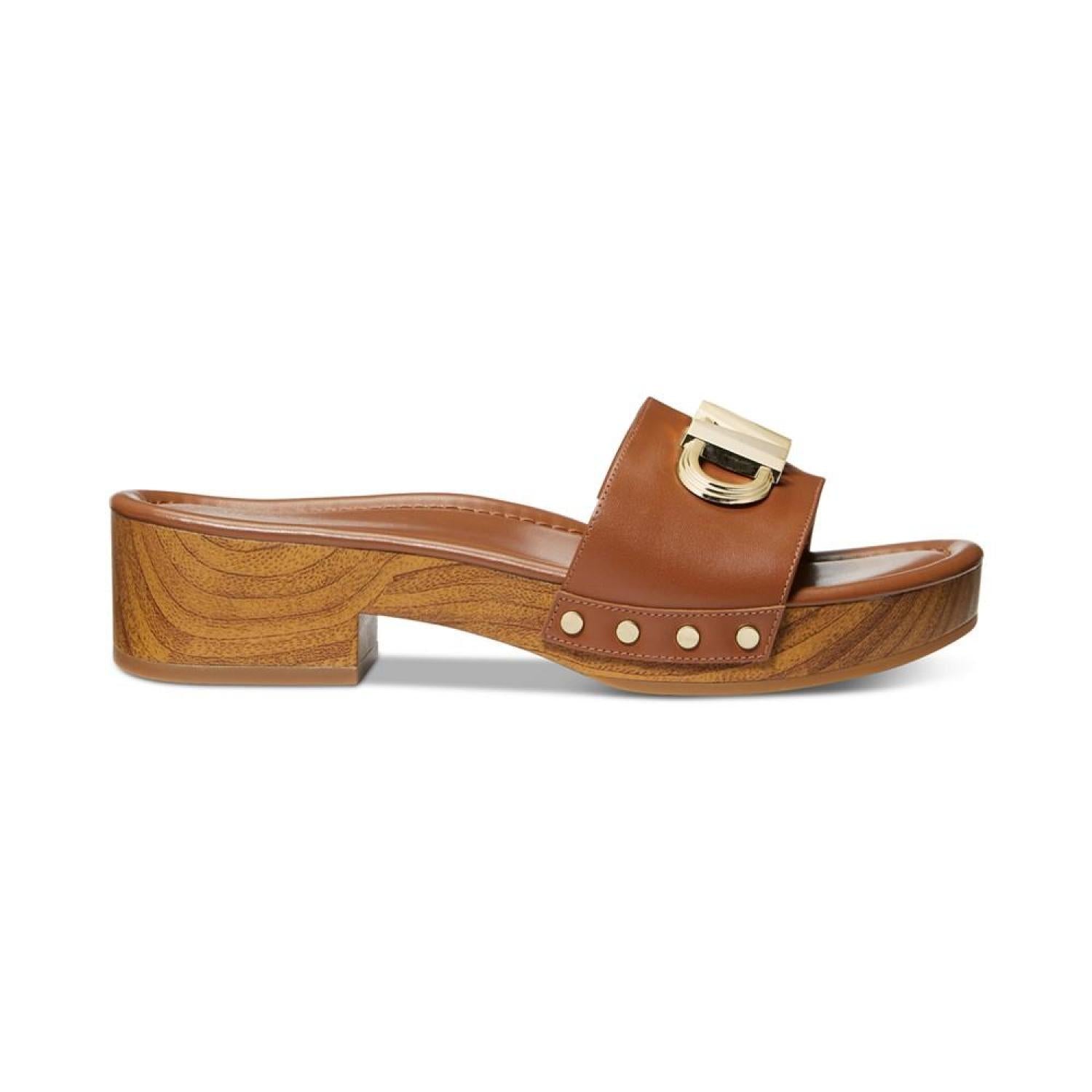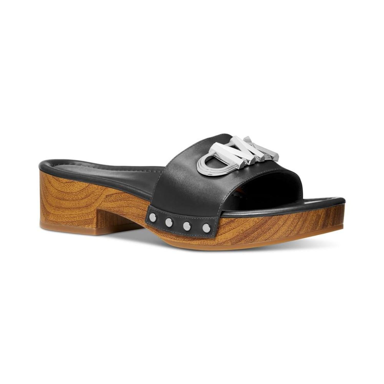 • Wooden platforms lend a retro-inspired boost to the gold-tone hardware and effortless slide design of the Parker sandals from MICHAEL Michael Kors.