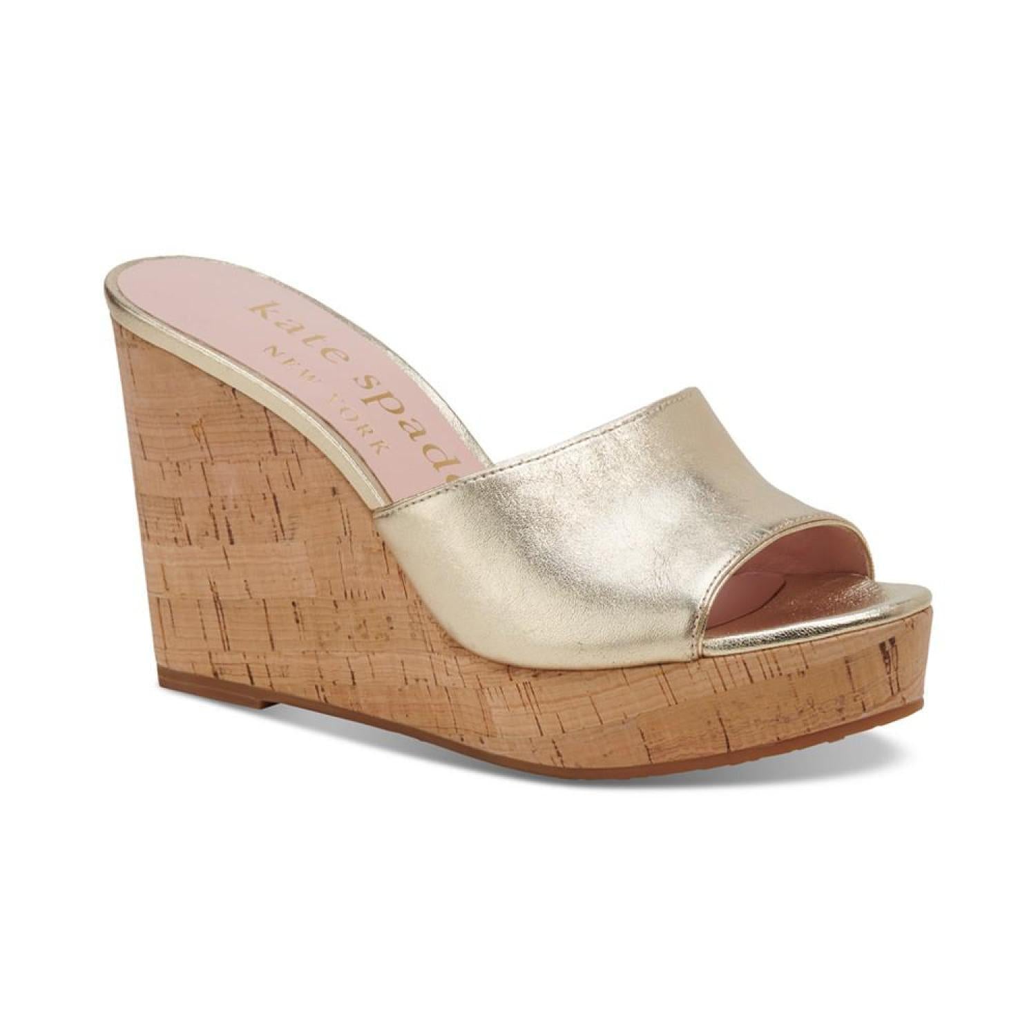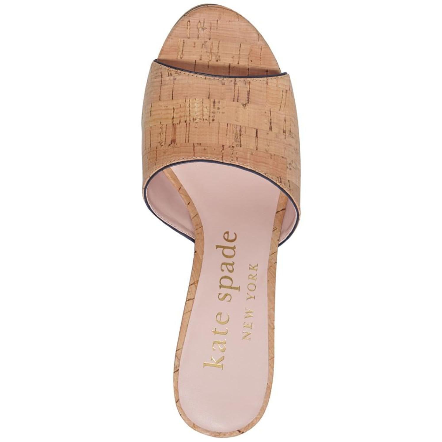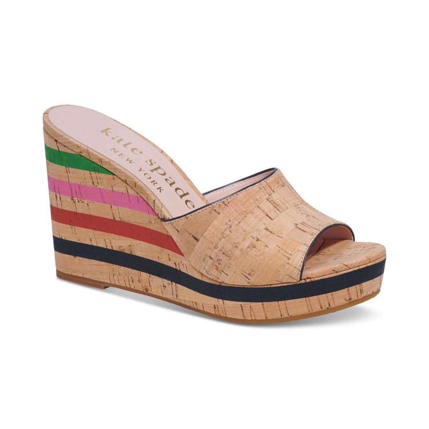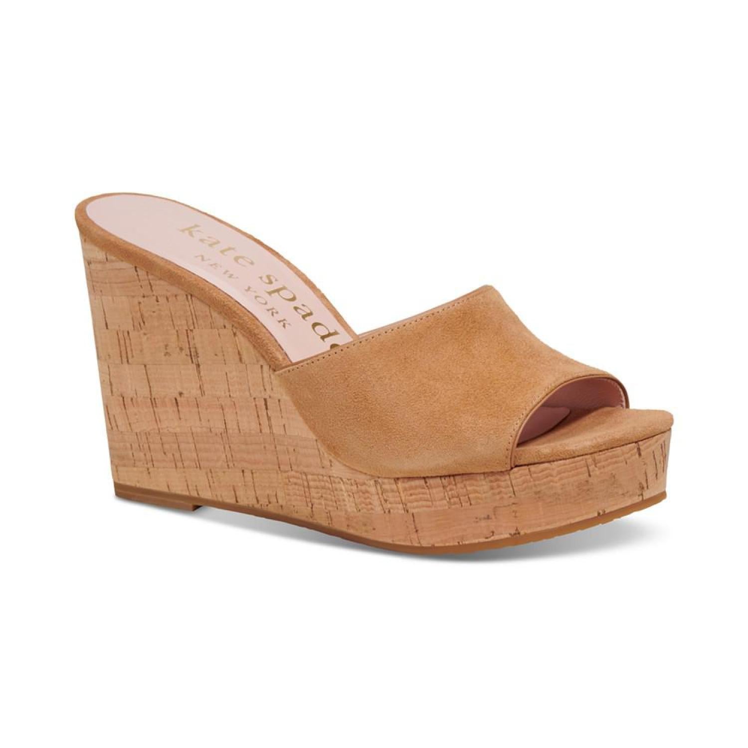 A single wide straps tops comfortable cork-like wedges in the stylish Penelope platform sandals from Kate Spade New York. 3-3/4" wedge heel; 1" platform Round-toe slip-on platform wedge sandals Leather or cork, leather uppers; leather lining; rubber sole Imported