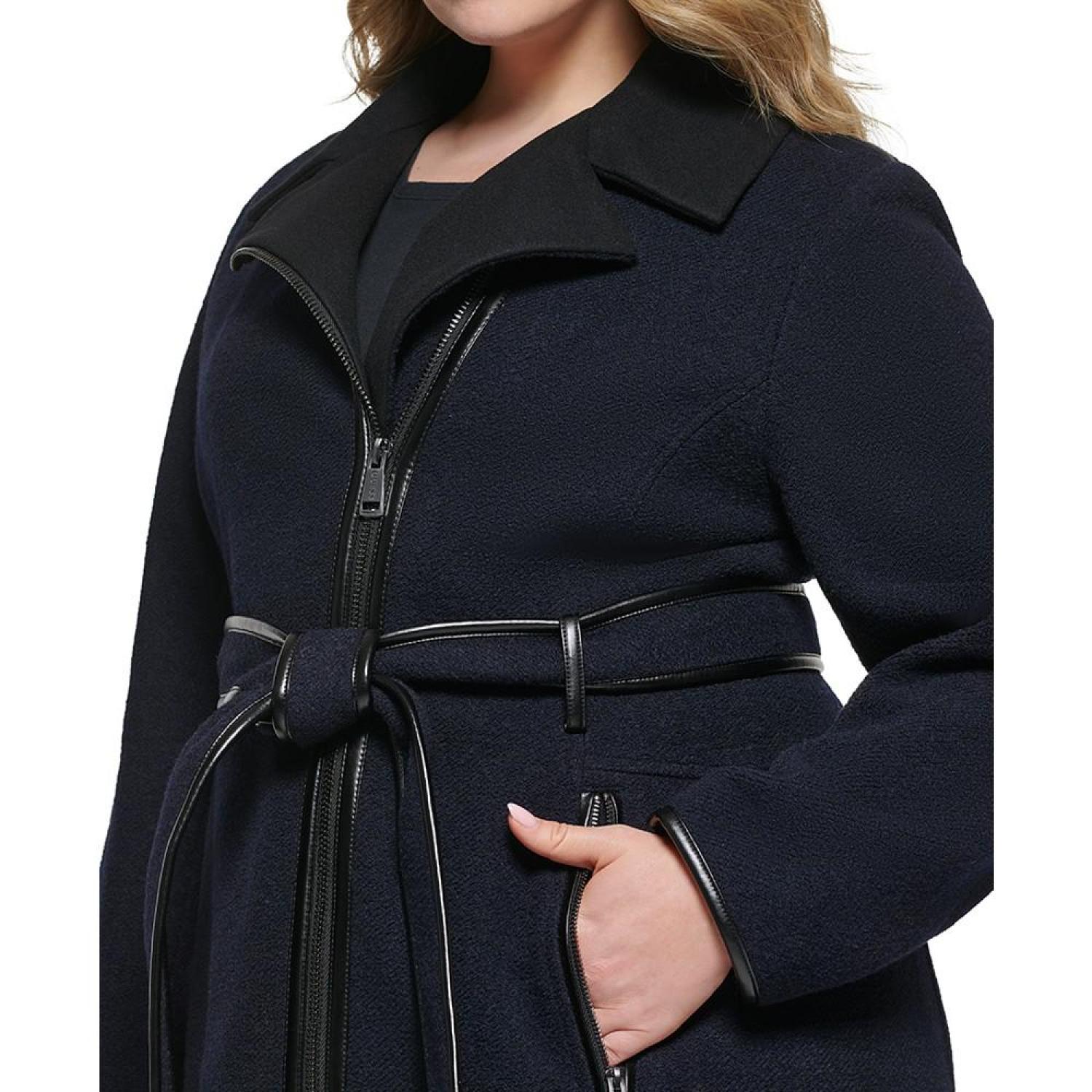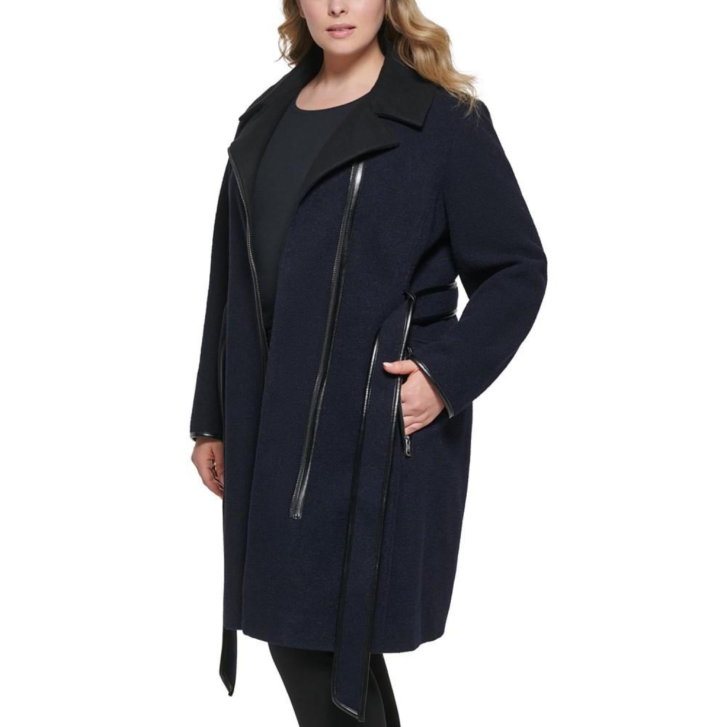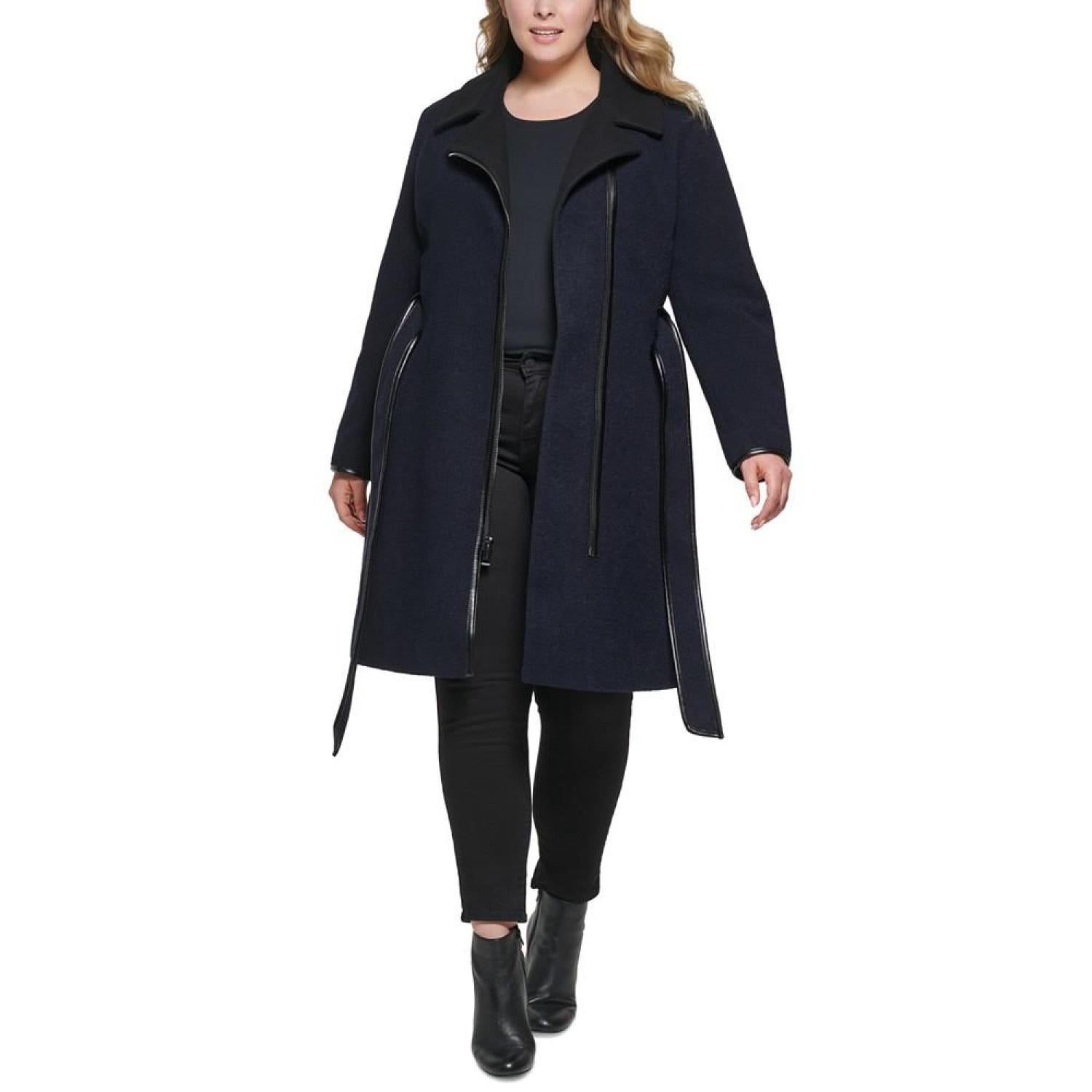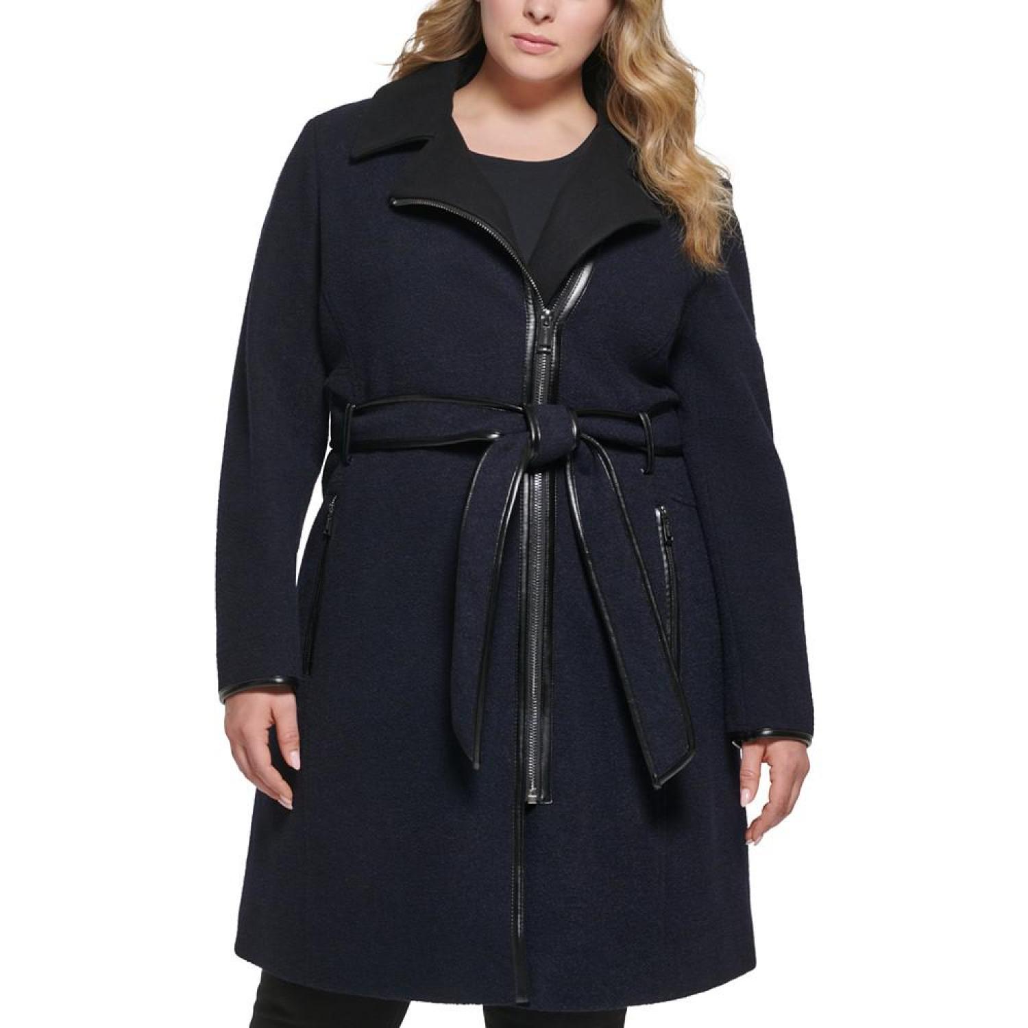Cozy up in this plus size coat from GUESS, polished with faux leather trims and finished with a self tie belt for definition. Model is wearing a size 1X Approx. 39" long from center back to hem Notch collar; zipper front closure Removable self tie belt; faux leather trim at edges Zippered pockets at hips Lined Shell 1: wool/polyester; shell 2: wool/polyester/rayon/cotton/other; lining: polyester; faux leather: polyurethane Dry clean Imported