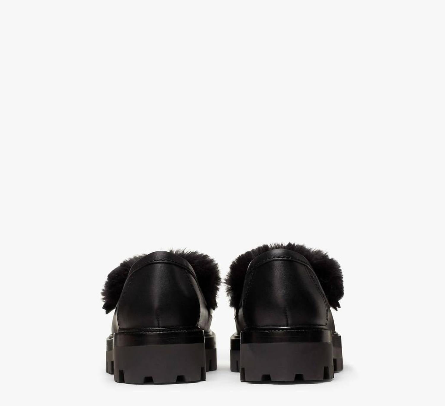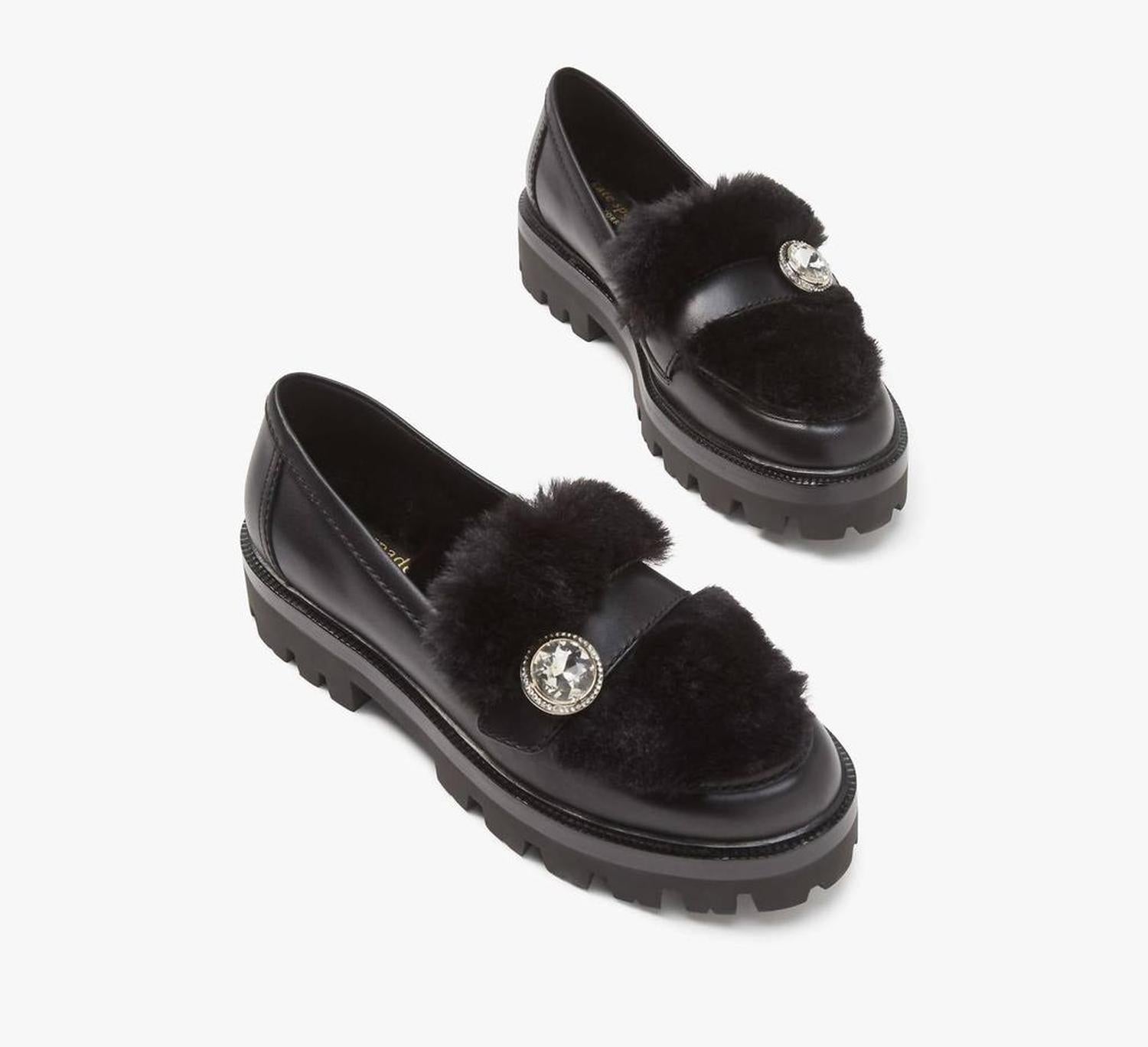 • A preppy yet feminine take on the classic loafer.Experience luxurious sophistication with Kate Spade's Women's Posh Winter Fur Loafers, perfect for travel and spring occasions. These black loafers showcase a minimalist design with a beautiful jewel detail at the vamp and are crafted from premium leather with a cozy faux fur accent. With a slip-on style, round toe, and a low 0.5" stacked block heel, these flats are both stylish and comfortable. The lining is made of 100% sheep leather, and they are imported for superior craftsmanship.