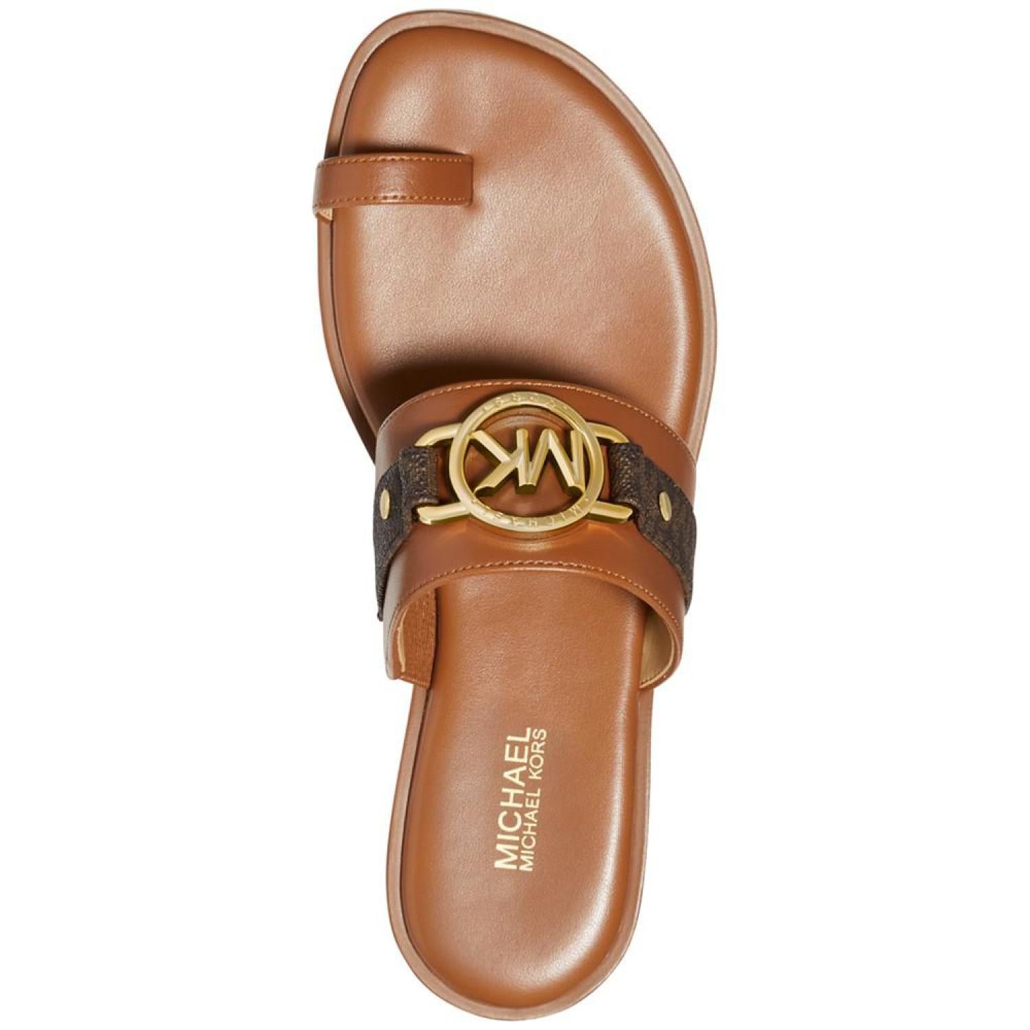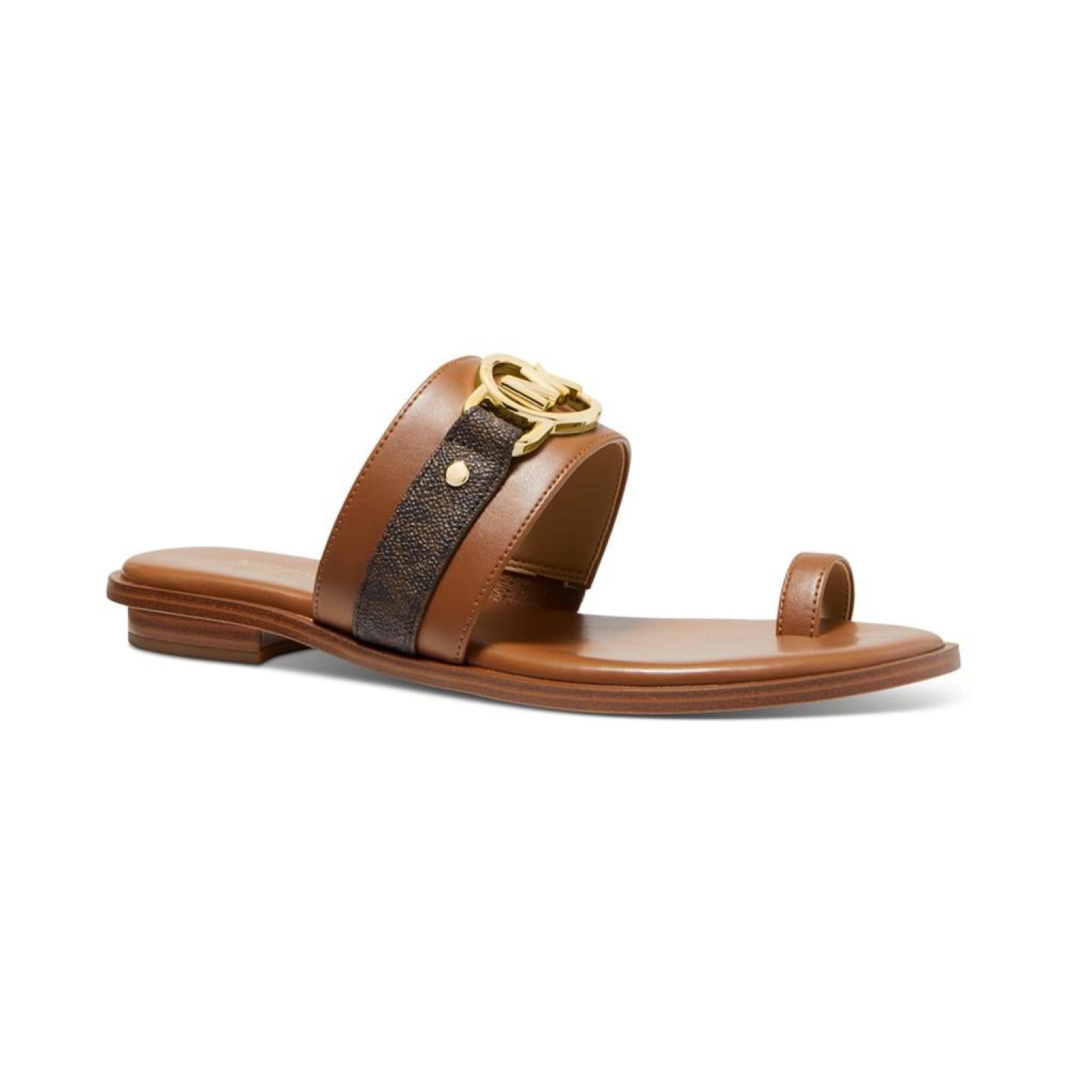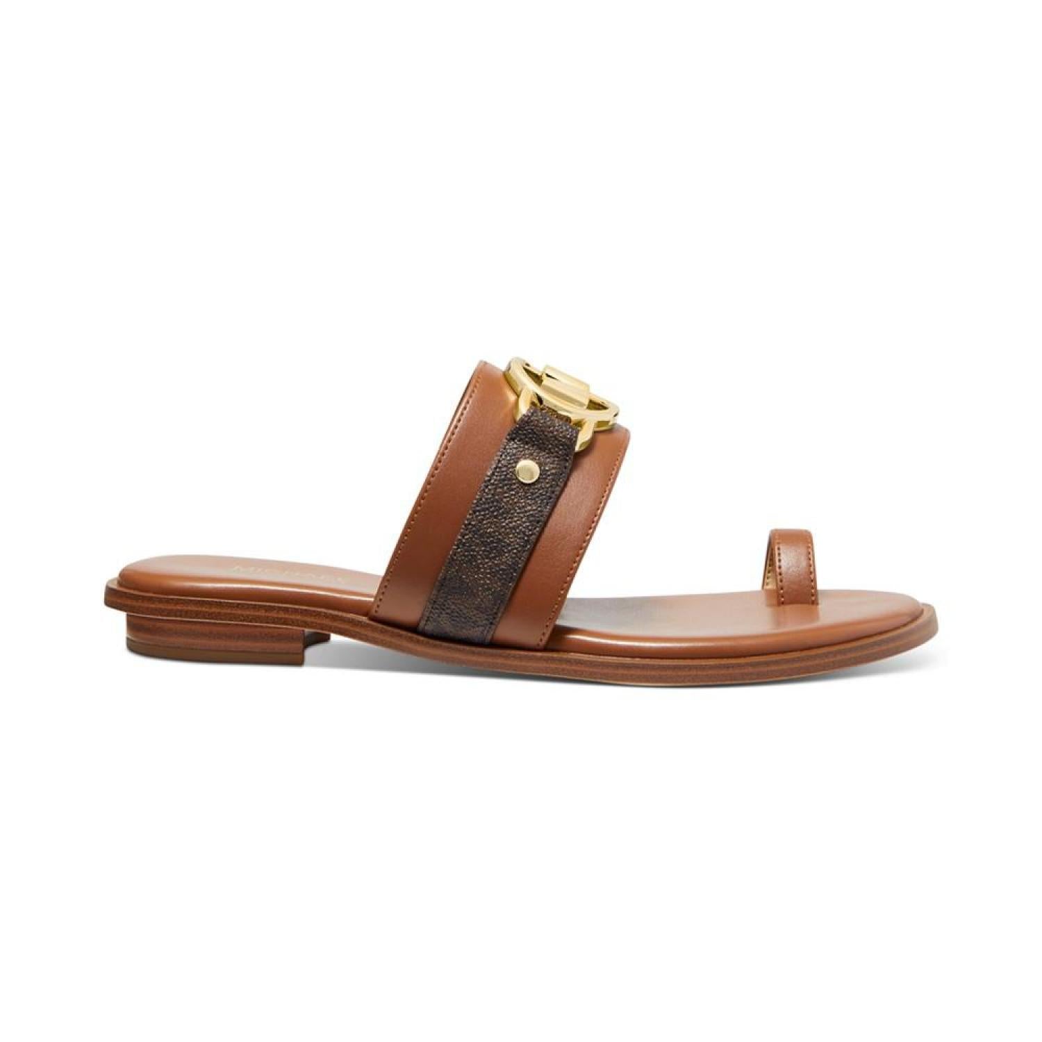 • Gold-tone hardware adds inspired metallic flash to the subtle slip-on silhouette of the Rory toe-ring sandals from MICHAEL Michael Kors.